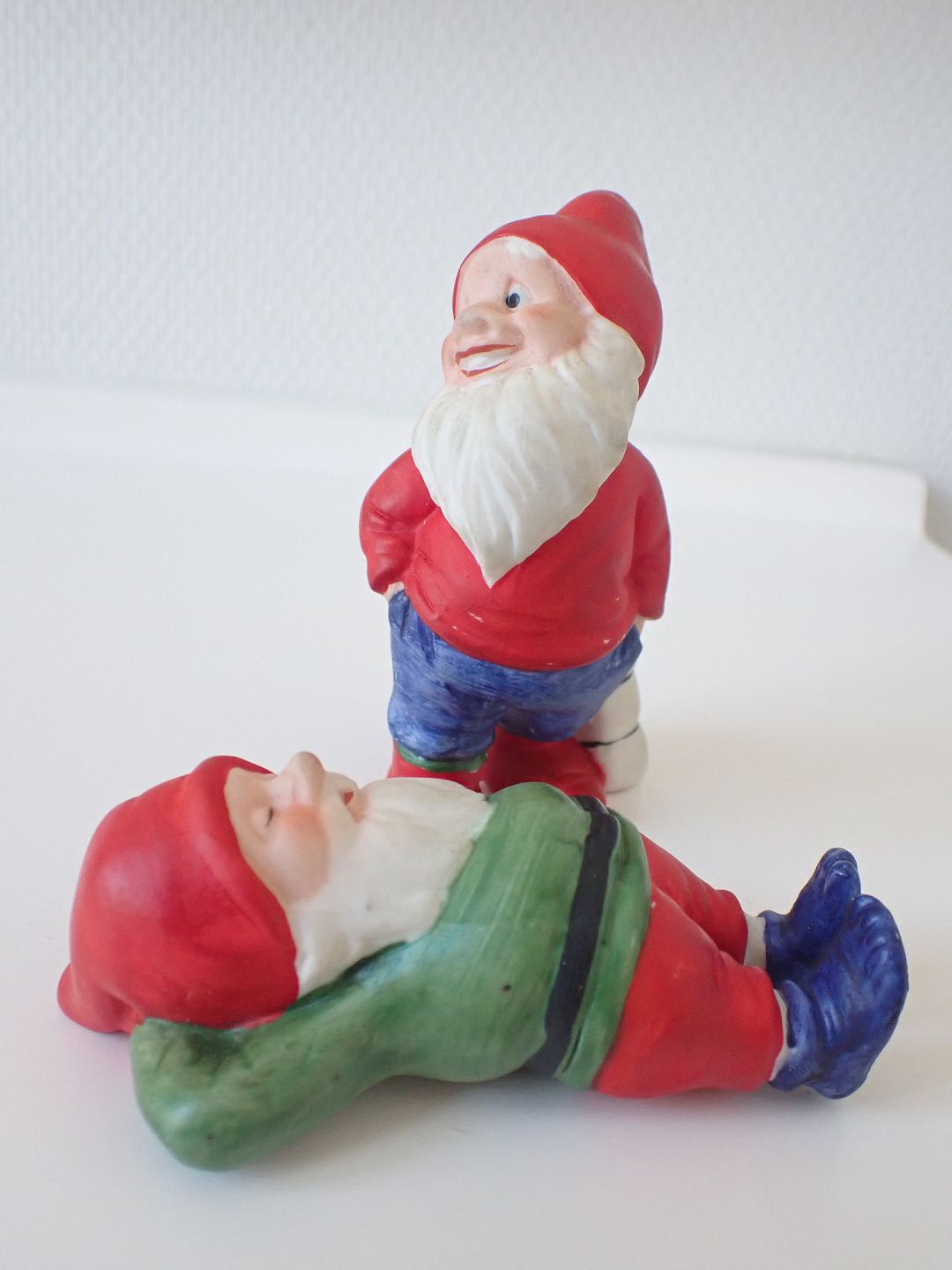 2 store håndmalede biscuitnisser, formentlig tyske. En ligger og sover og en står med en pakke. Fra 1970-erne. Højde: 10 cm. I fin stand. Sælges individuelt for 275 kr. pr. stk. Händler