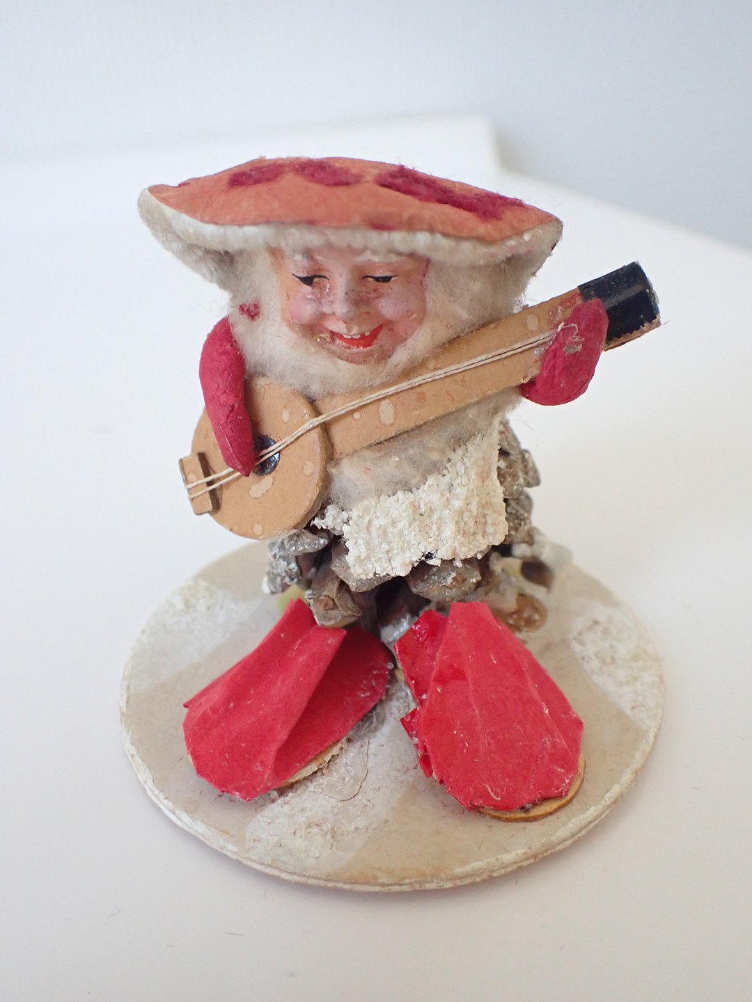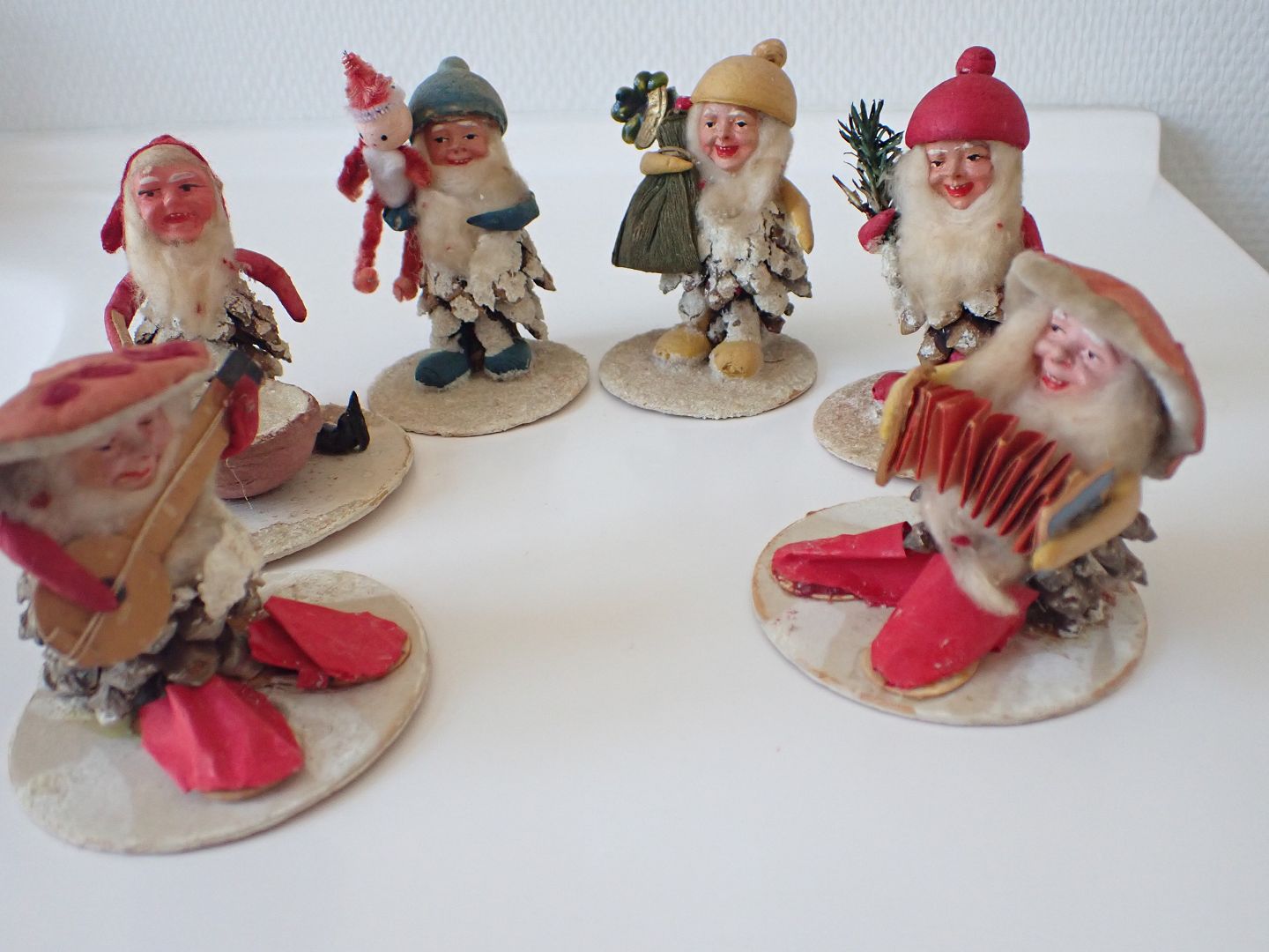 5 koglenisser med henholdsvis grangren, risengrød, piberensernisse, gavesæk, banjo og harmonika. Håndmalede, danske ca. 1930. Højde: 6,5 - 7,5 cm. I pæn tidstypisk stand. Händler