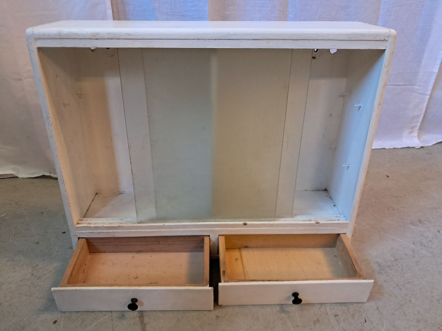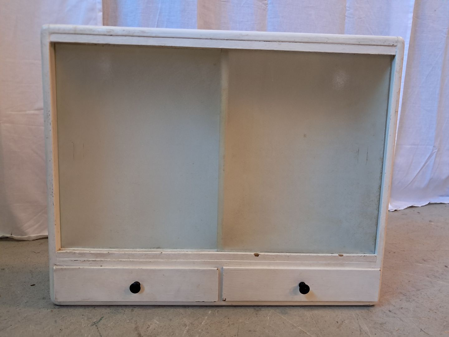 Lille malet skab med frostet glaslåger, fra 1950erne.Det trænger til at blive peppet op, og der medfølger ikke hylder.