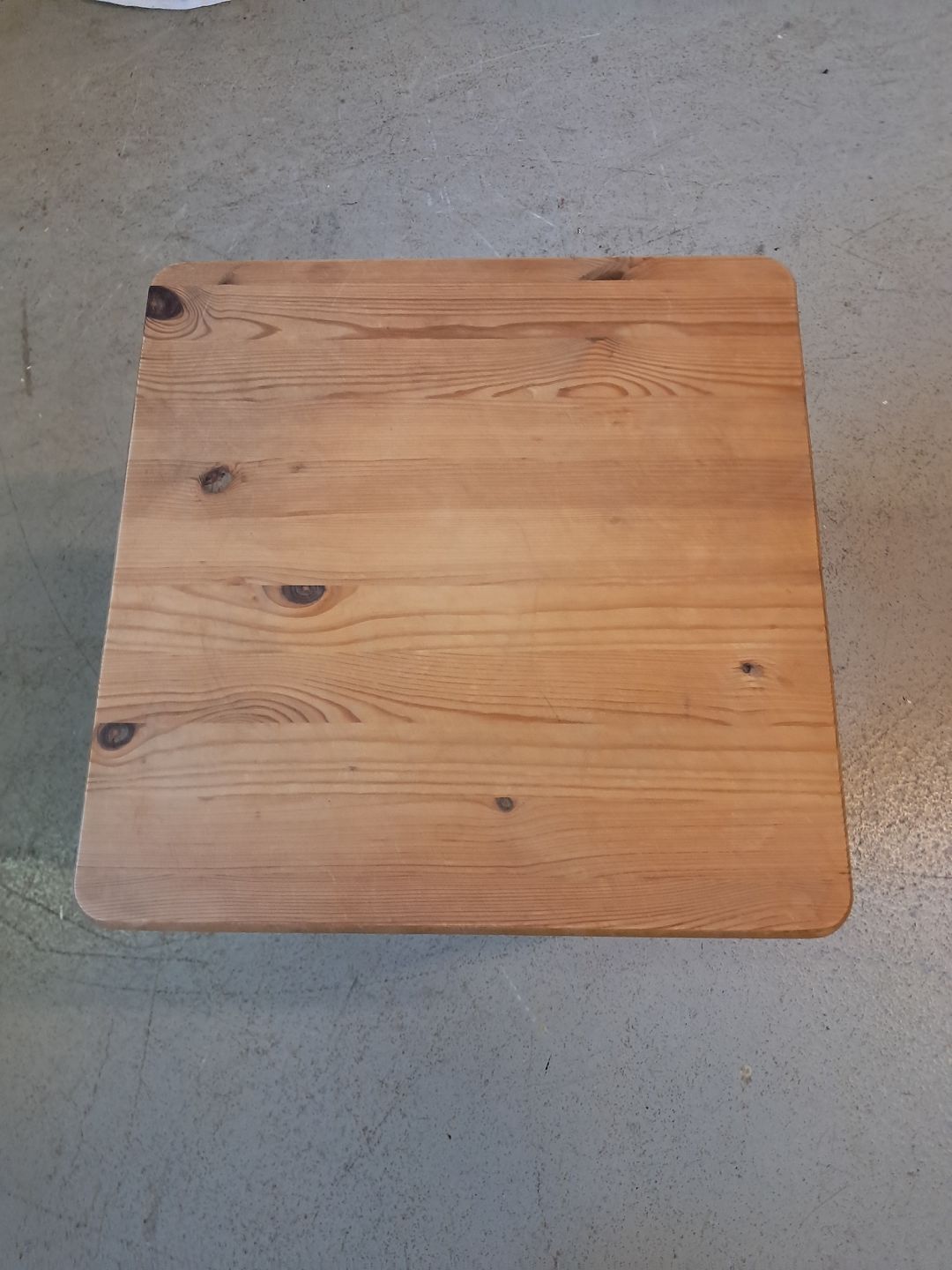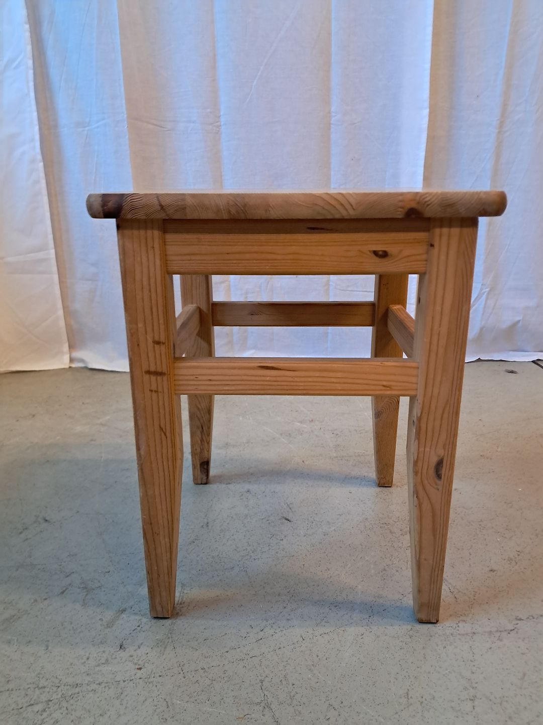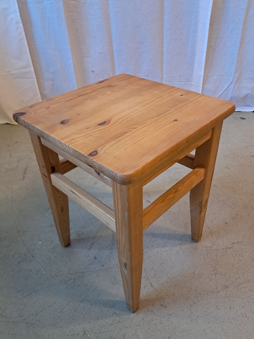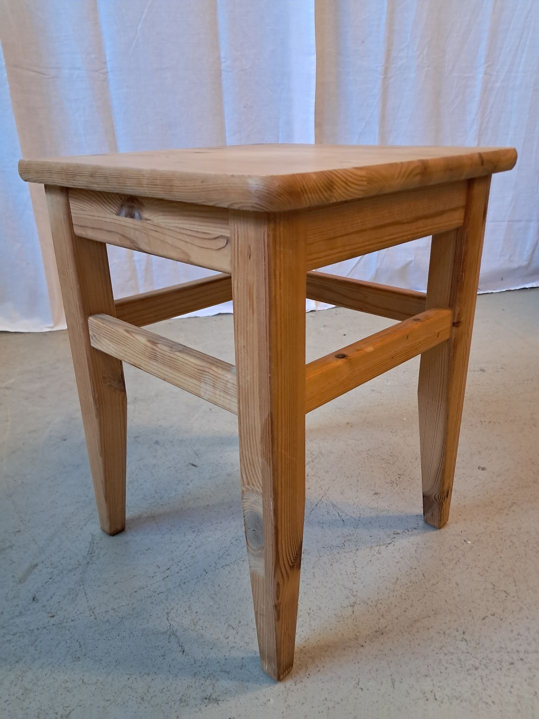 Taburet i massivt fyrretræ, fra 1990erne.Den har brugsspor.