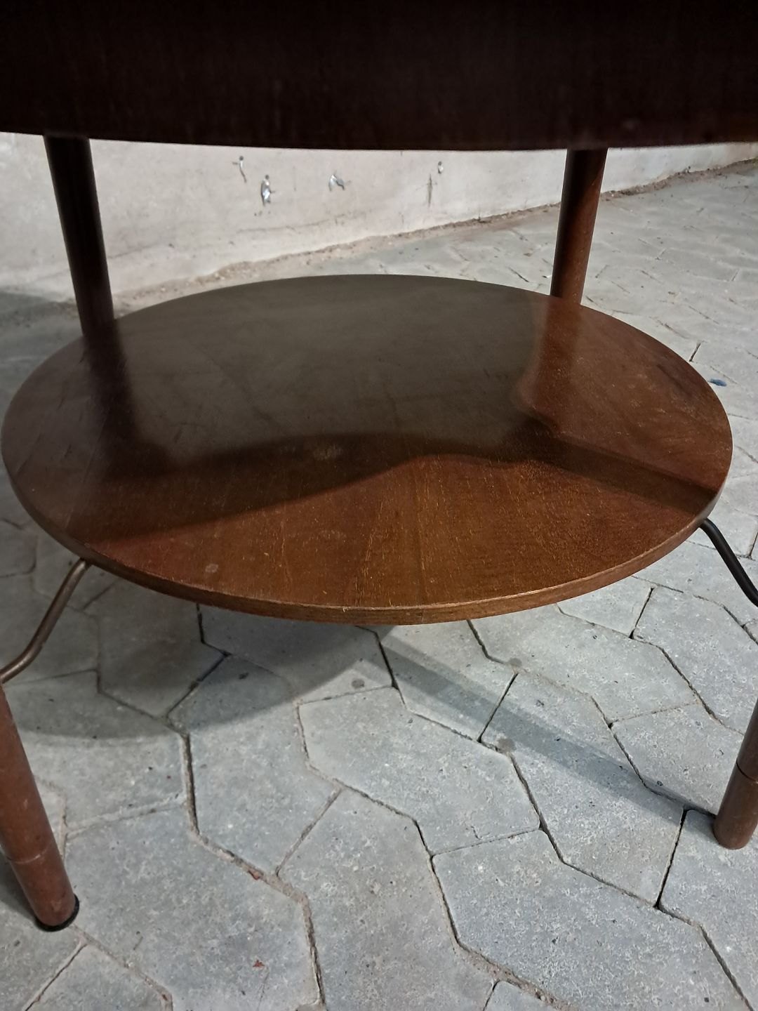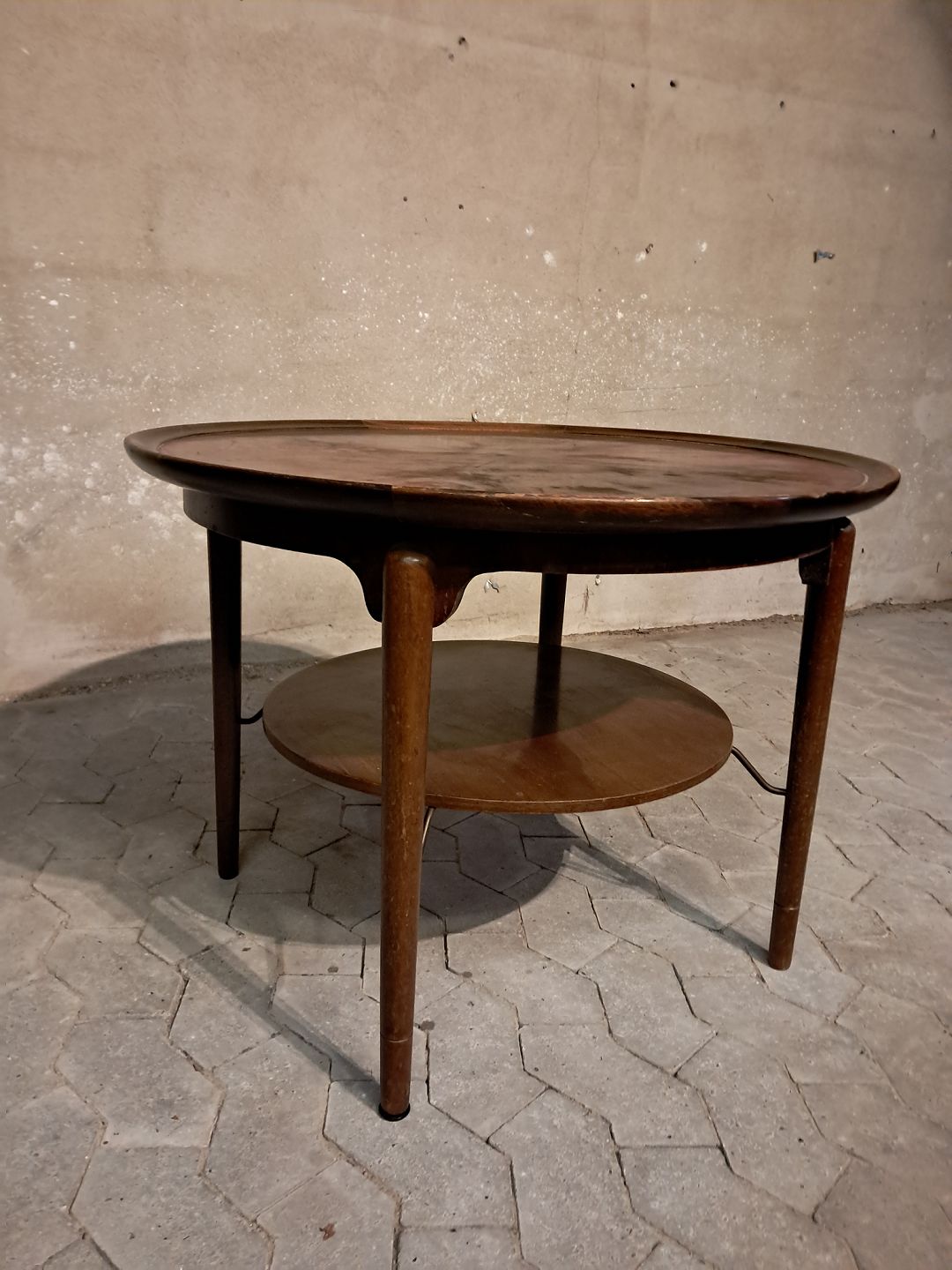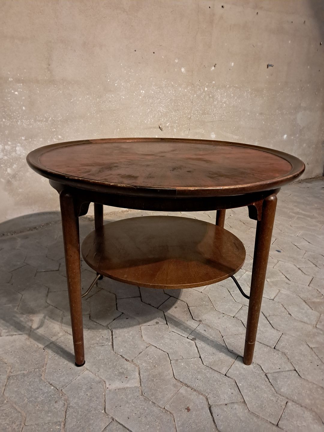Rundt sofabord i fineret nødetræ, fra 1950erne.Det har brugsspor.