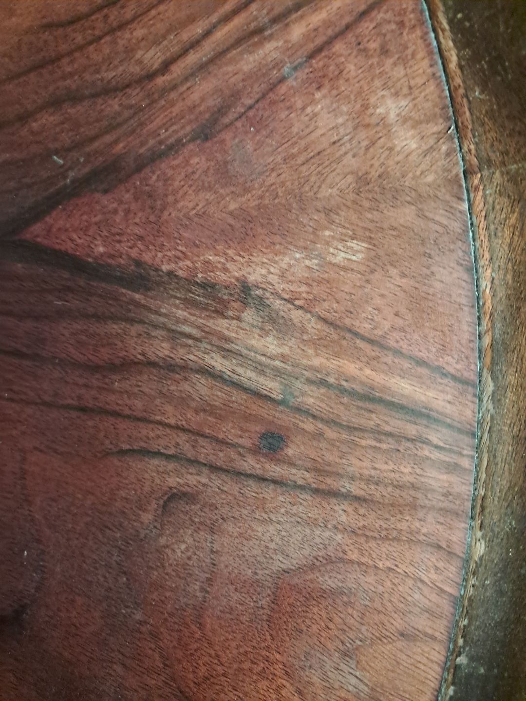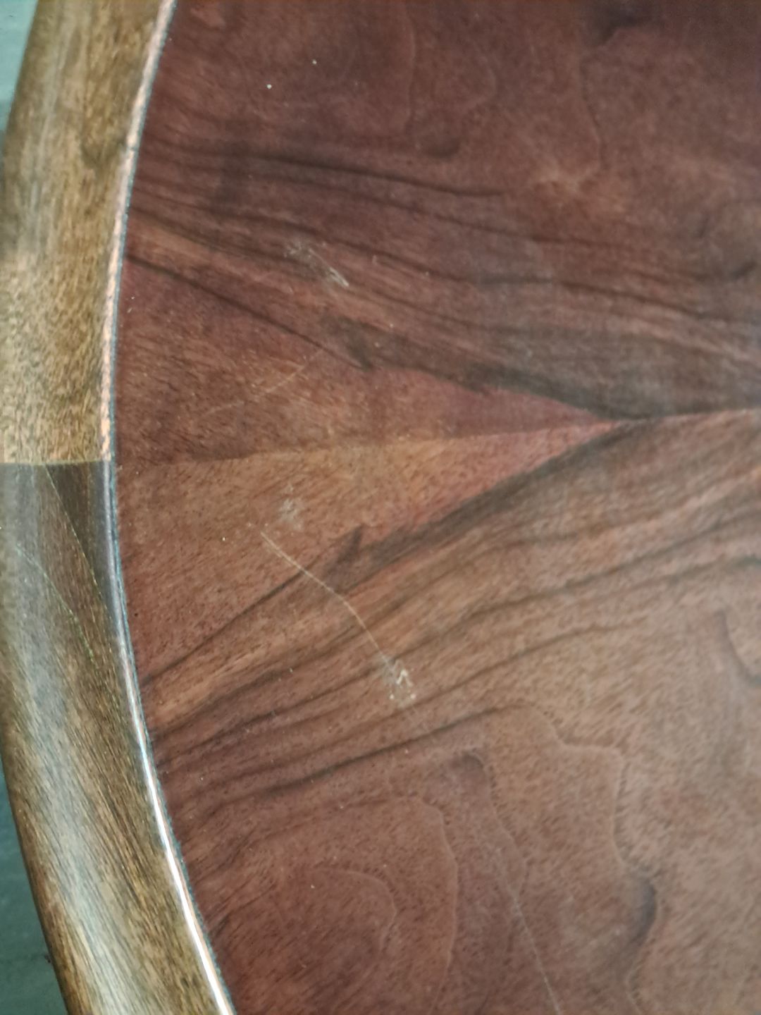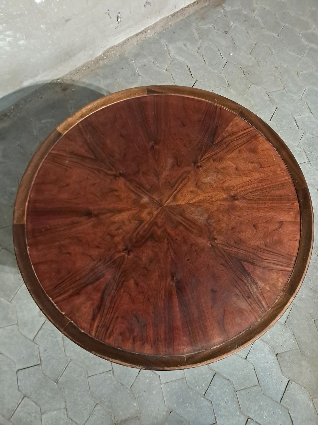 Rundt sofabord i fineret nødetræ, fra 1950erne.Det har brugsspor.