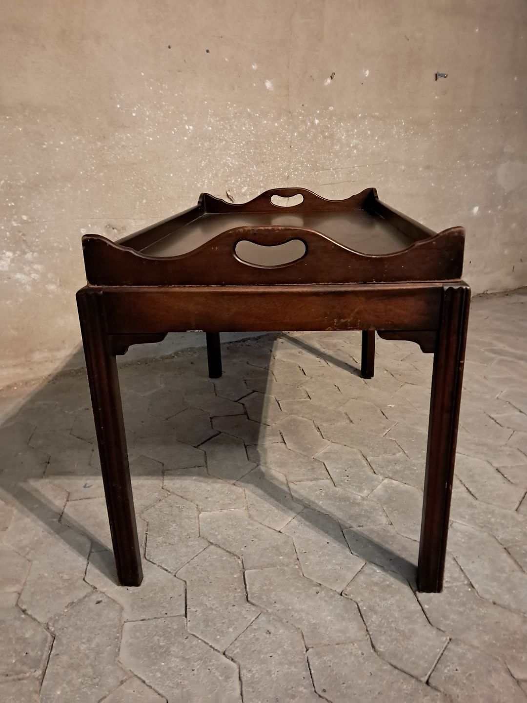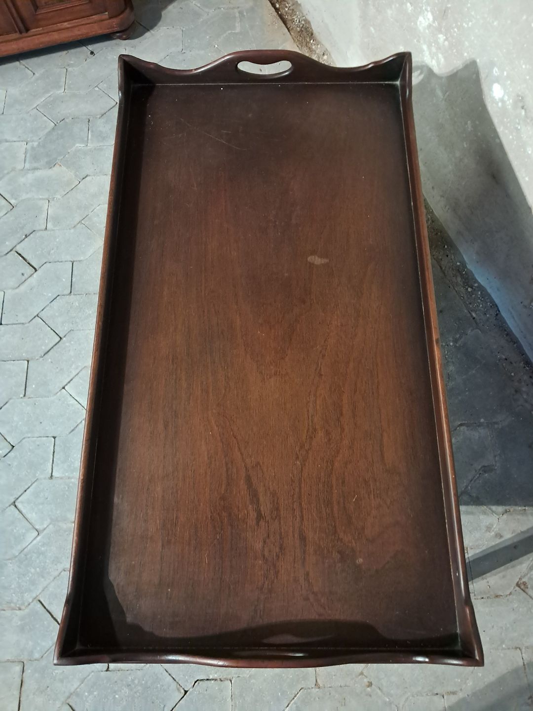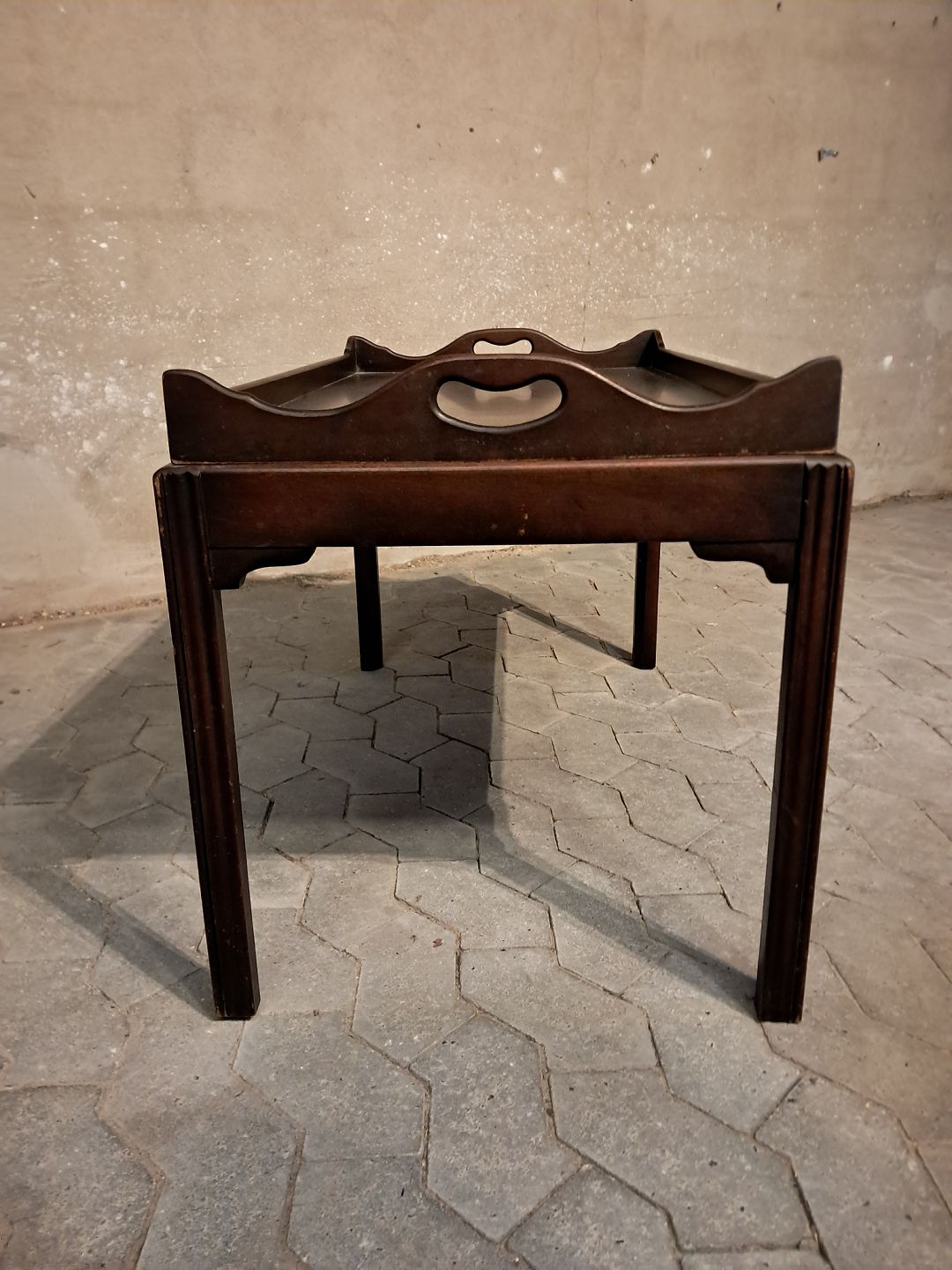Bakkebord i fineret mahogni, fra 1980erne.Det har brugsspor.