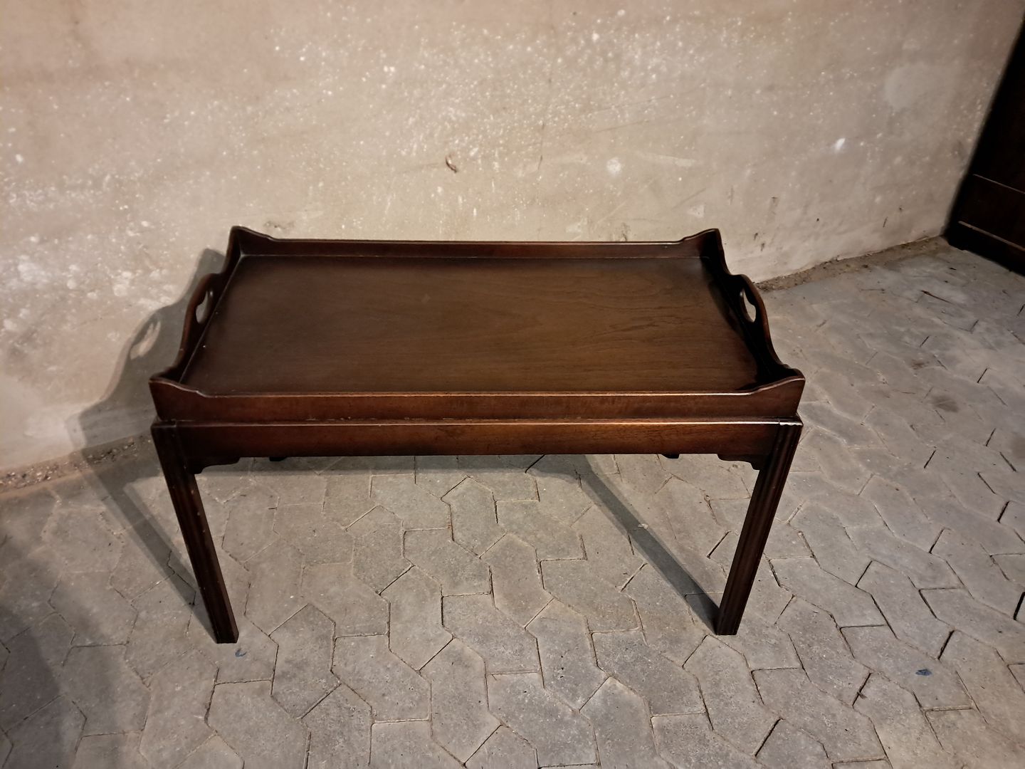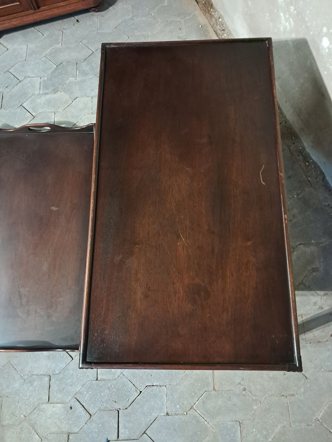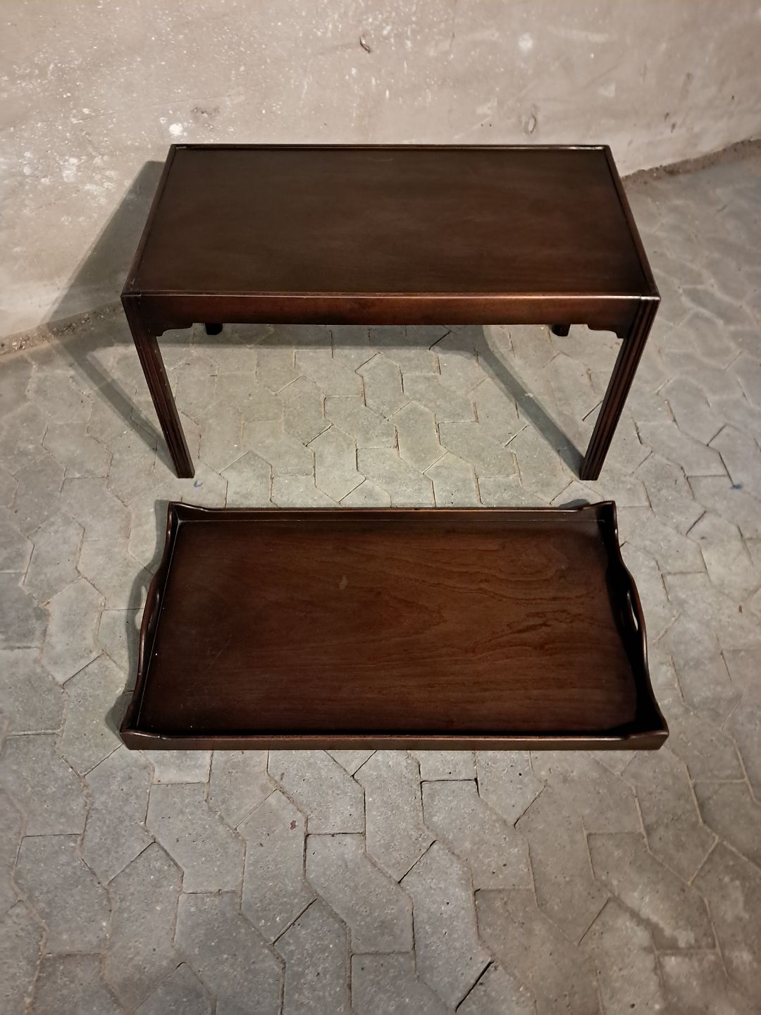 Bakkebord i fineret mahogni, fra 1980erne.Det har brugsspor.