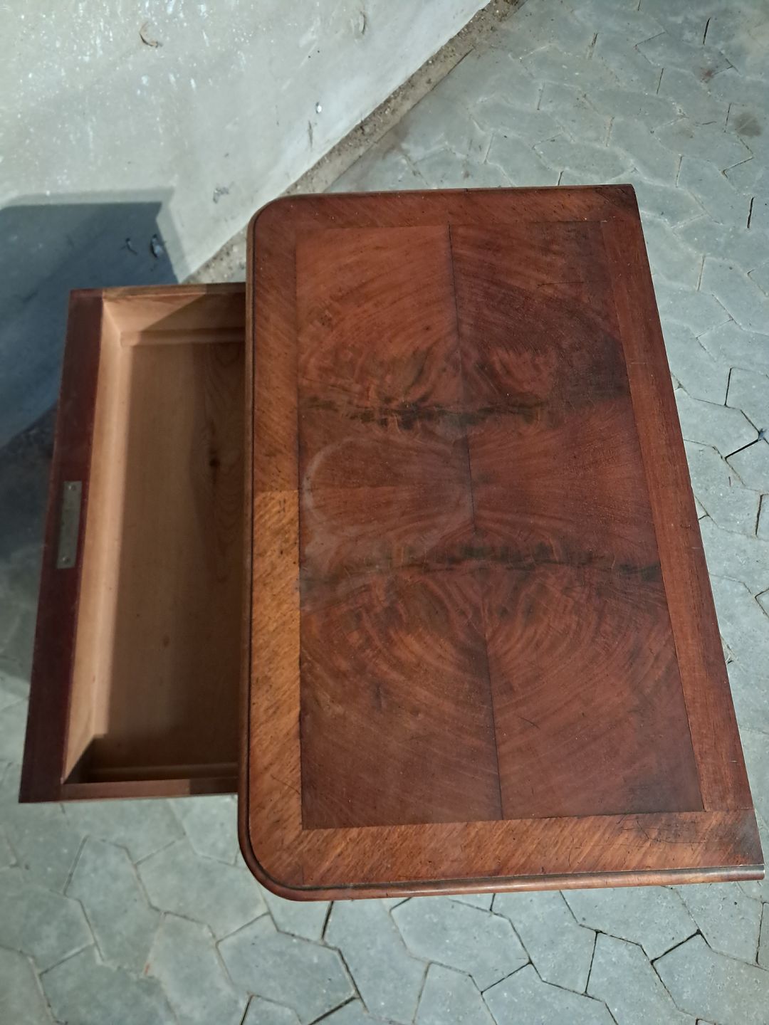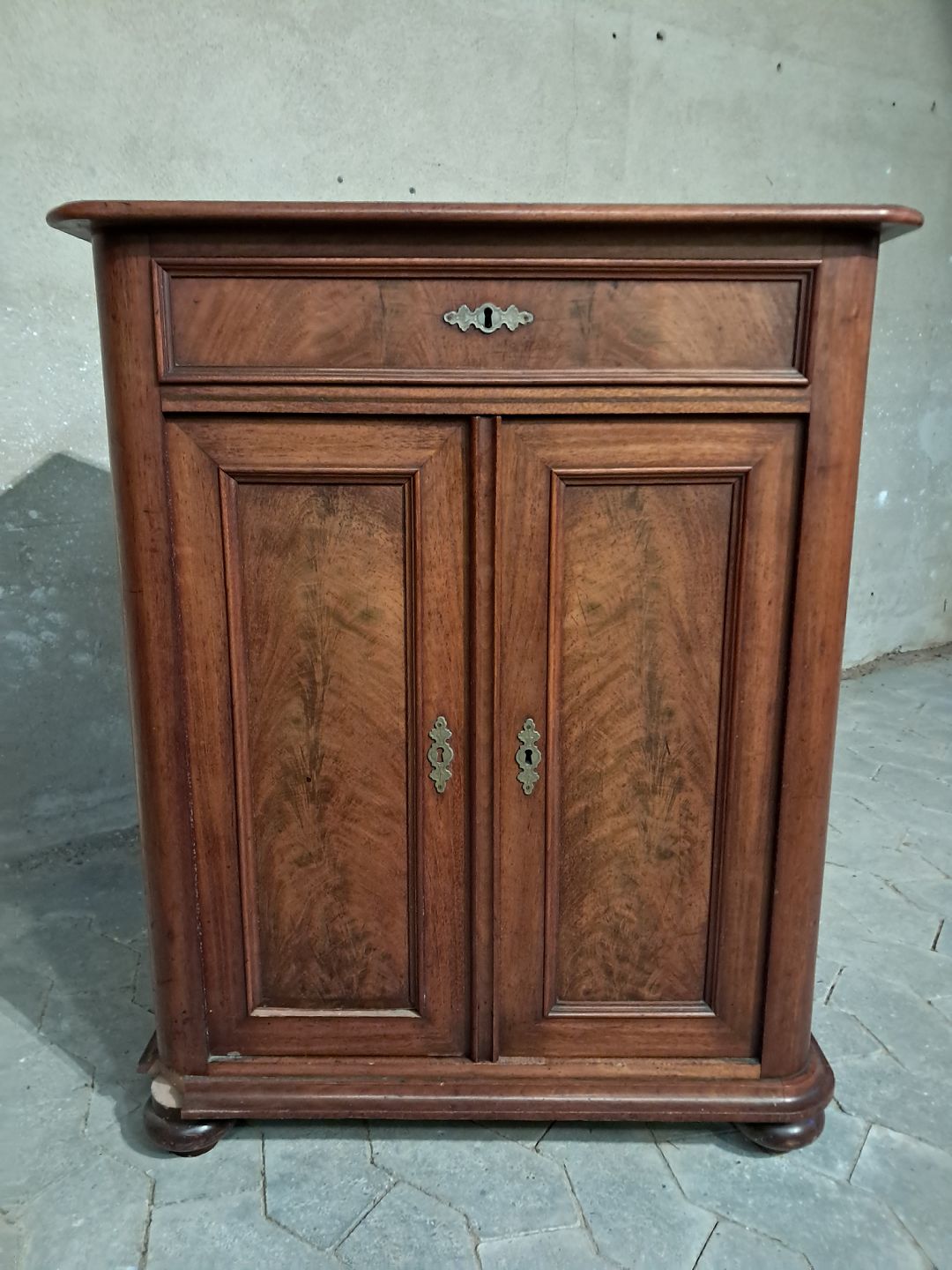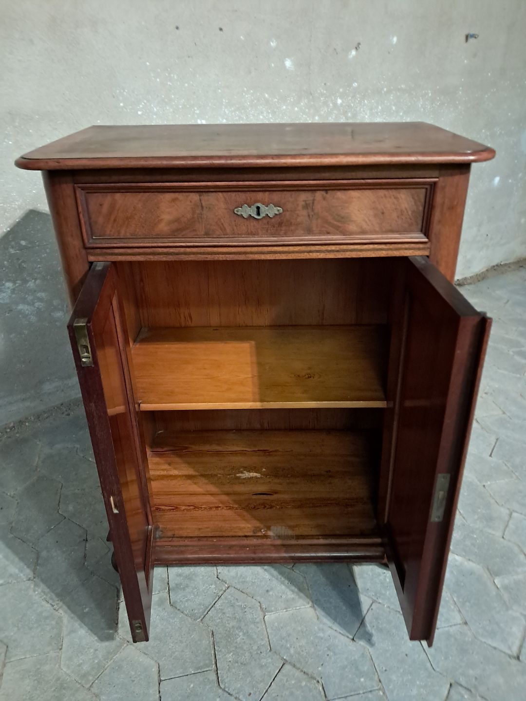 Konsolskab i fineret mahogni, fra 1910erne.Det har brugsspor og mangler en hjørneliste.