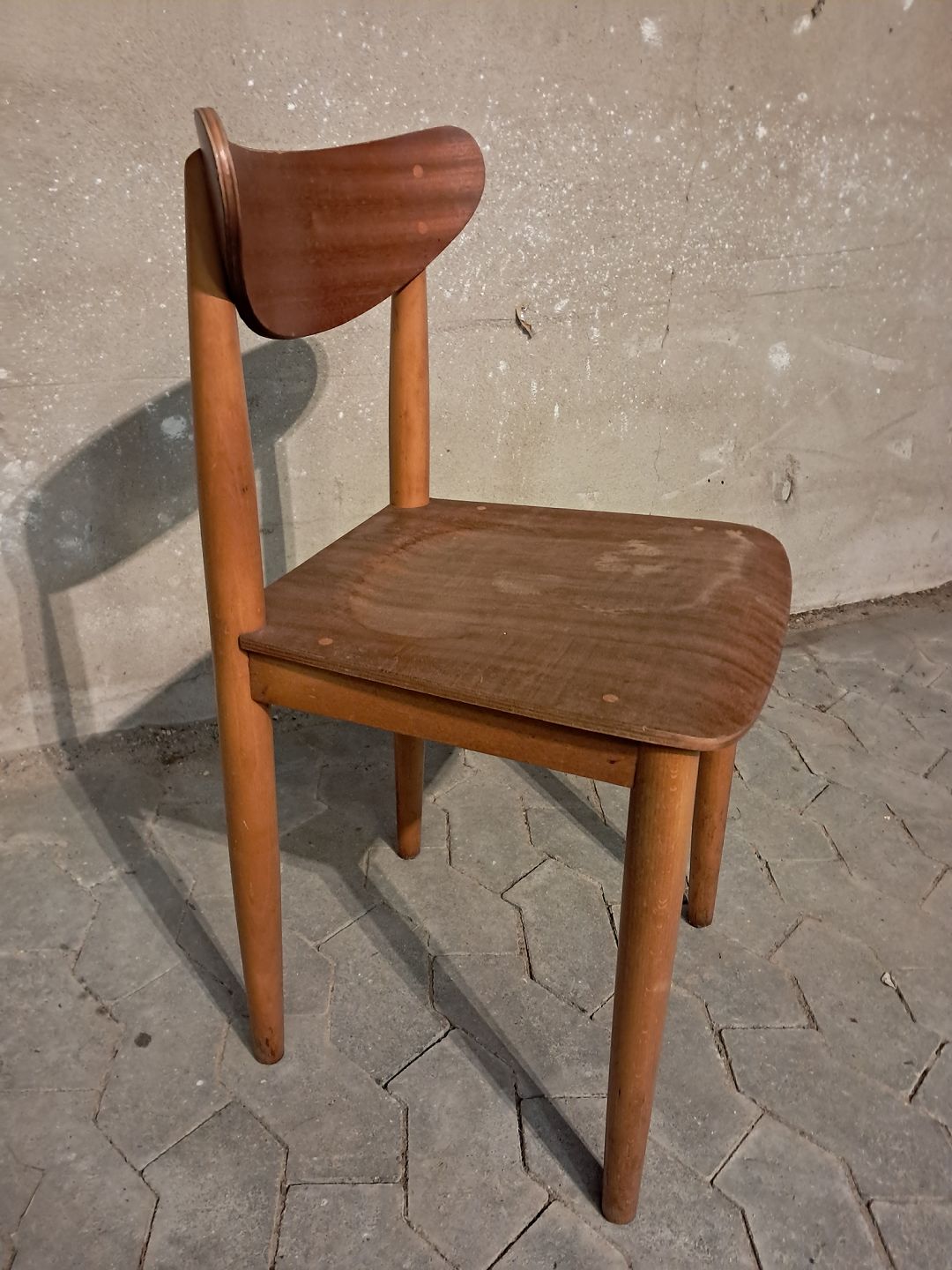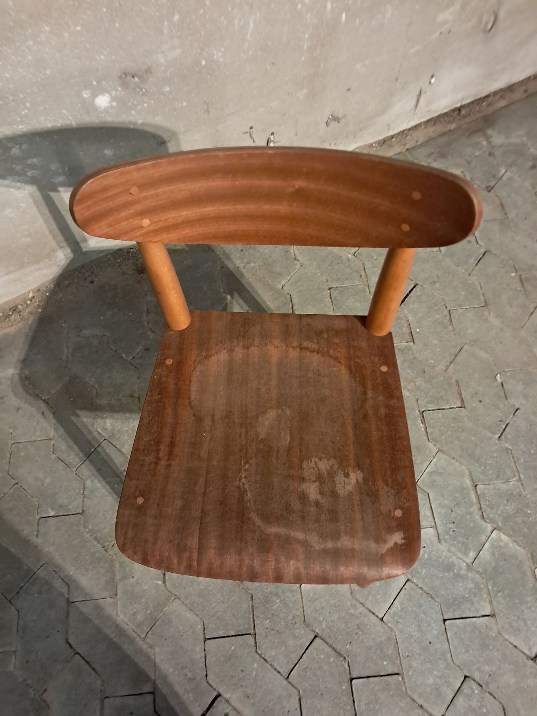 Stol i fineret mahogni og massivt bøgetræ, fra 1960erne.Den har brugsspor og defekt finer.