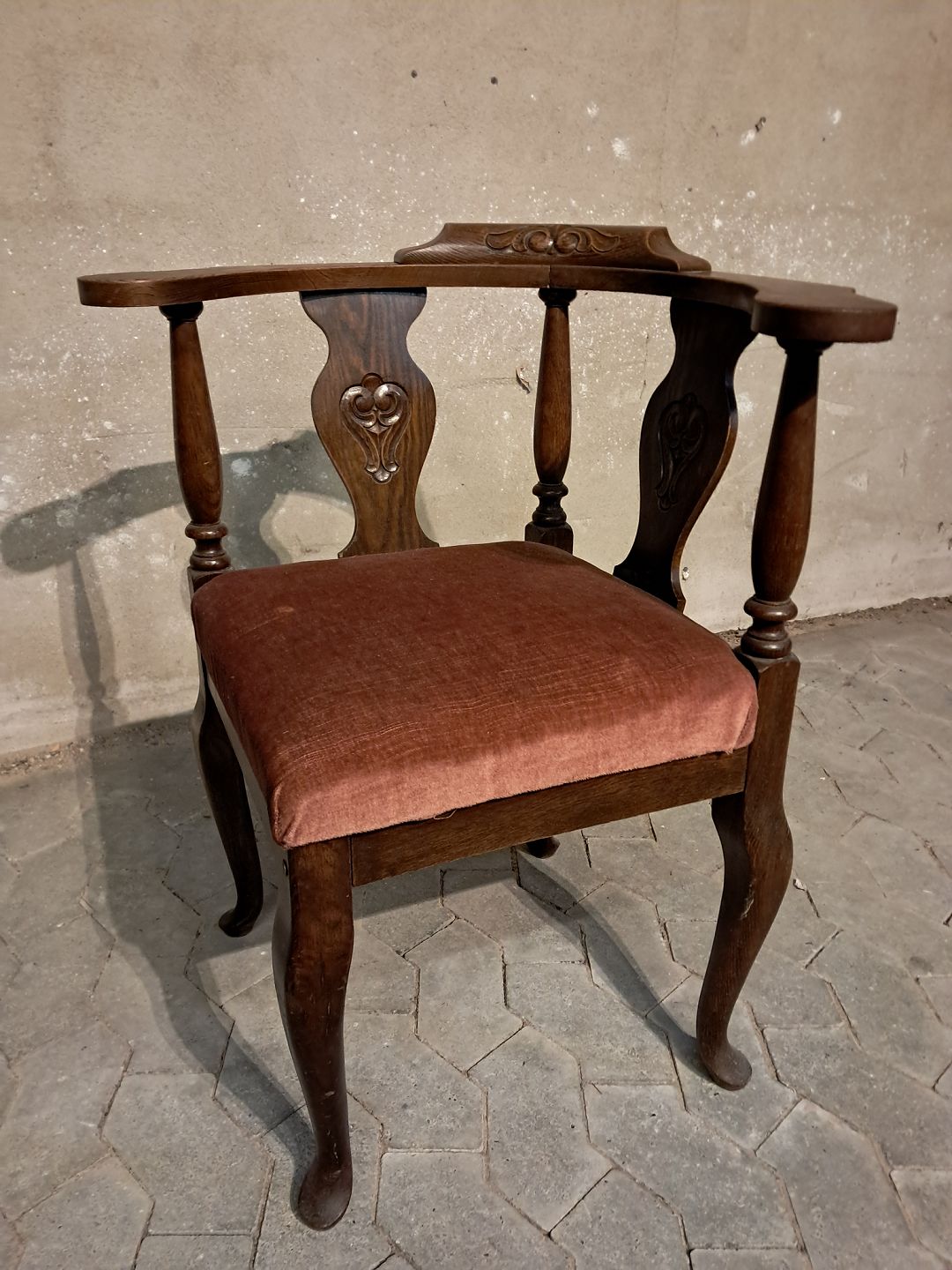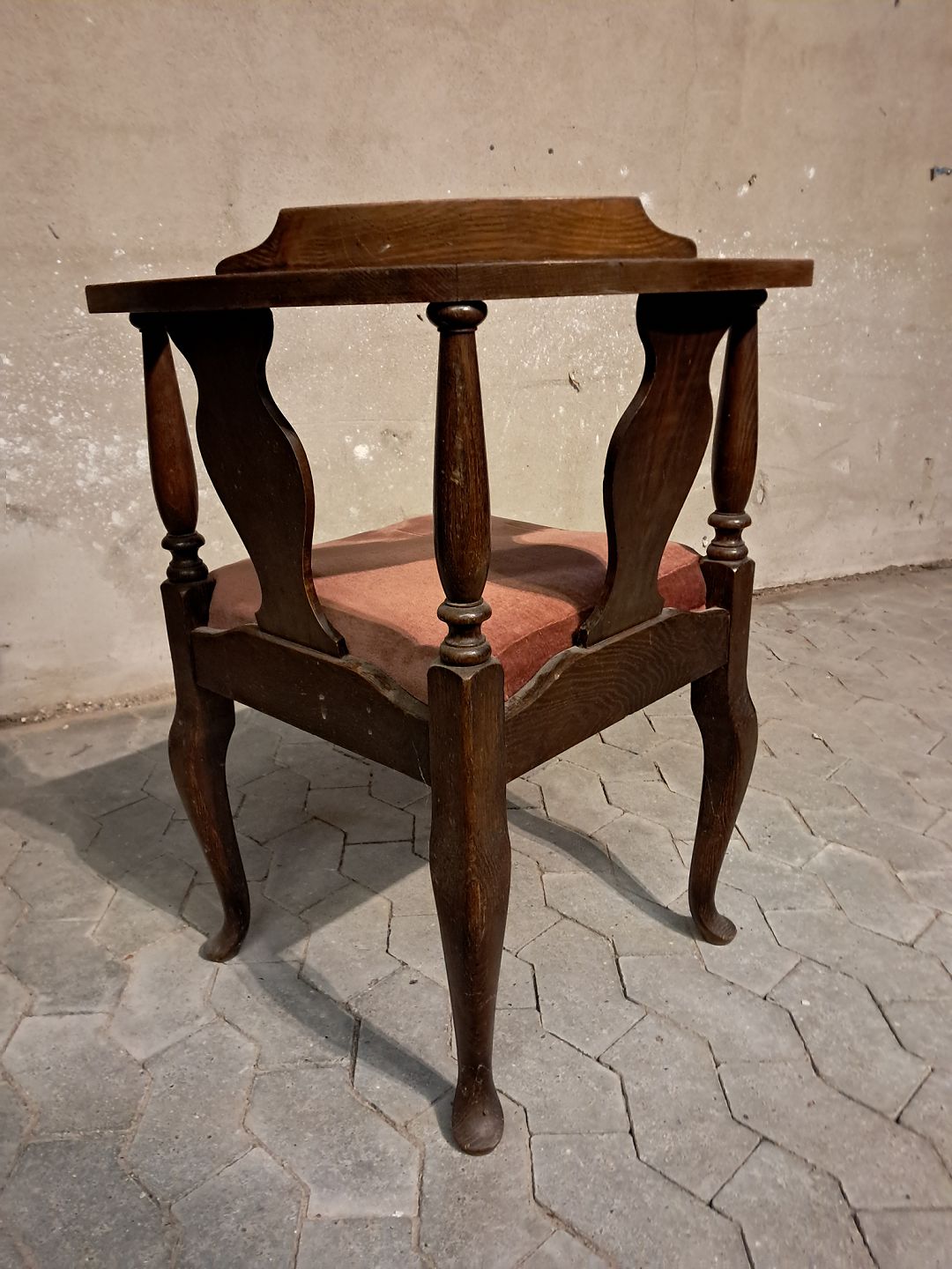 Hjønestol i massivt egetræ, fra 1920erne.Den har brugsspor og betrækket er slidt.