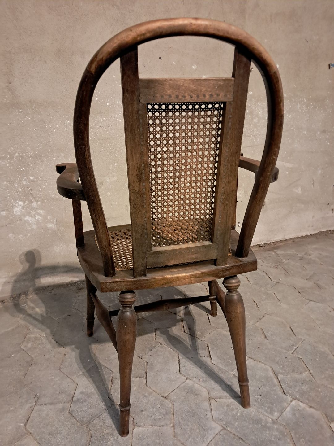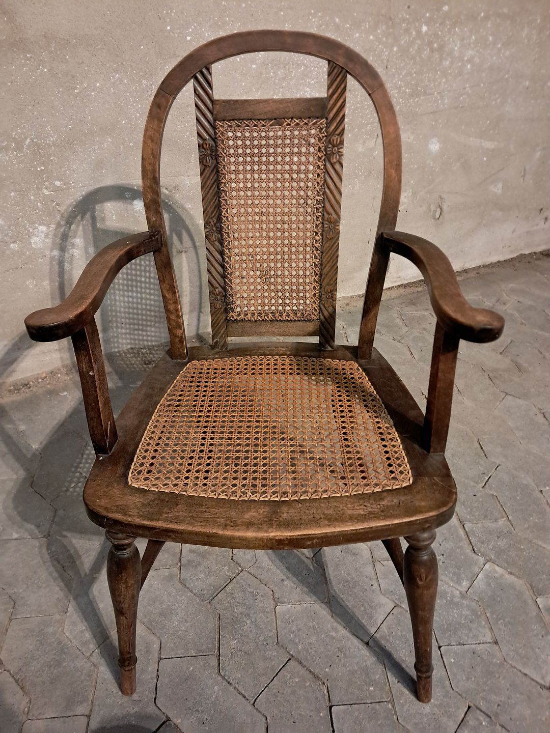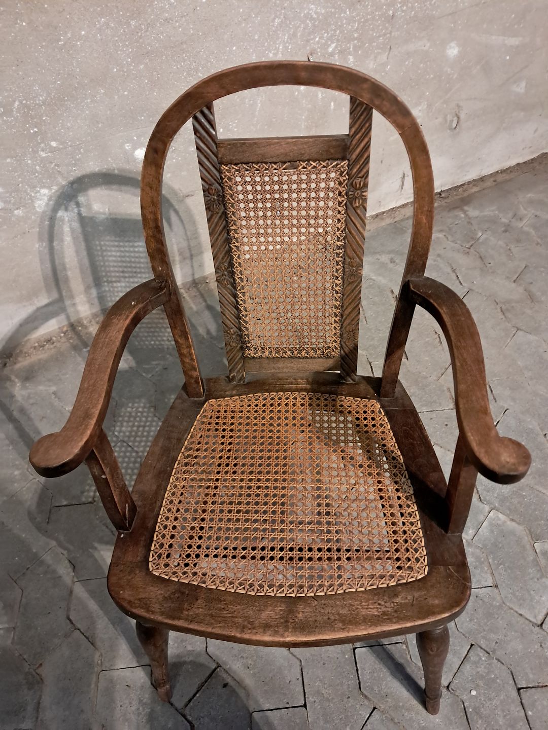 Armstol i massivt egetræ med rørflet, fra 1930erne.Den har lidt løse armlæn.