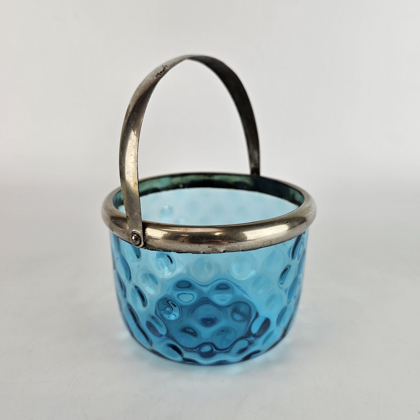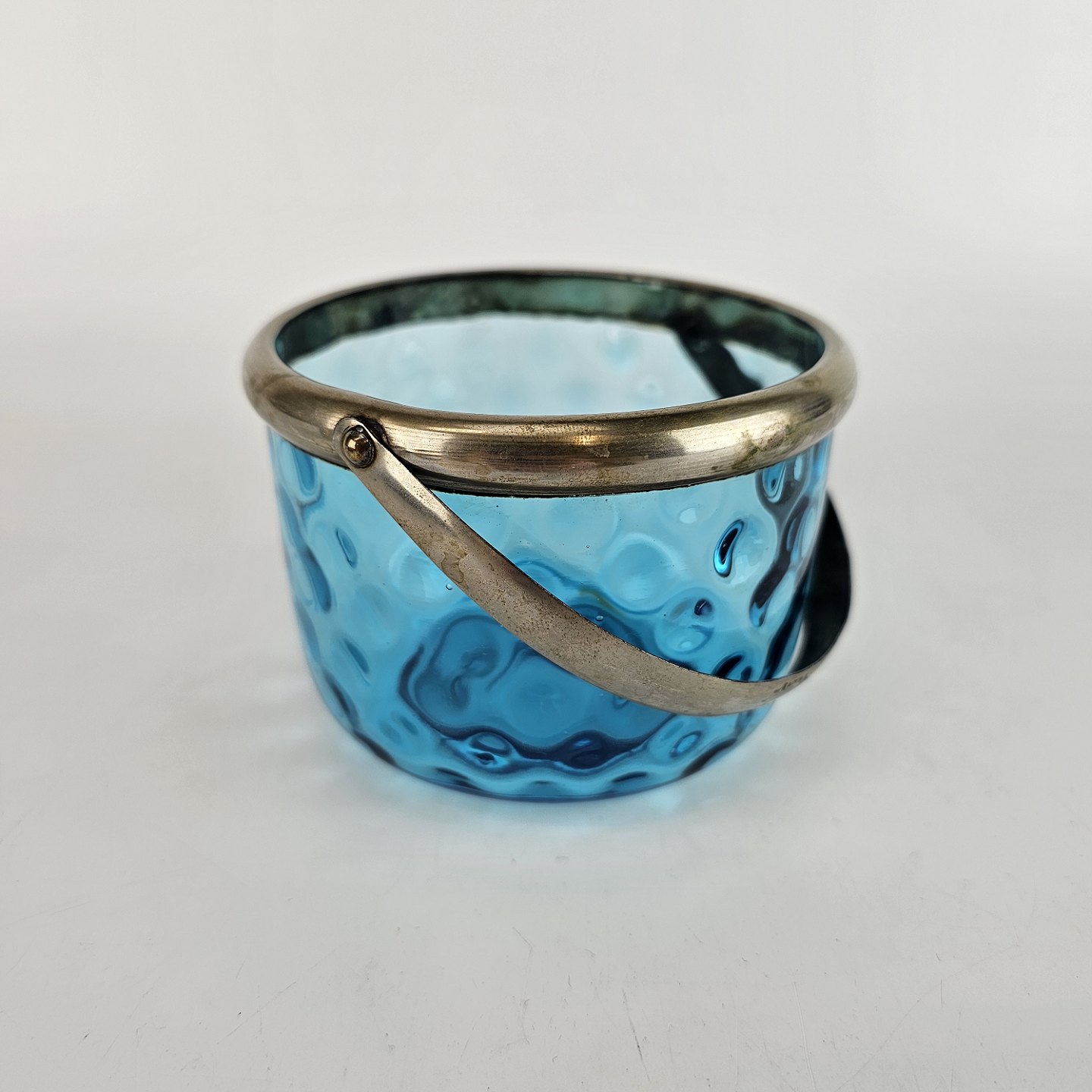 Sukkerskål i blåt øjnet glas, med hank af nikkel.Producent Fyens Glasværk