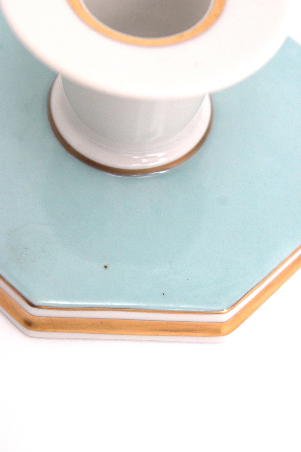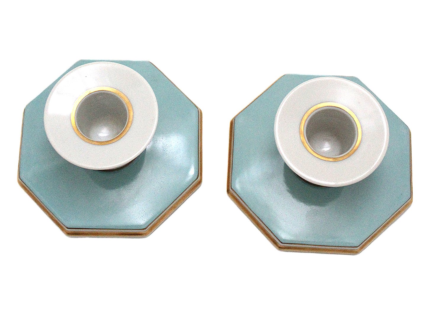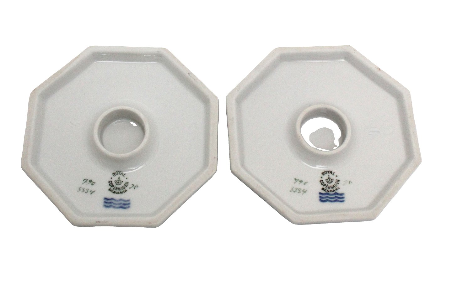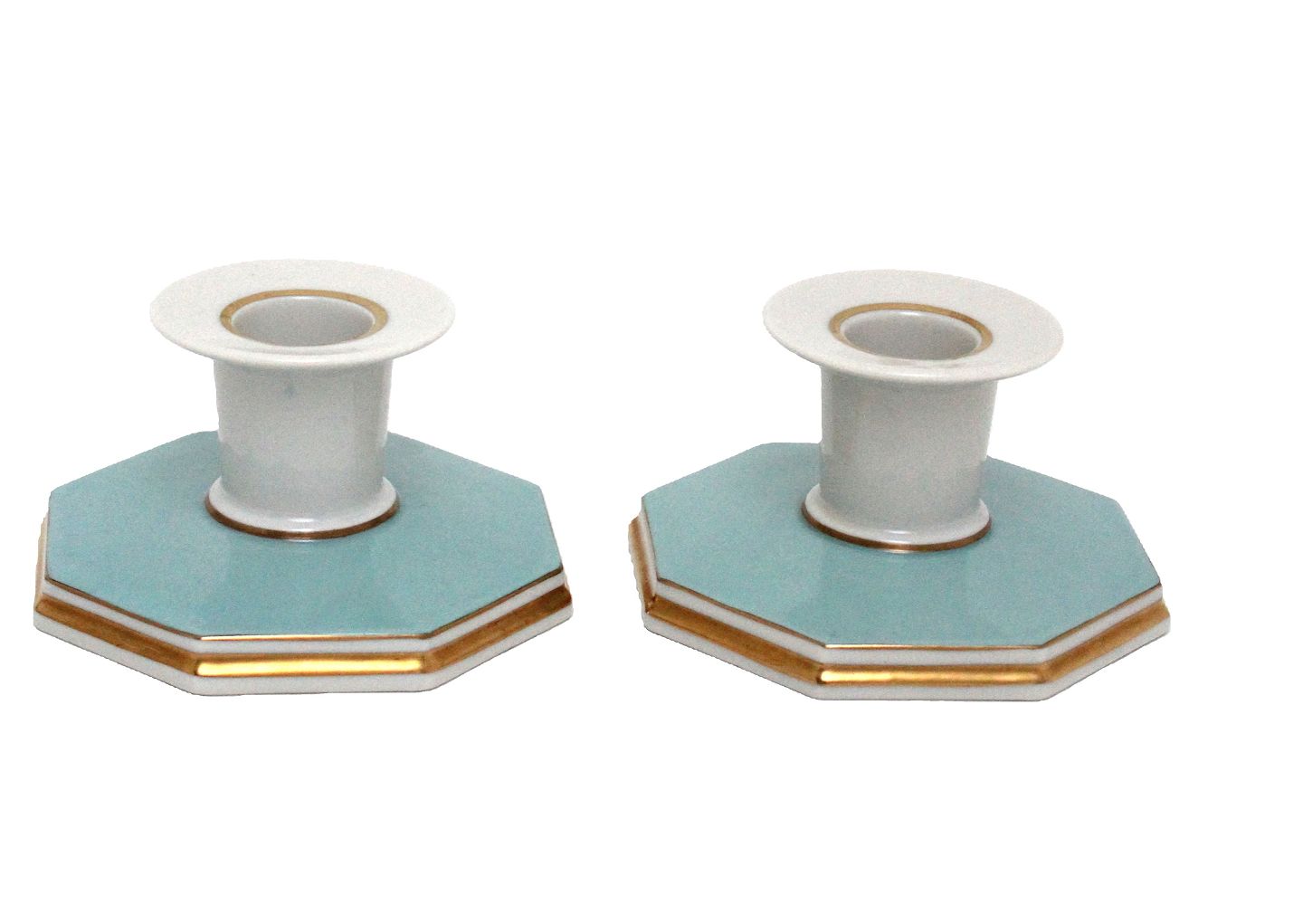 Royal Copenhagen, 2 Lysestager i turkis og creme med guldkanter.Nr. 790/3334. Højde 5,5 cm. Diameter 11 cm. I. sortering. Flot stand, den ene har dog 2 små brændingspletter. Pris: 450 kr. for sæt på 2 stk.