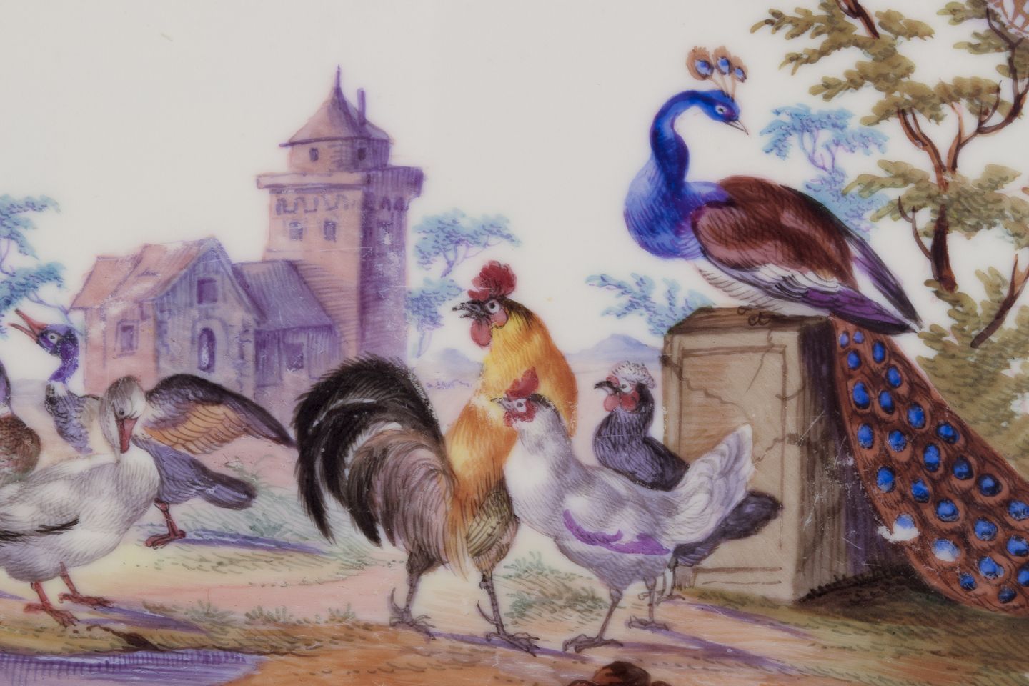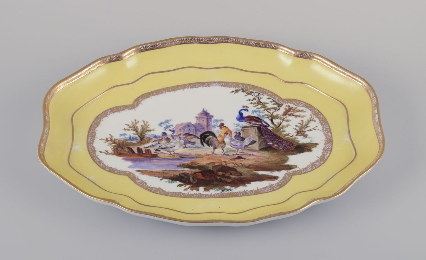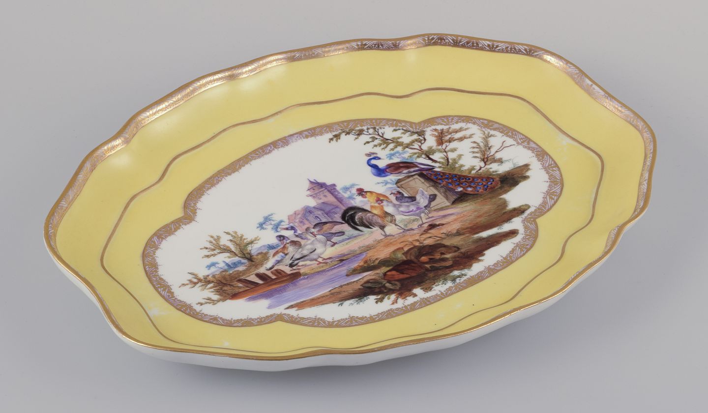 Antik Meissen bakke af porcelæn.Håndmalet med motiv af fugle i parklandskab.