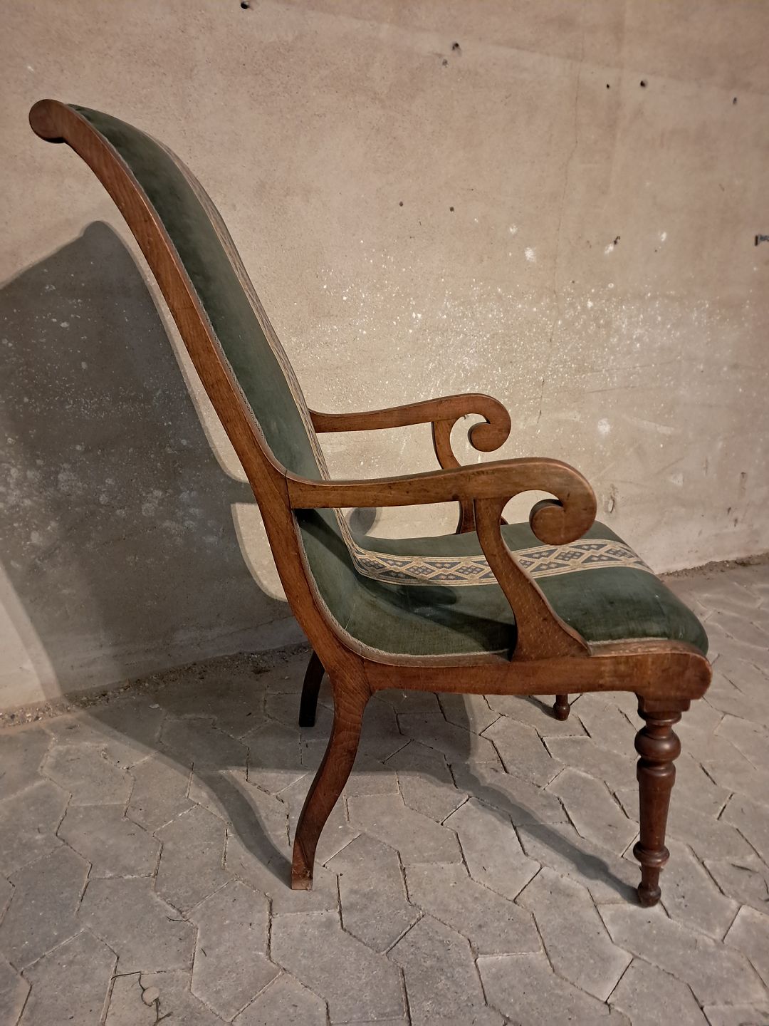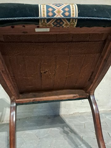 Armstol i massivt mahogni, fra 1900erne.Den har brugsspor og en defekt på venstre bagben.