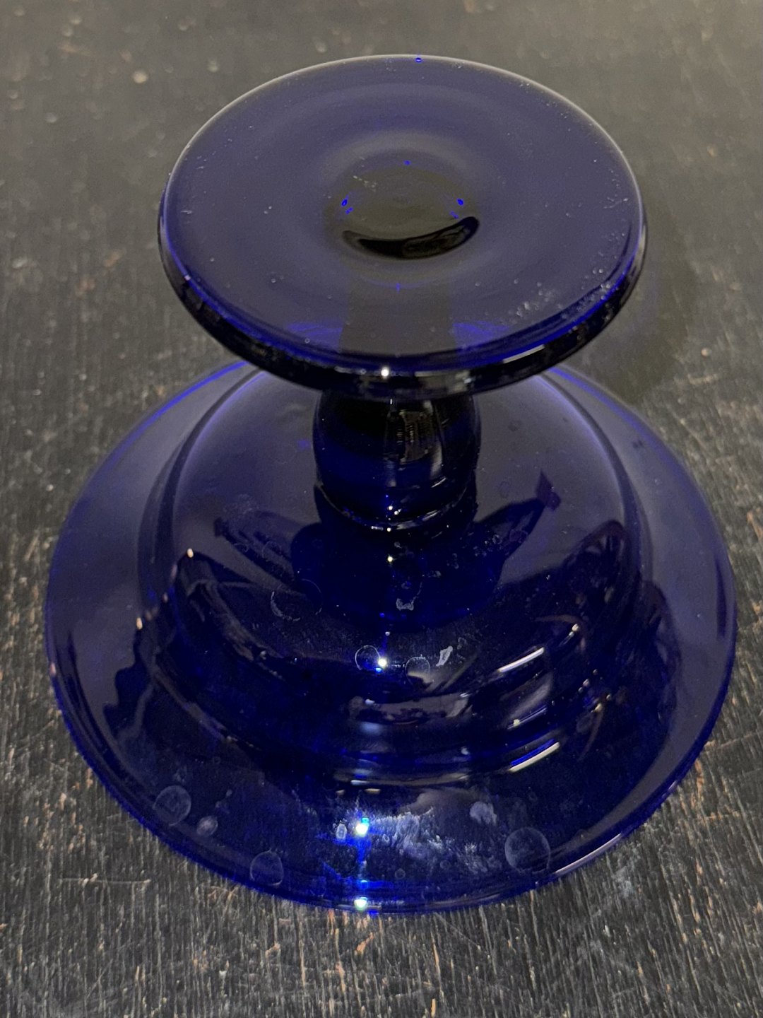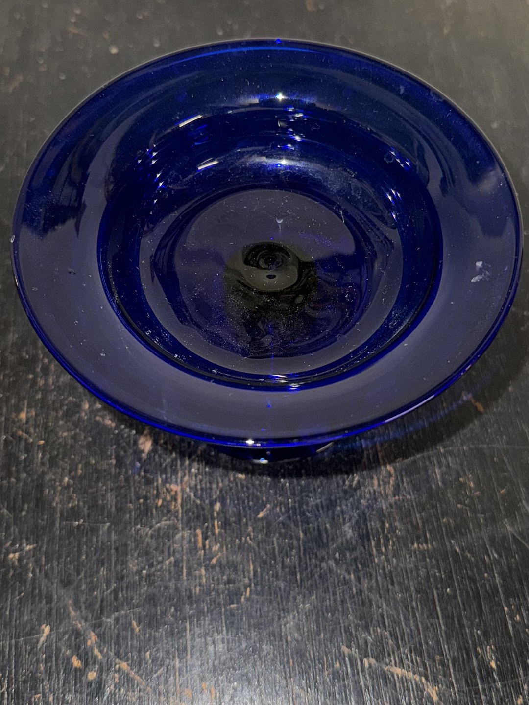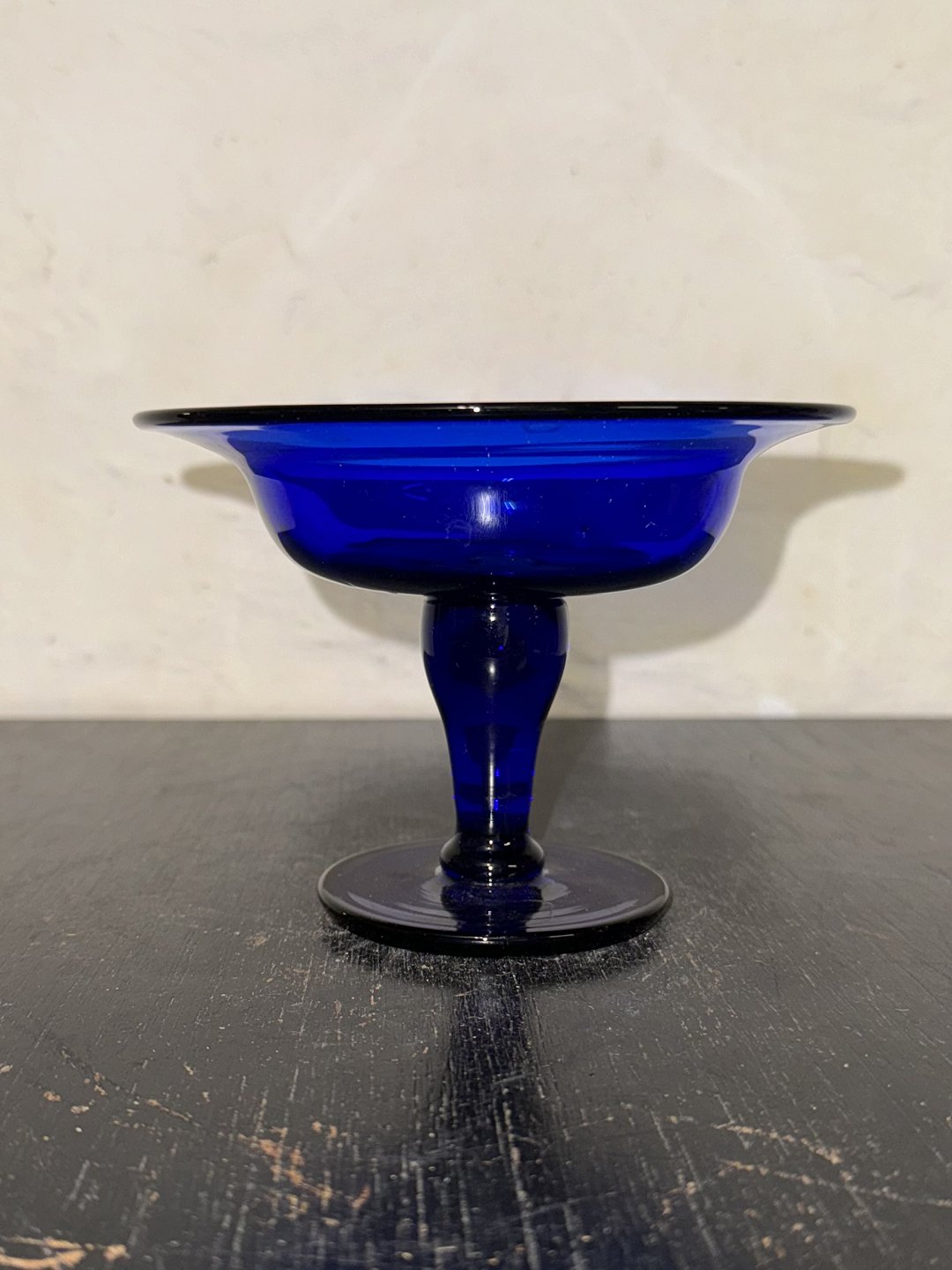 Sukkerskål eller kandisskål på fod i blåt glas. Formodes fremstillet i begyndelsen af 20. århundrede. I god stand. Mål: H. 10 cm. Kummens diameter måler 13,5 cm