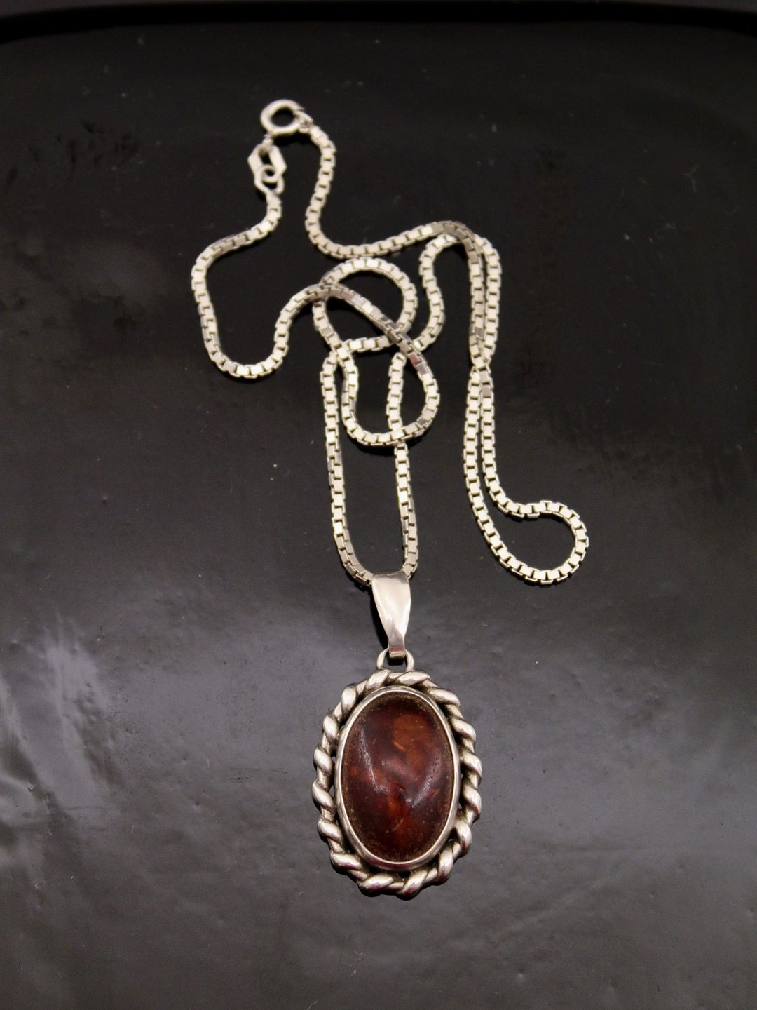 830 sølv vedhæng med rav 3 x 2 cm. og sterling sølv kæde 39 cm. emne nr. 611735