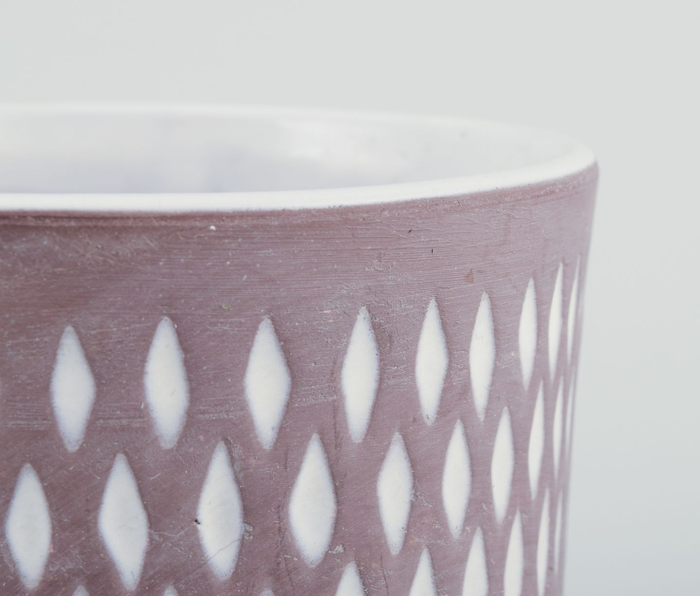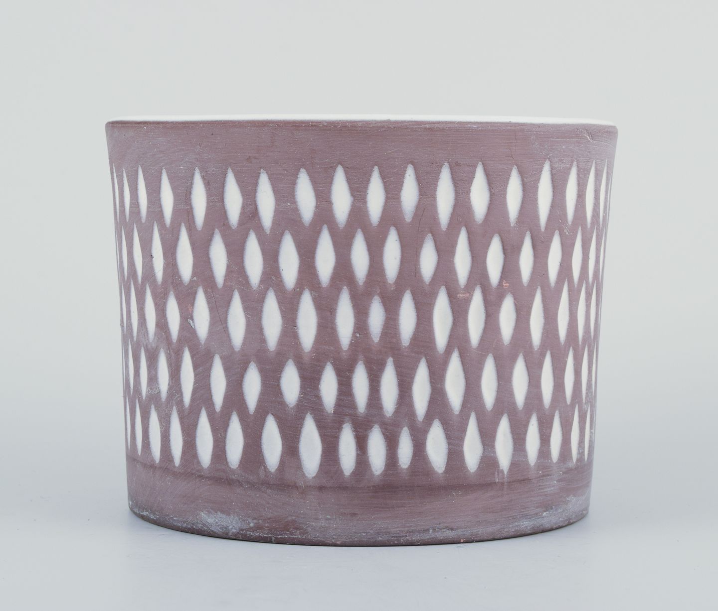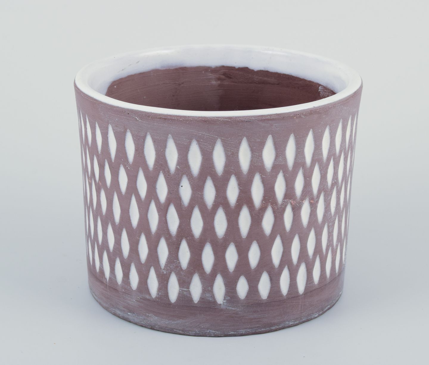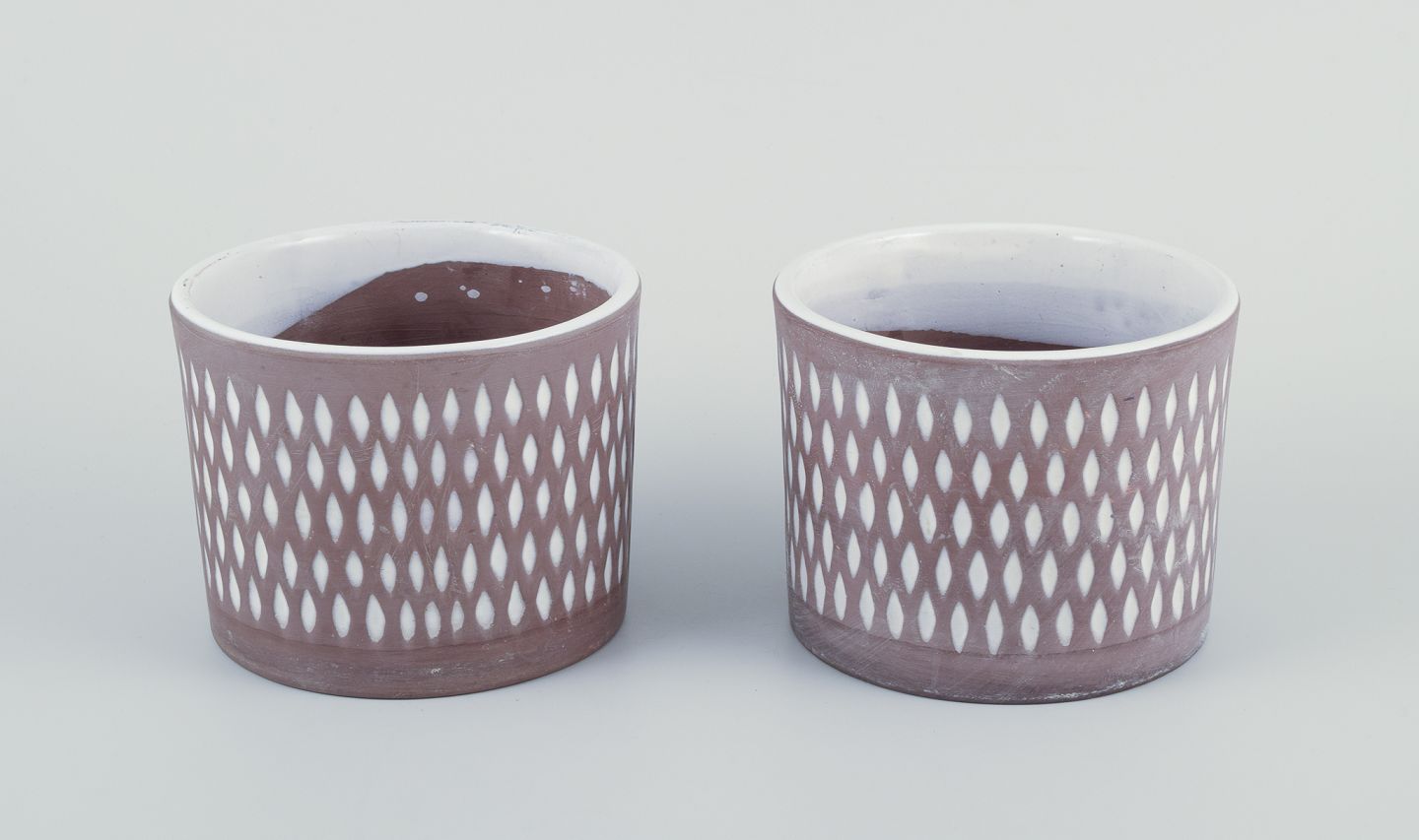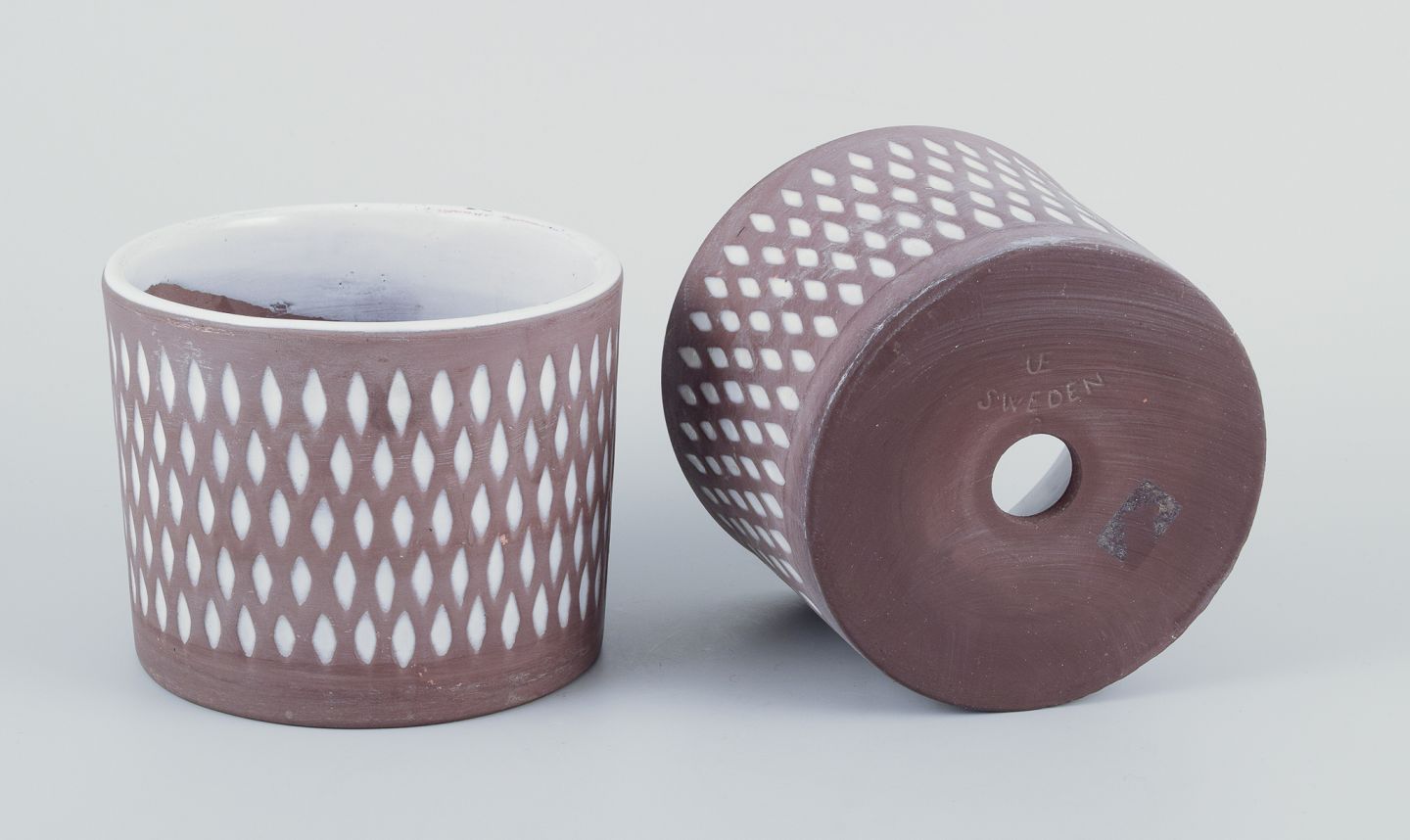 Ingrid Atterberg for Upsala Ekeby, Sverige.Et par urtepotteskjulere af keramik. Mønster i dekorationen.