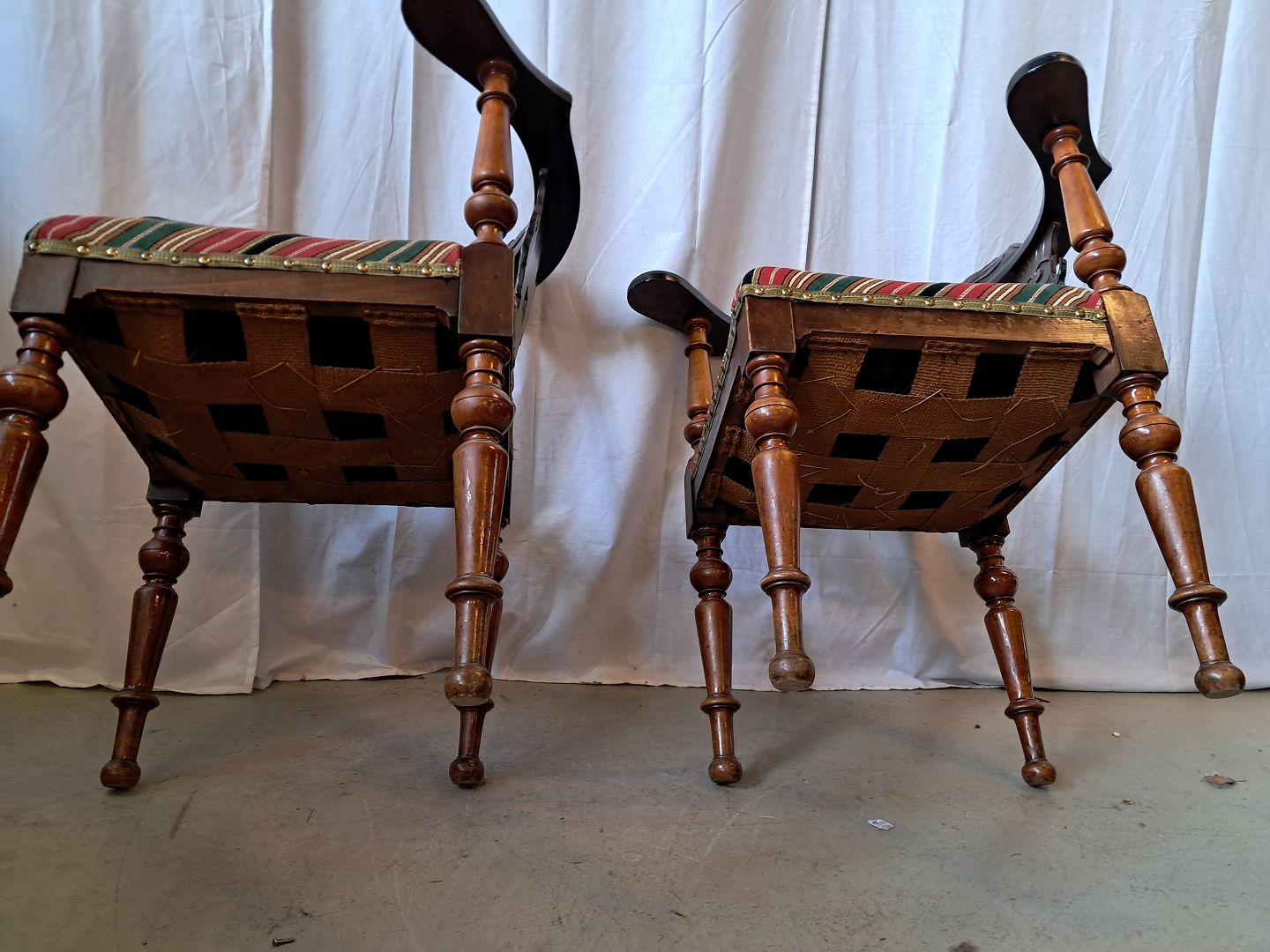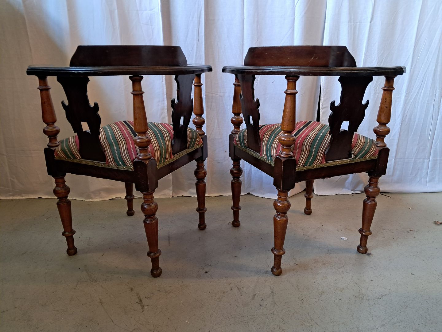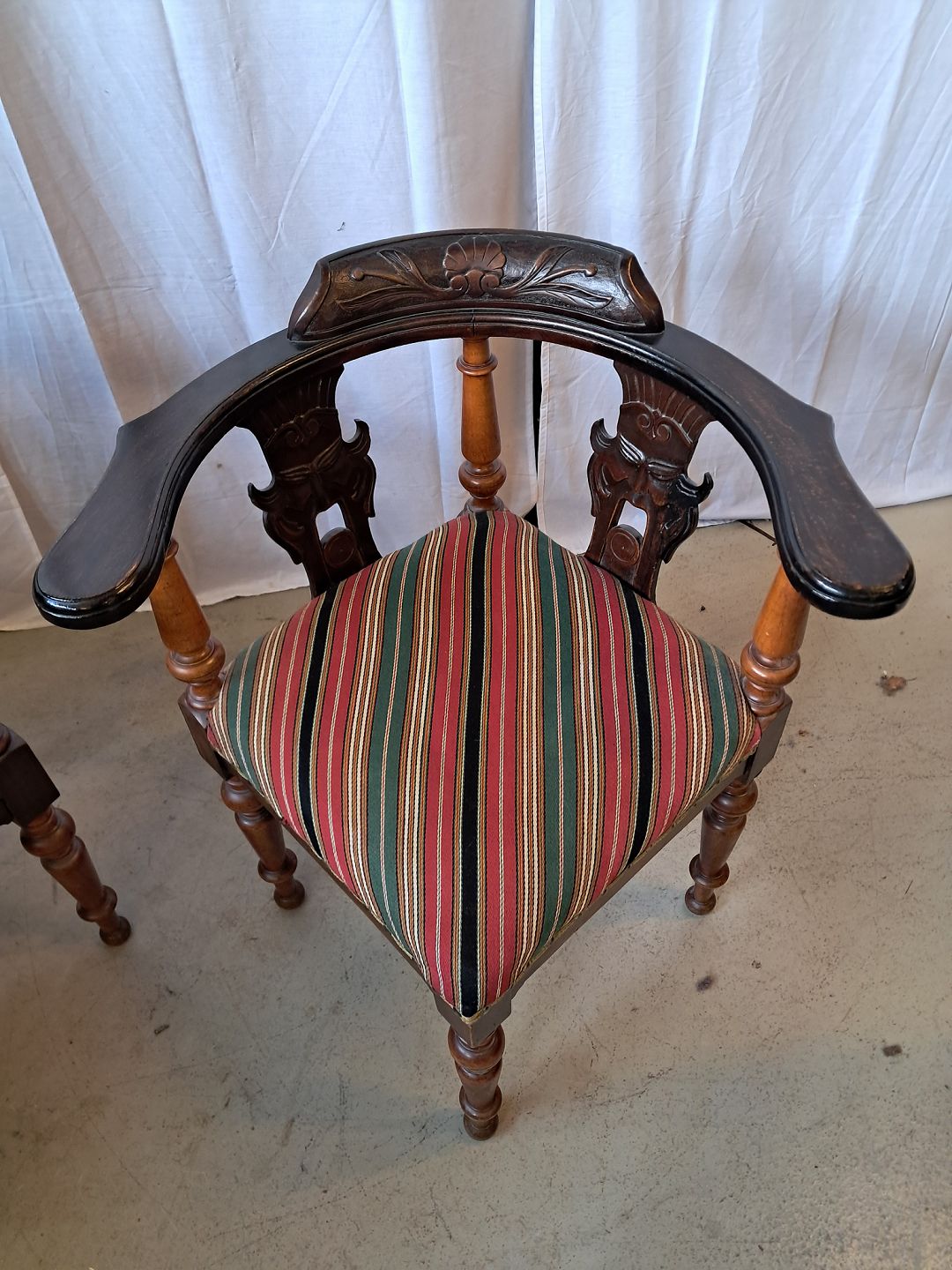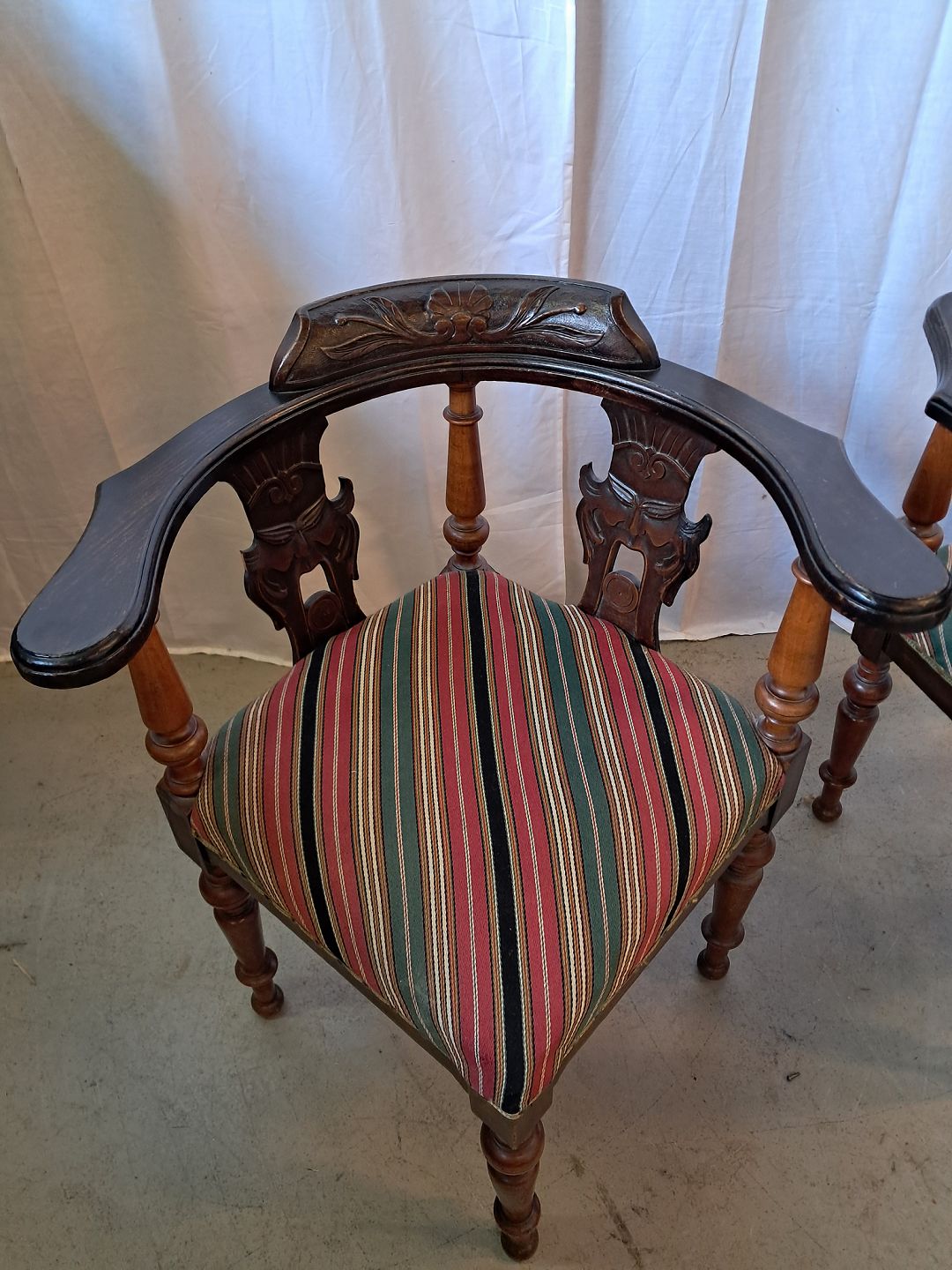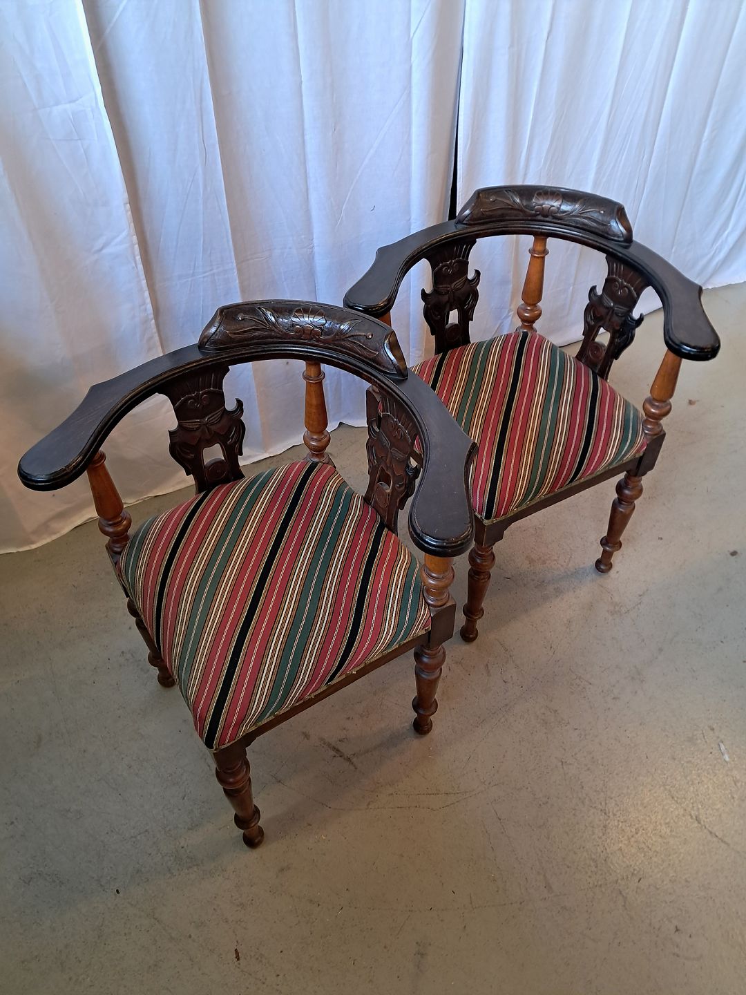 2 Ens hjørnestole i massivt bøgetræ, fra 1910erne.De har patina.