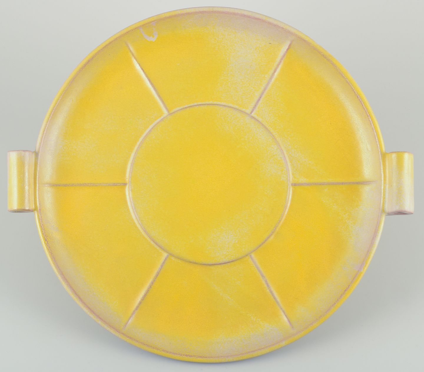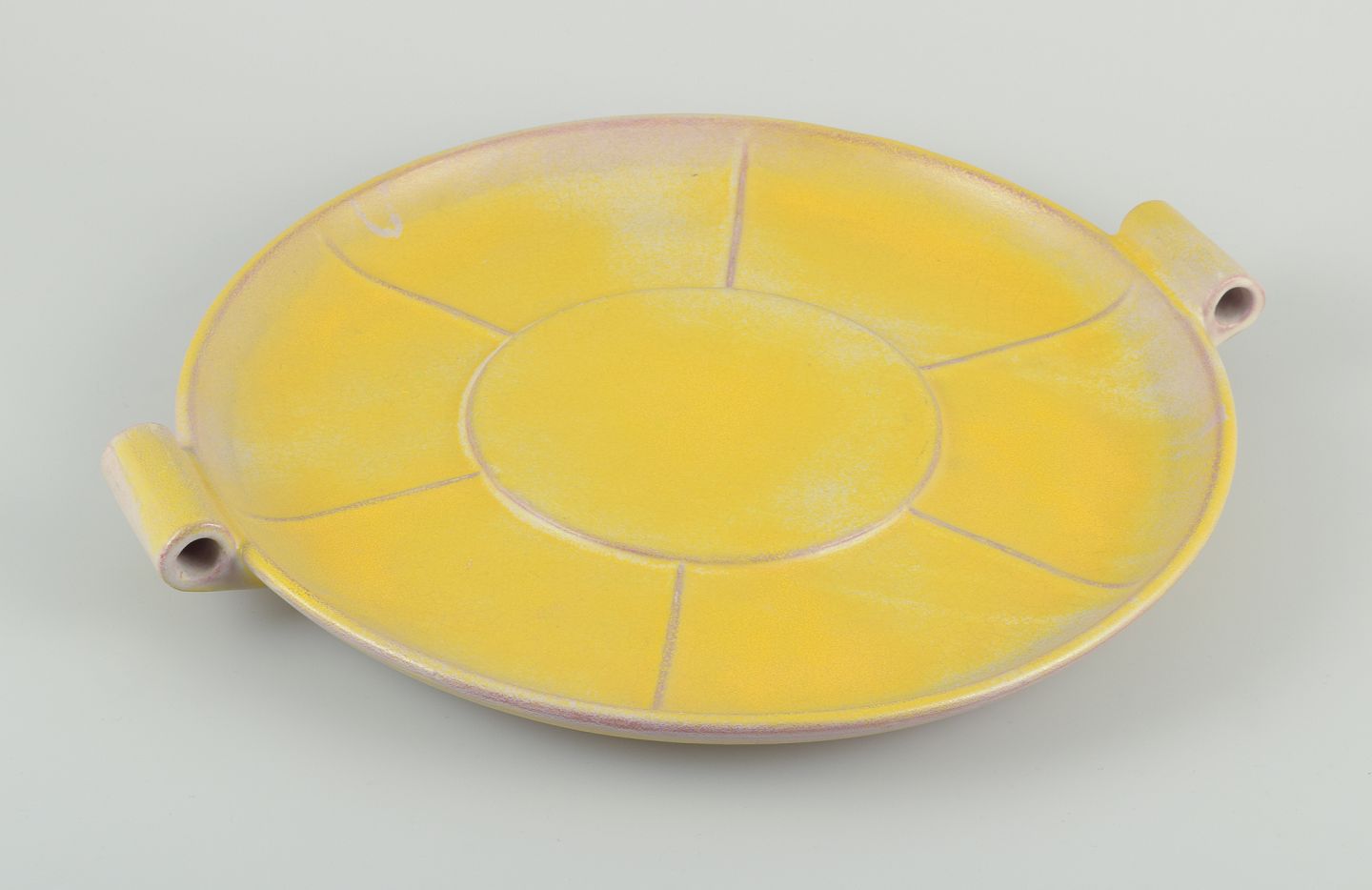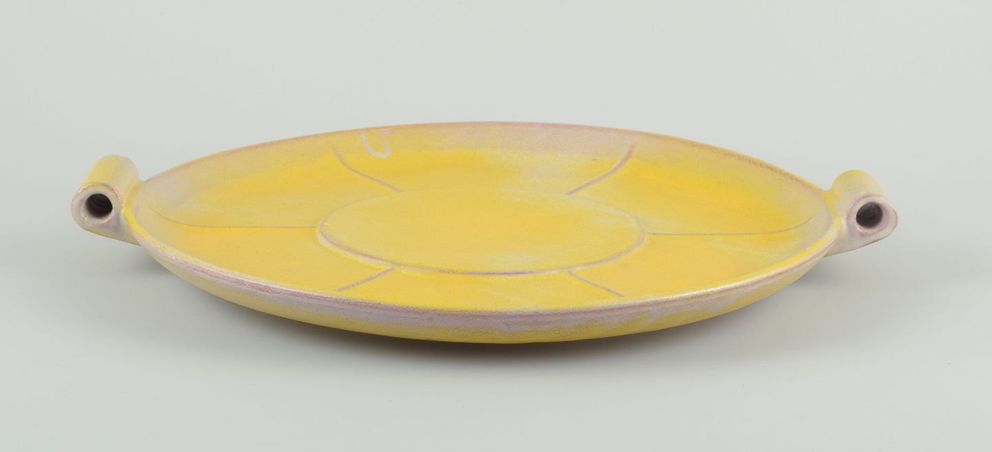 Finsk keramikfad i Art Deco-stil. Med to hanke.Gul glasur. Håndmalet.