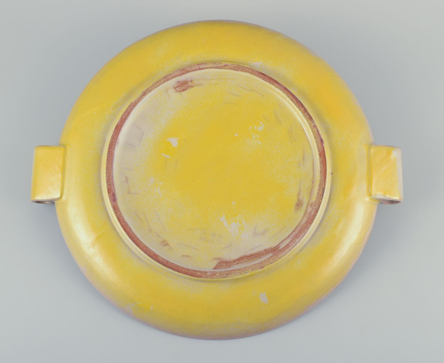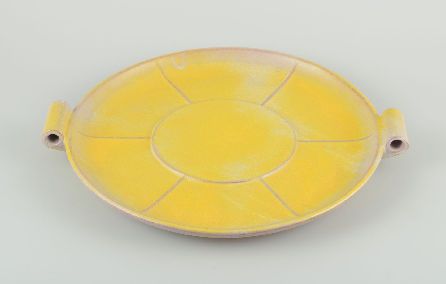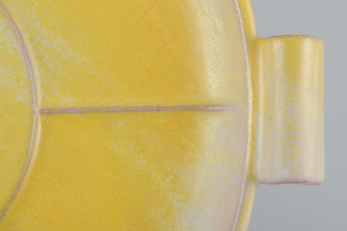 Finsk keramikfad i Art Deco-stil. Med to hanke.Gul glasur. Håndmalet.