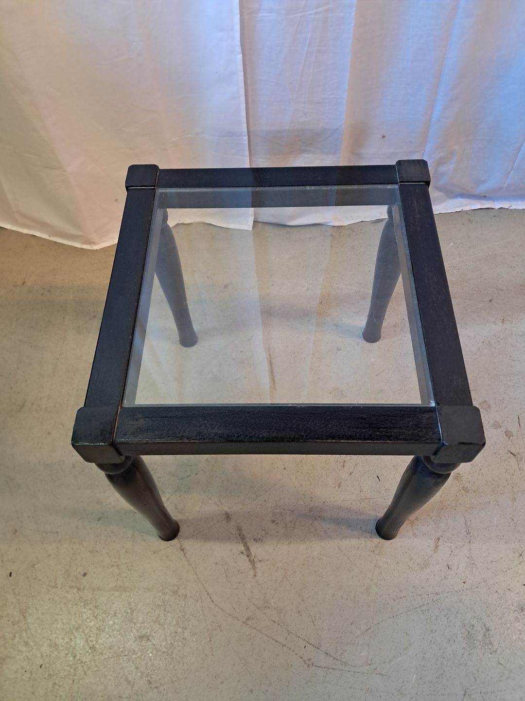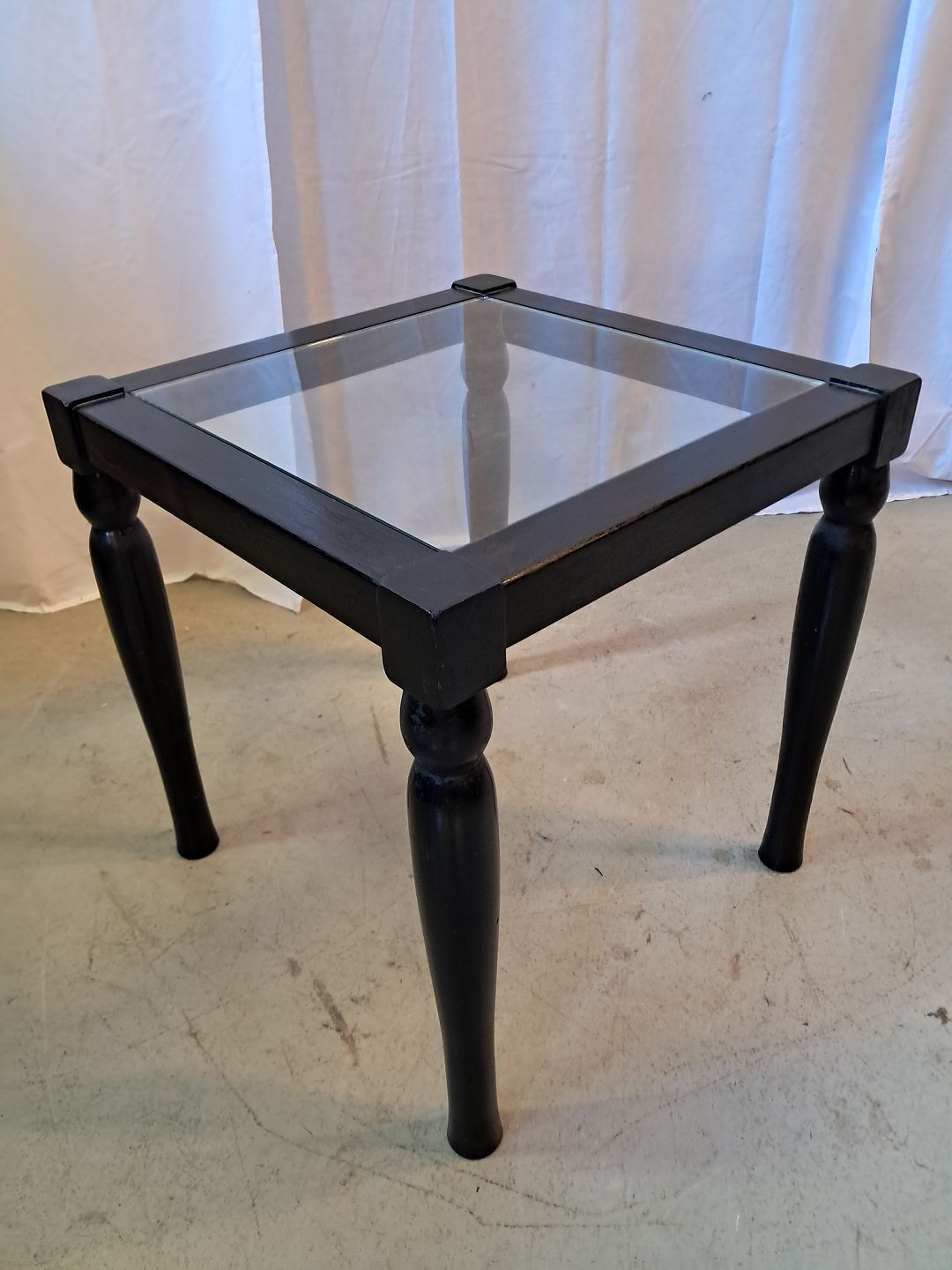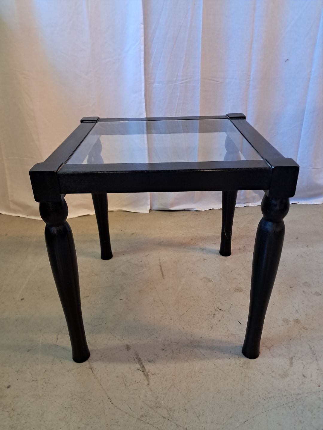 Bord i malet massivt træ med glasplade, fra 2000erne.Glaspladen har brugsspor/ridser.