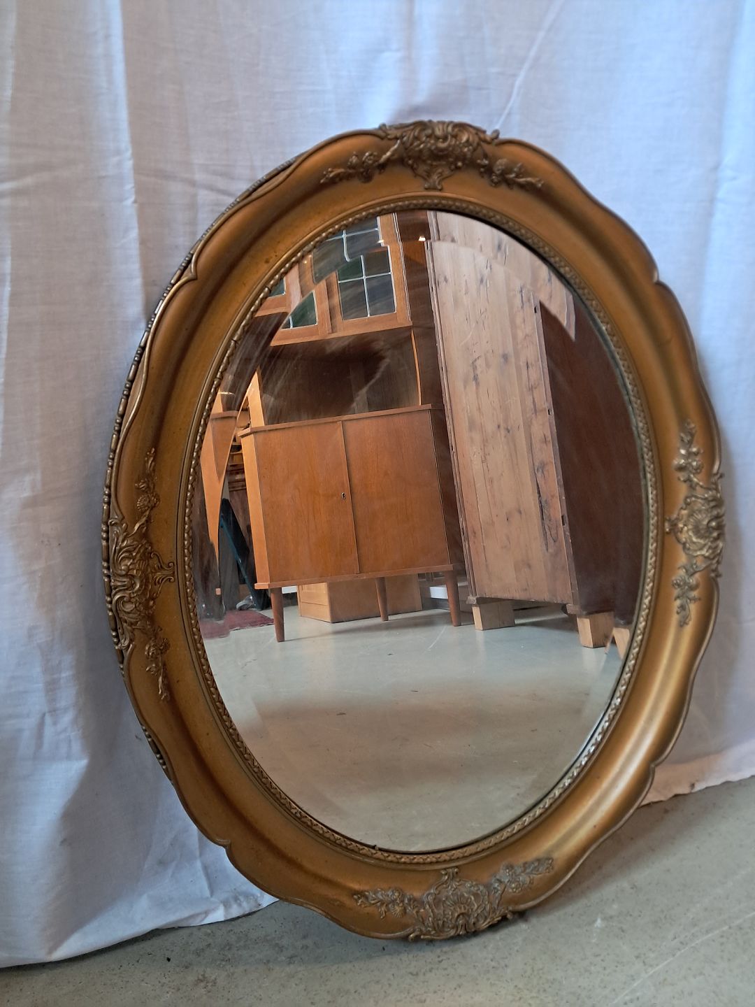 Ovalt guldmalet spejl, fra 1960erne.Det har brugsspor.
