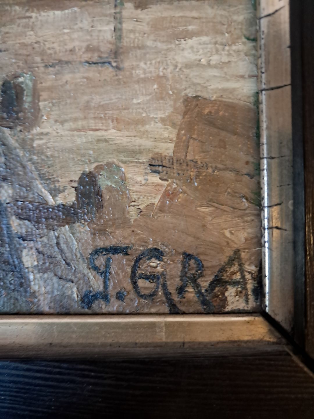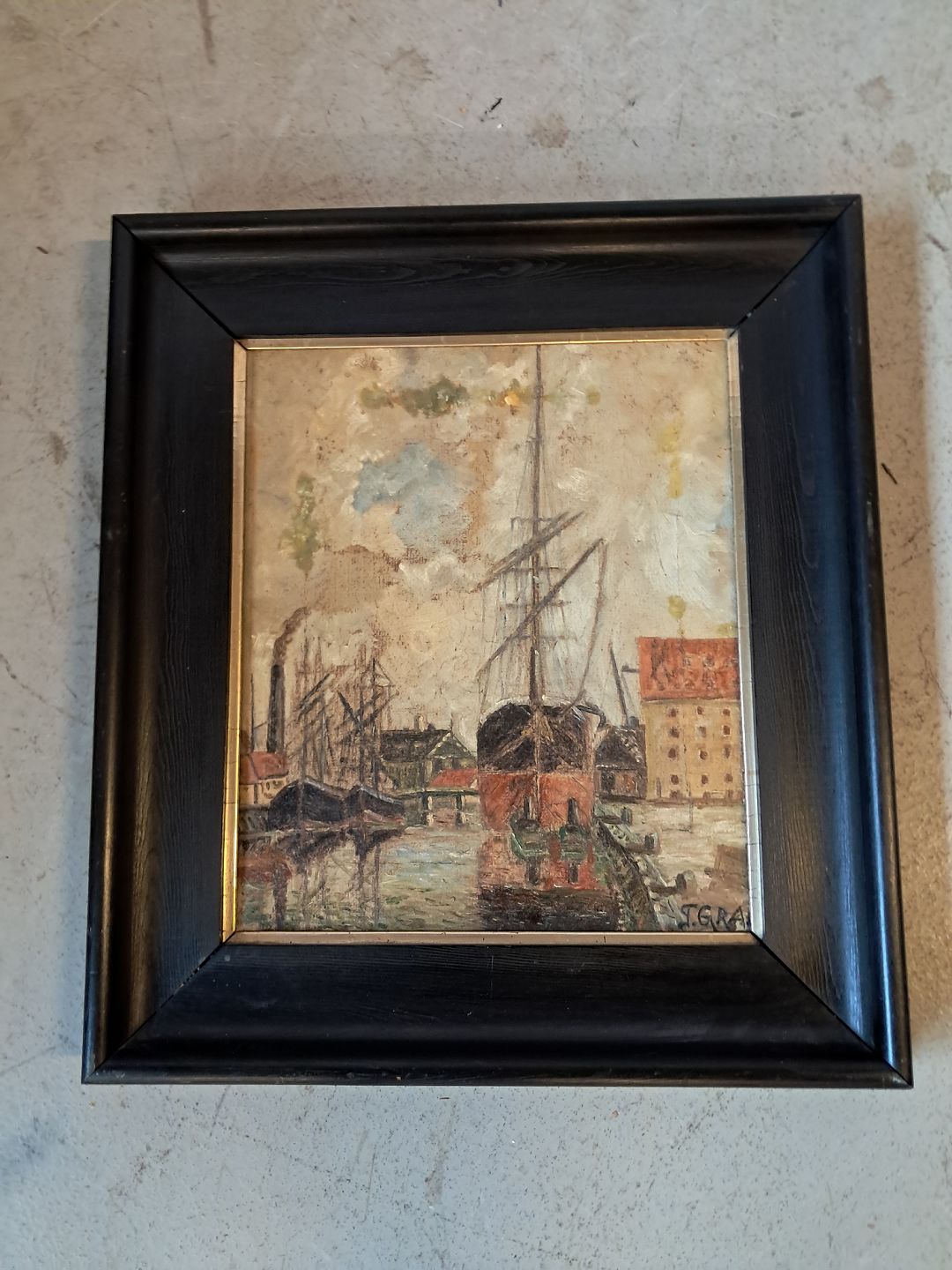 Maleri i sortmalet ramme, fra 1930erne.Det har brugsspor.