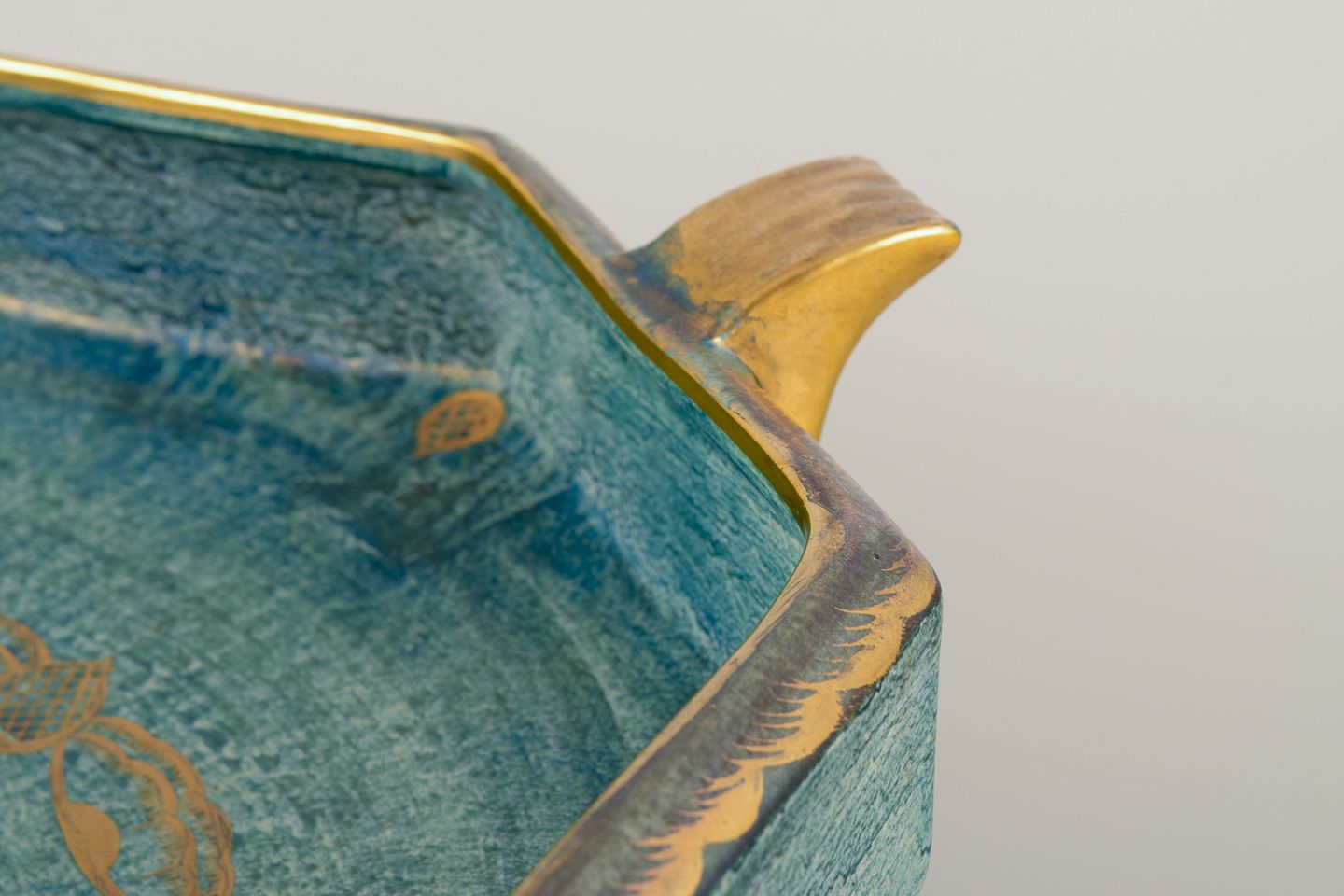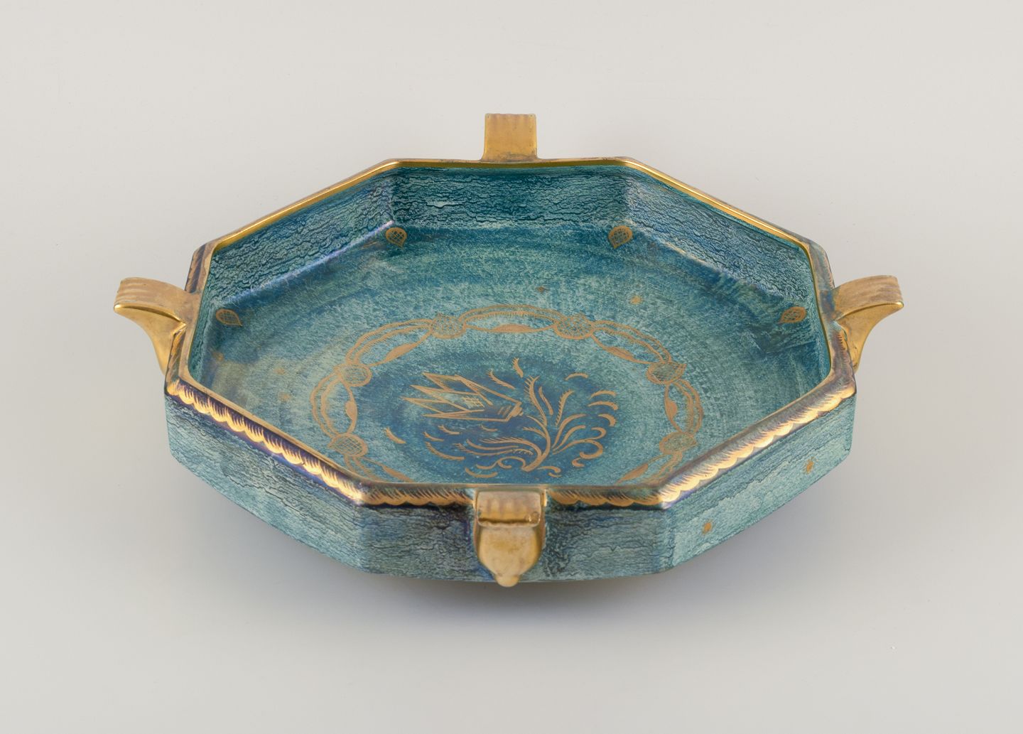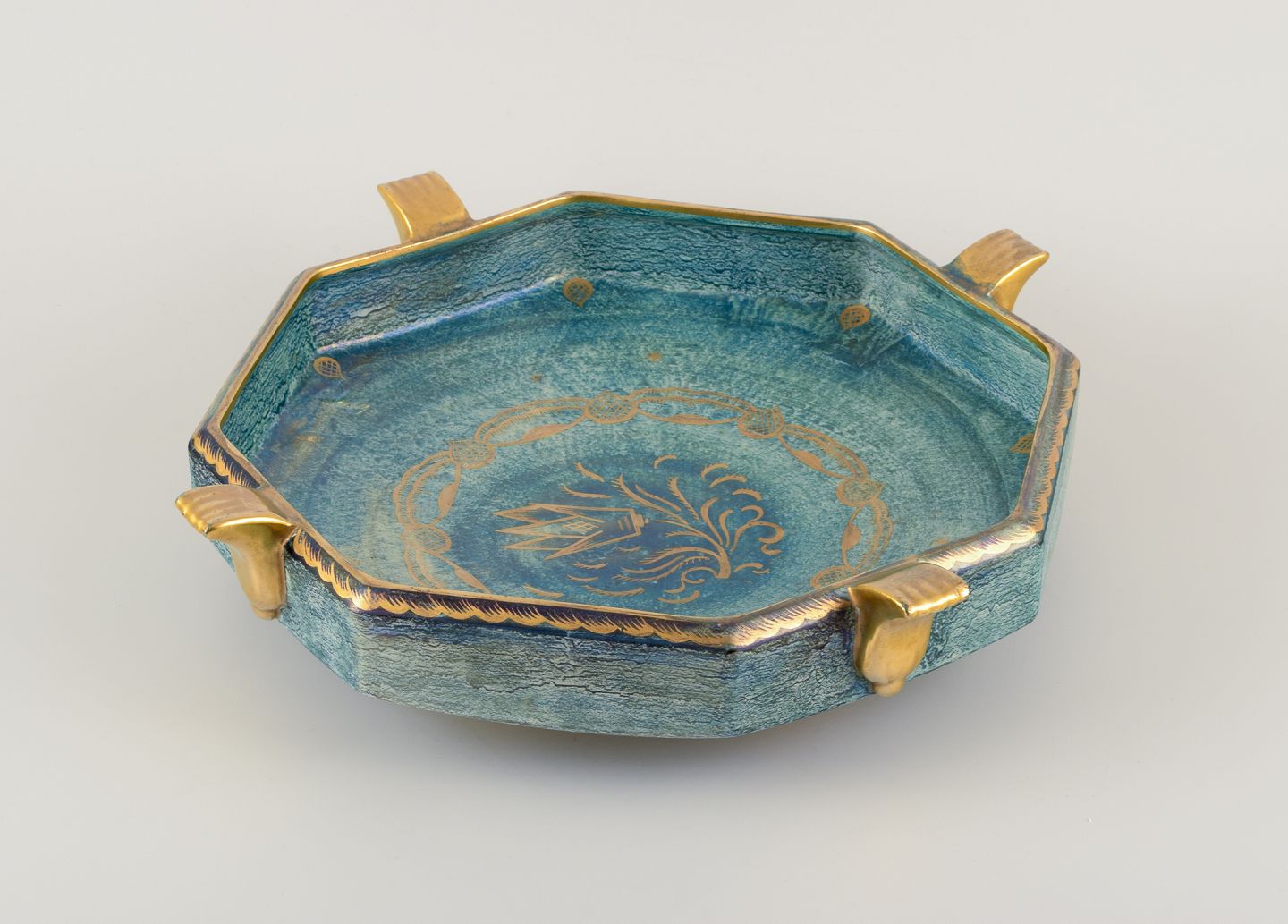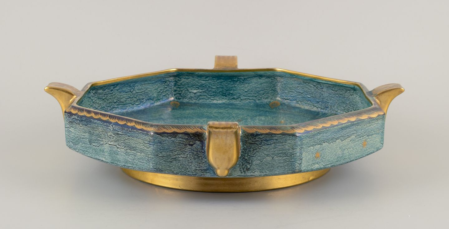 Josef Ekberg (1877-1945) for Gustavsberg, Sverige.Stor ottekantet skål af keramik. Håndmalet i grønne toner med gulddekoration.