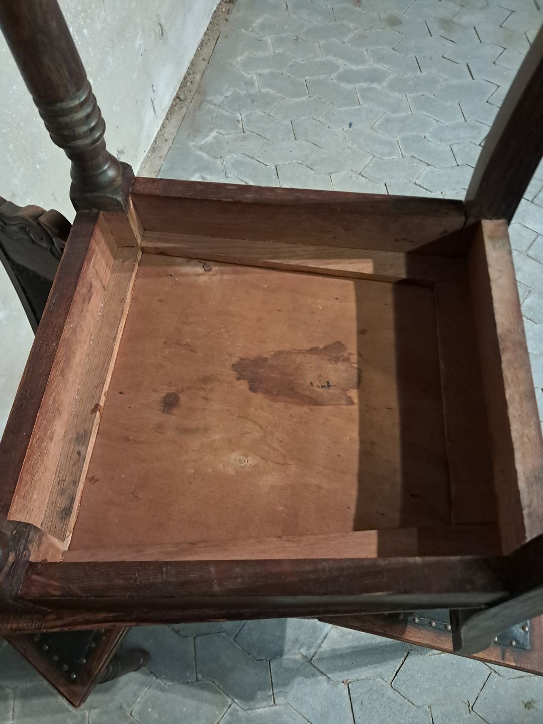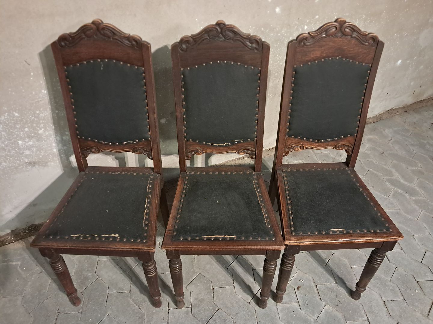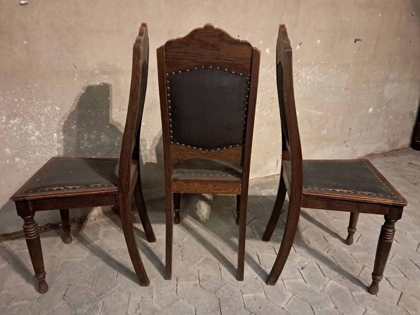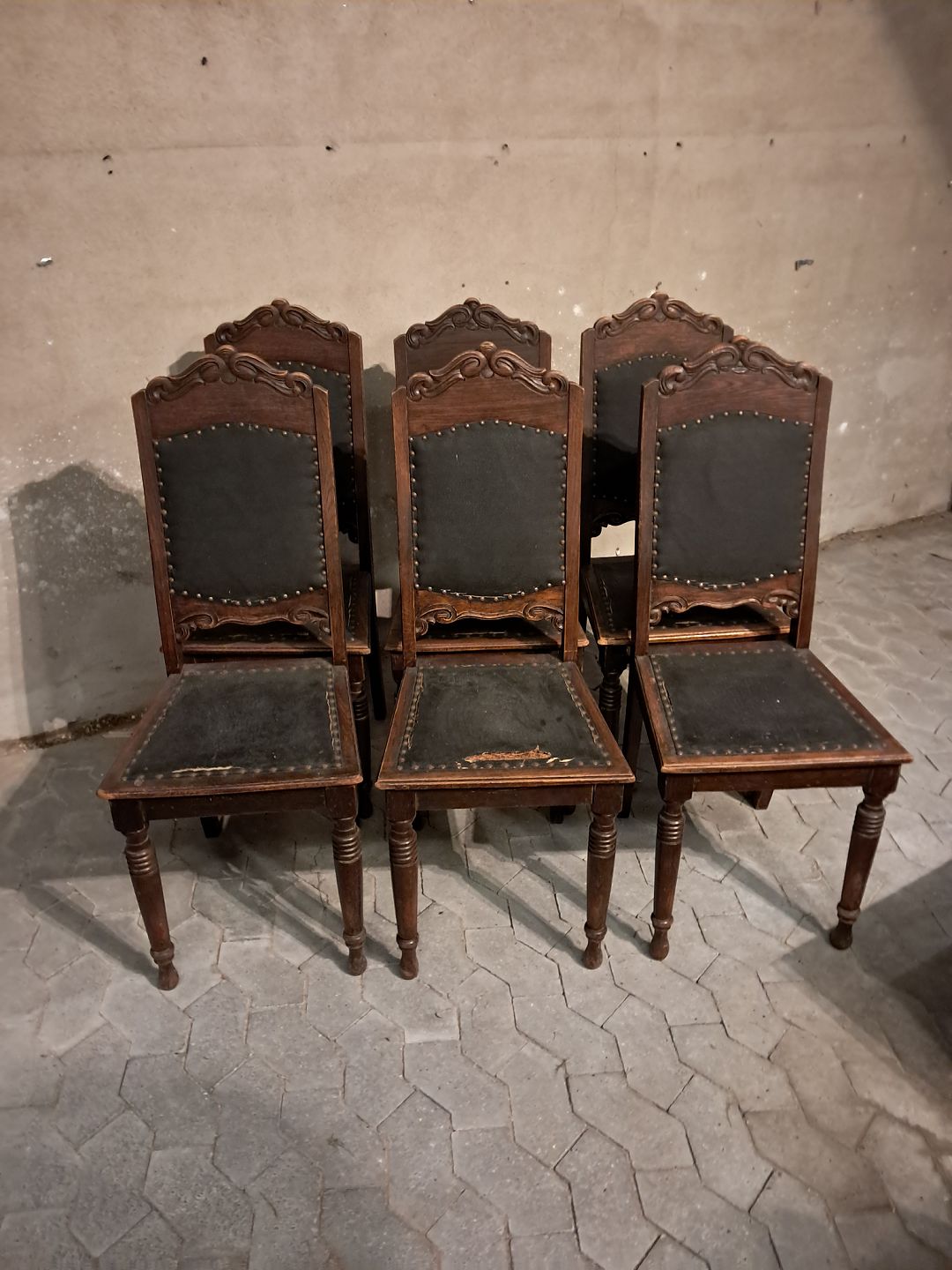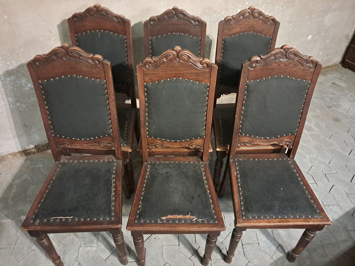 6 Stole i massivt egetræ, fra 1910erne.De har brugsspor og betrækket er defekt.