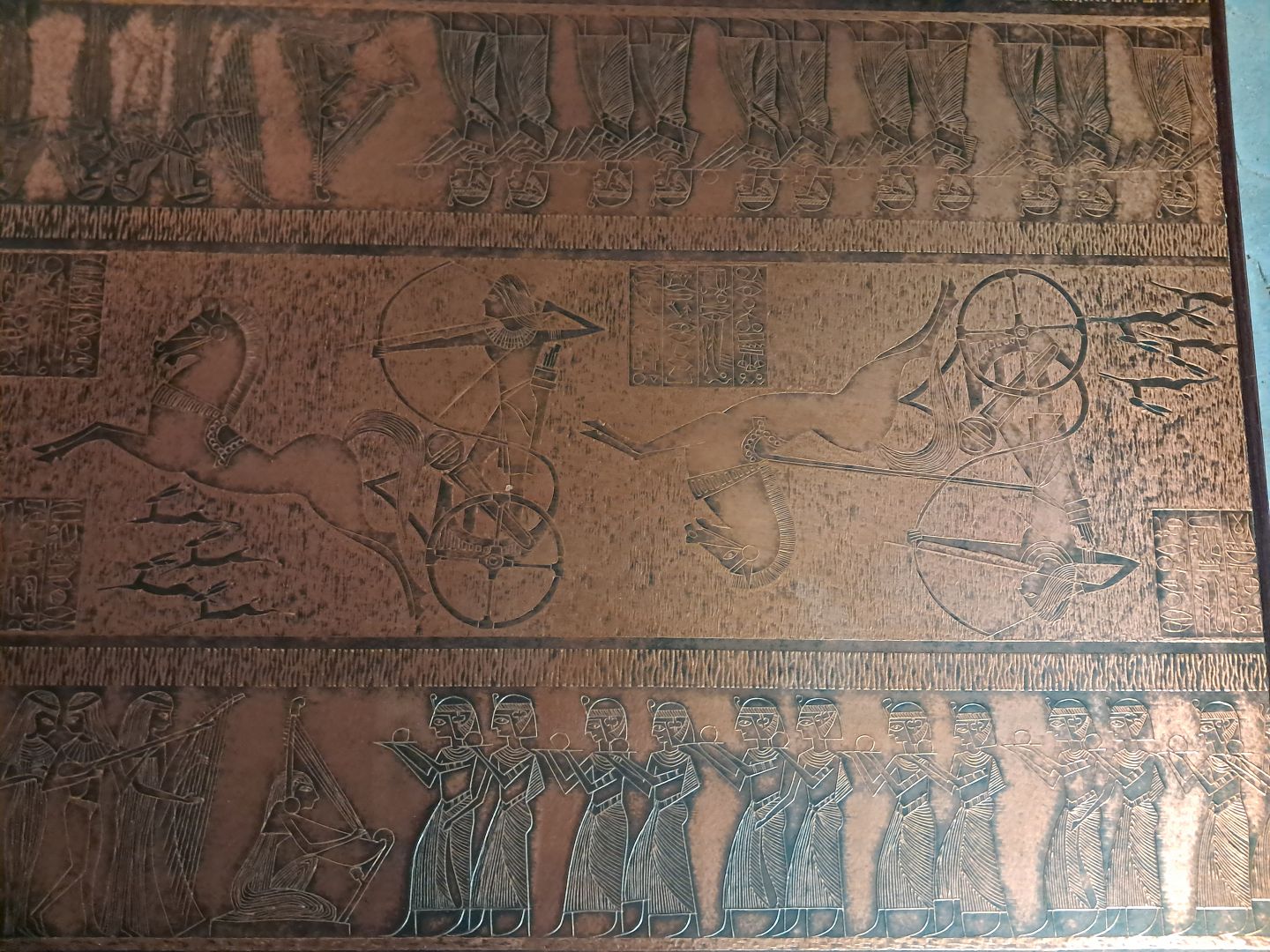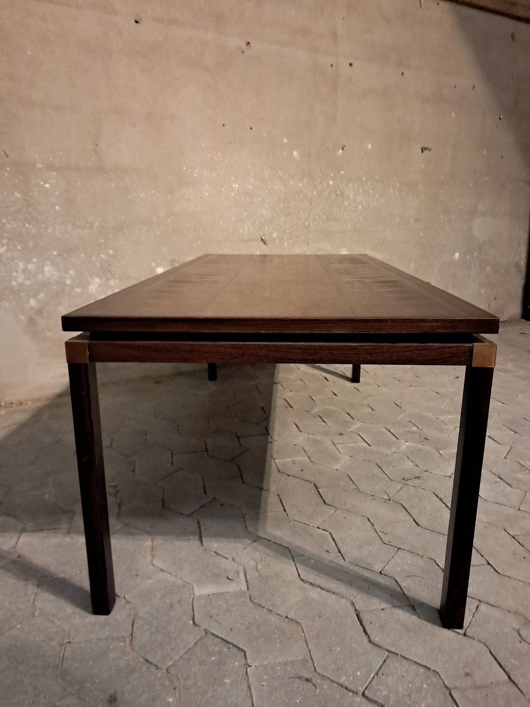 Sofabord med egyptiske motiver i palisander med metalplade, fra 1970erne.Det har små brugsspor.
