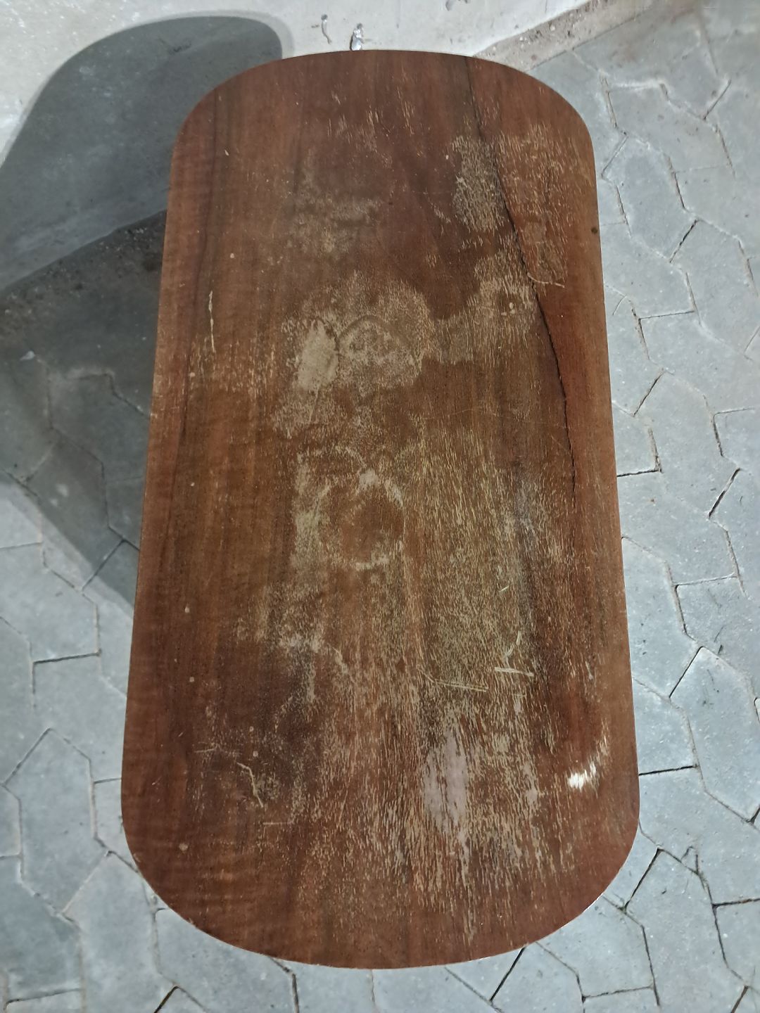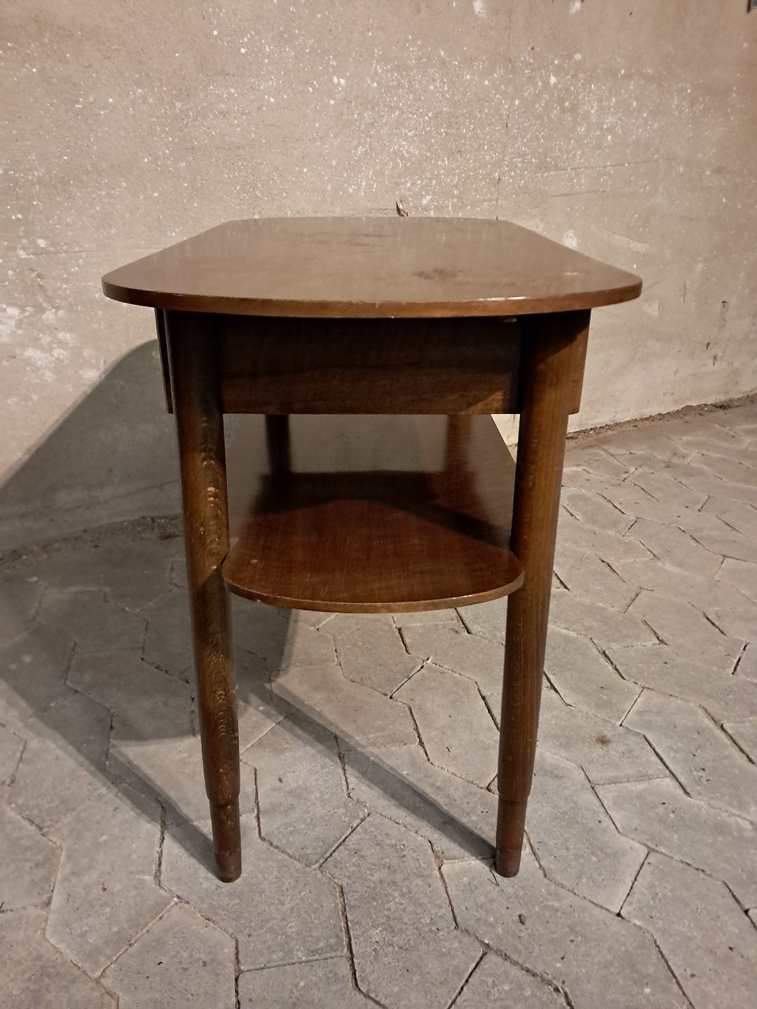 Lampebord med skuffe i fineret nødetræ, fra 1950erne.Bordpladen har en del brugsspor.