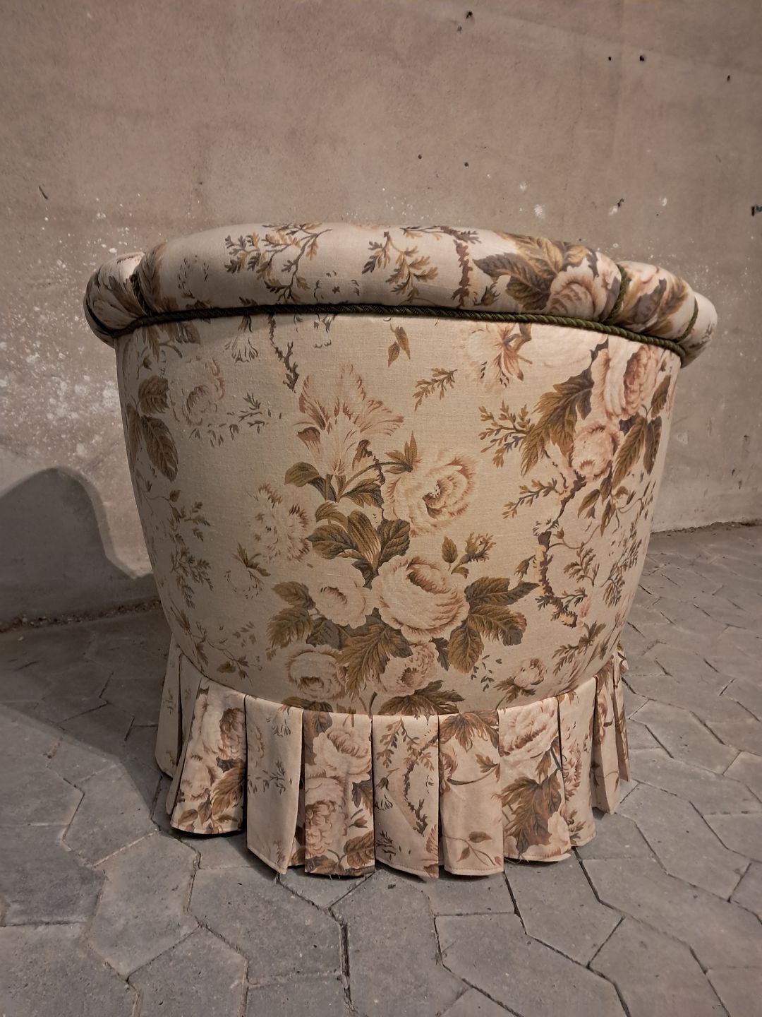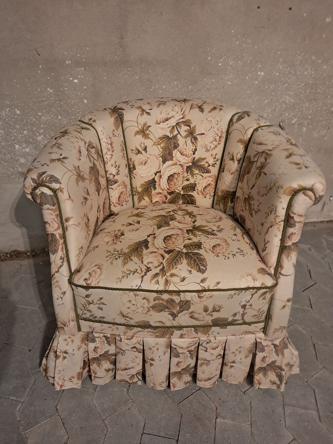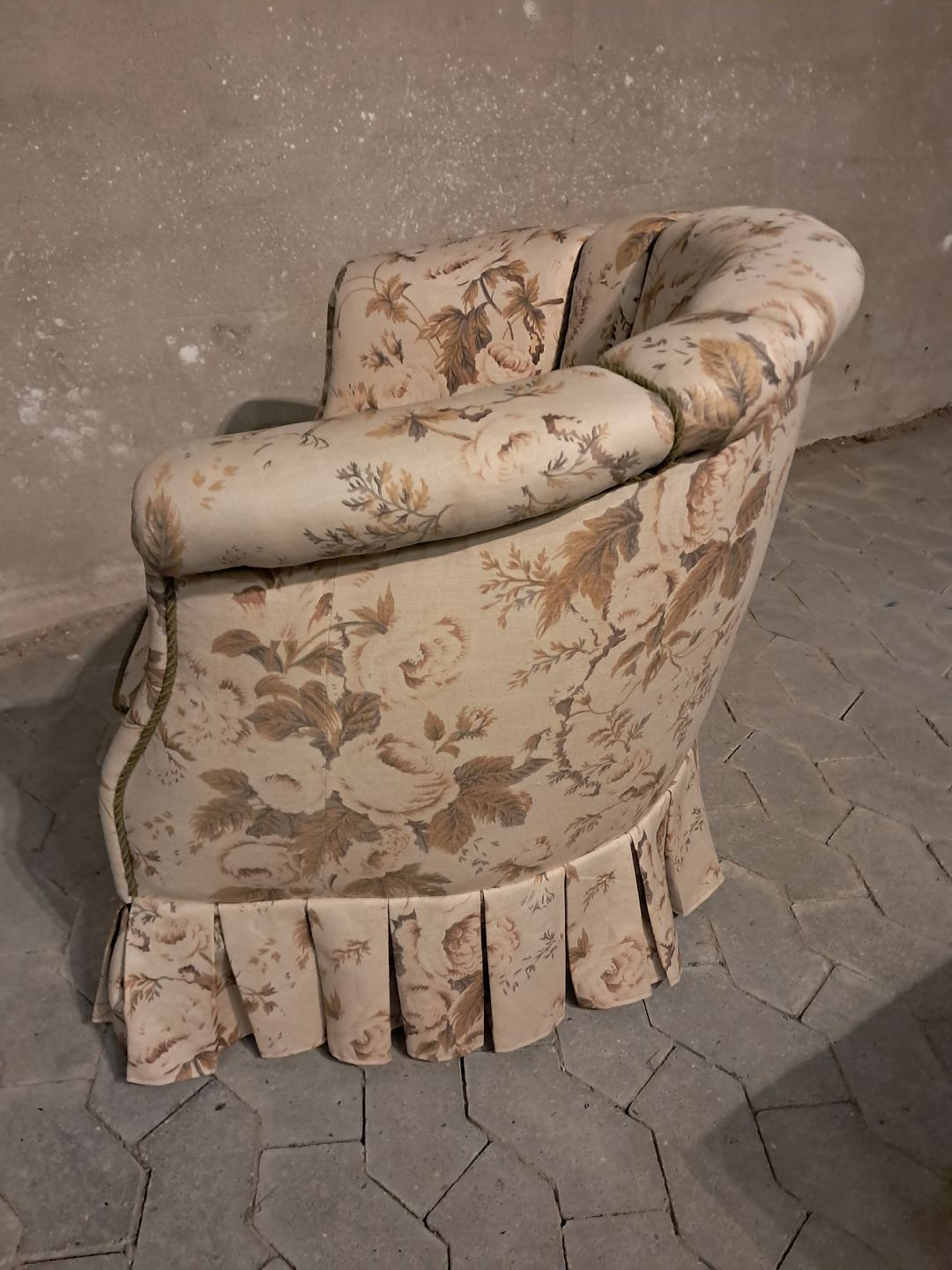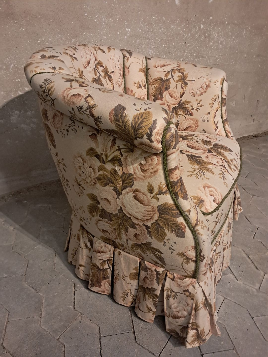 Lænestol med blomstret betræk, fra 1950erne.Den har brugsspor.