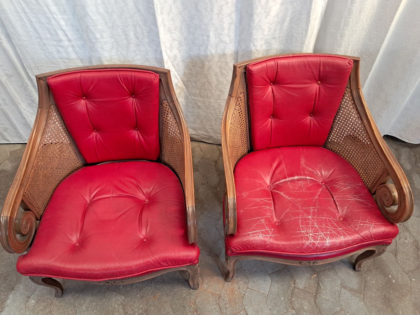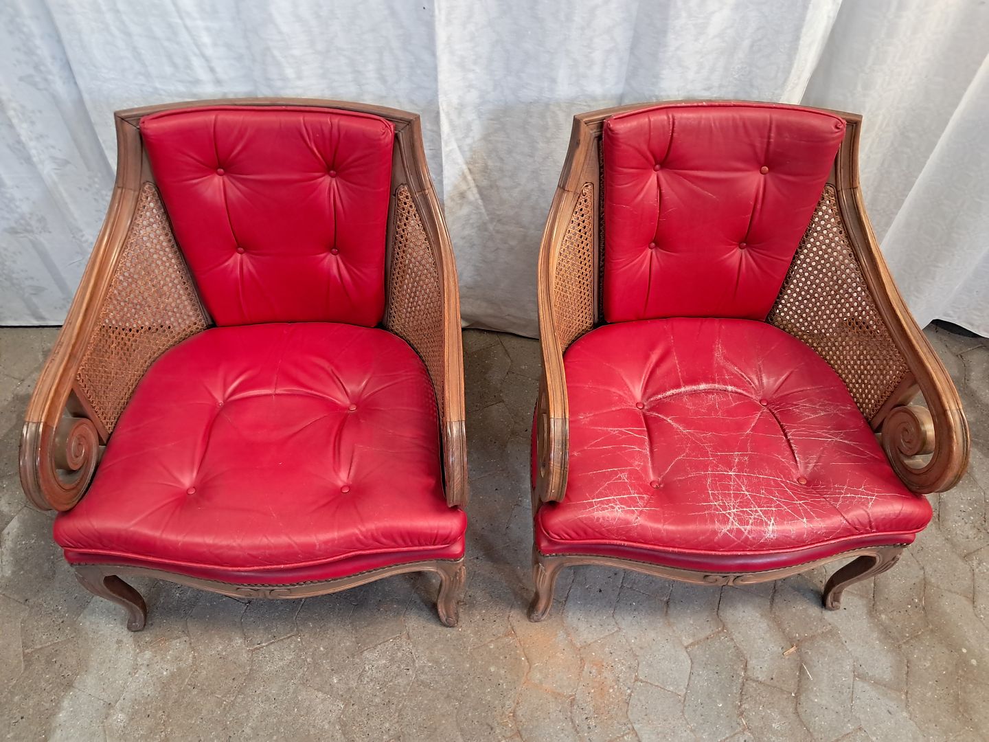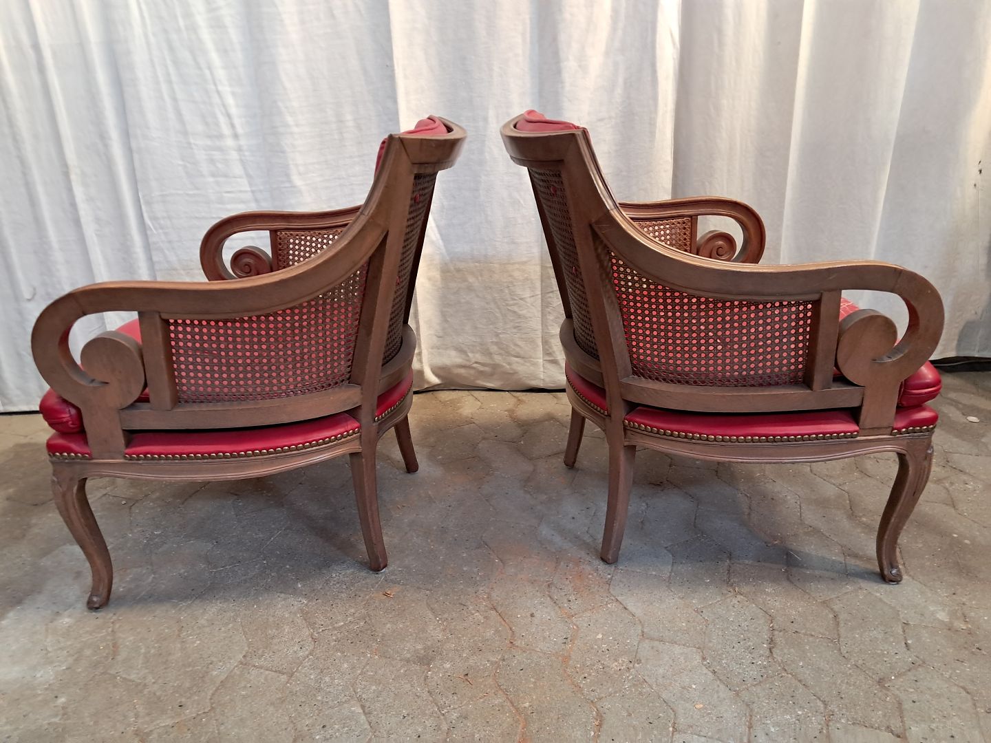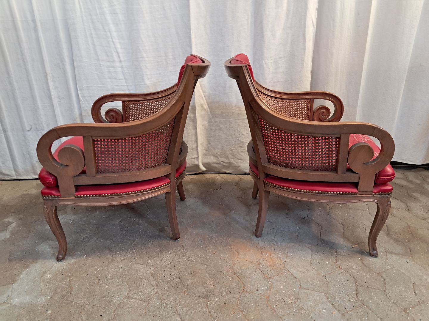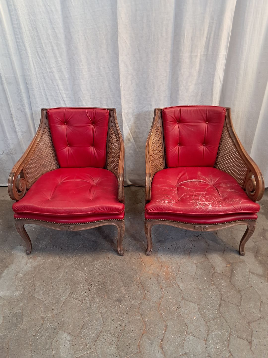 2 Lænestole i massivt bøgetræ med rørflet og læderhynder, fra 1980erne.De har brugsspor..