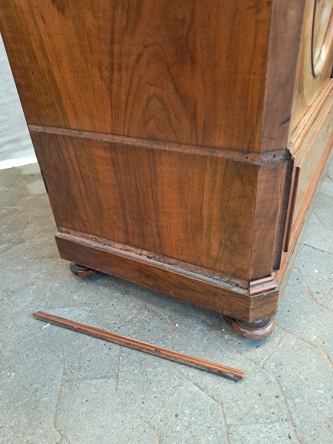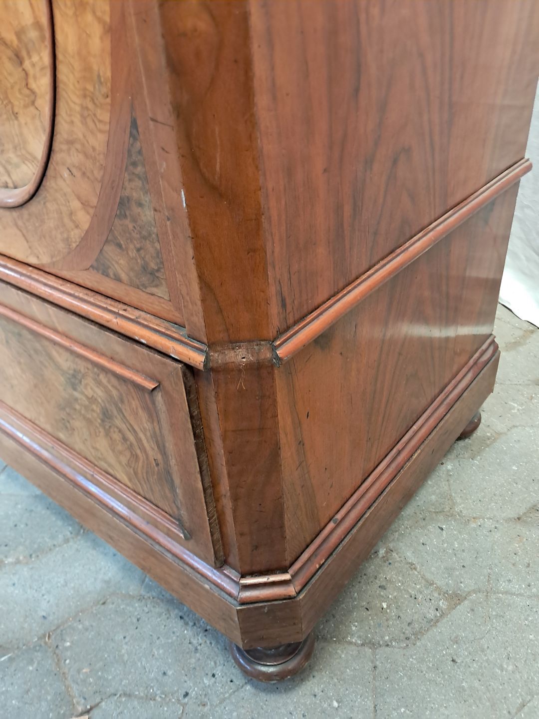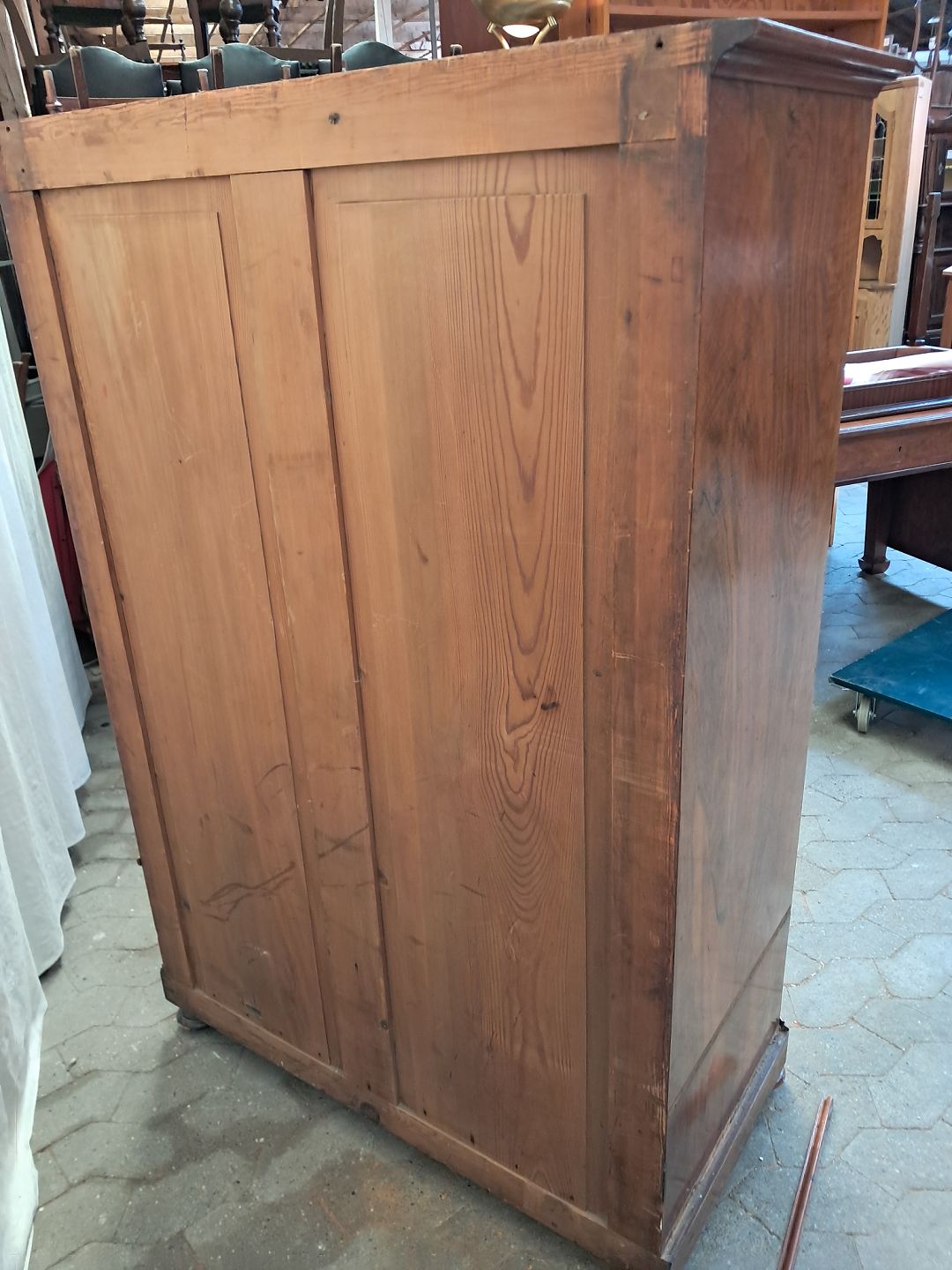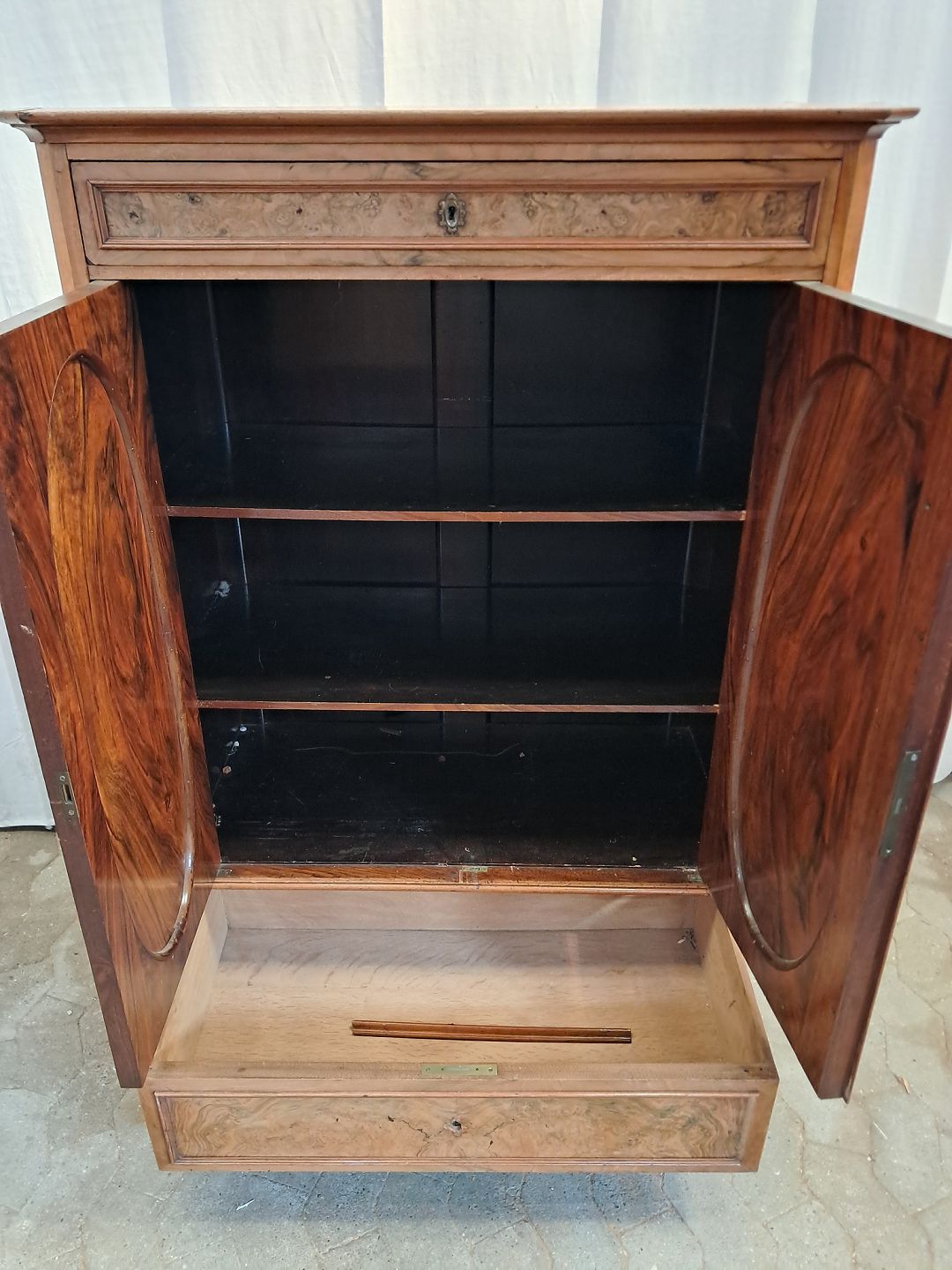 Skab i fineret mahogni, fra 1900erne.Det har brugsspor og mangler sidelister.