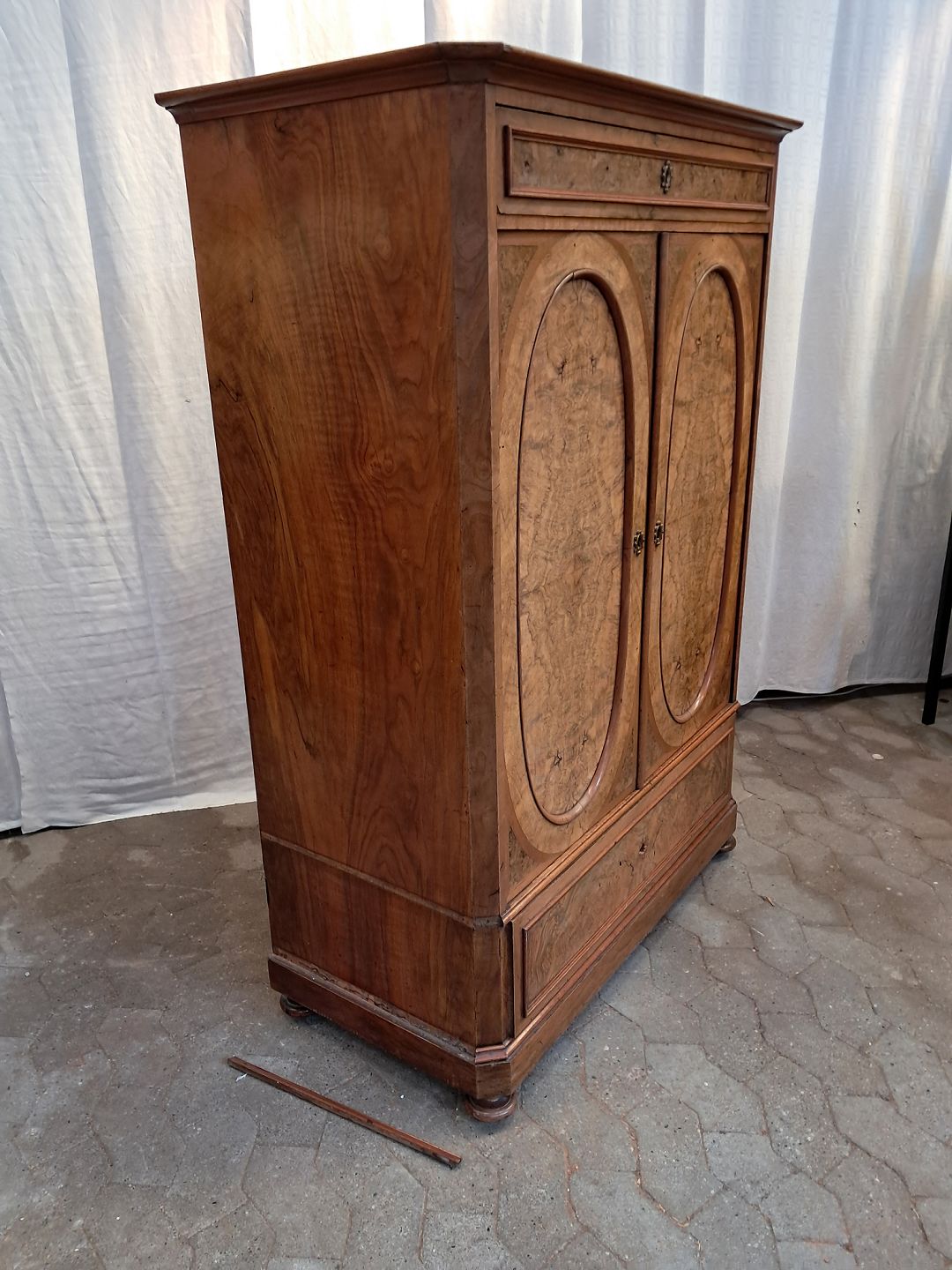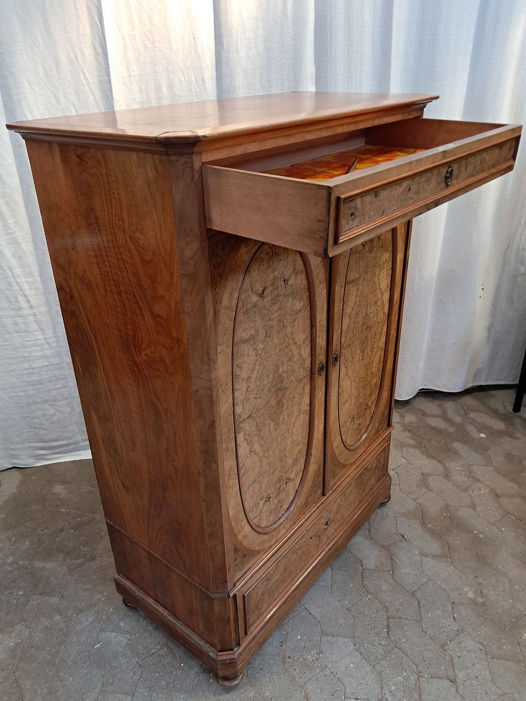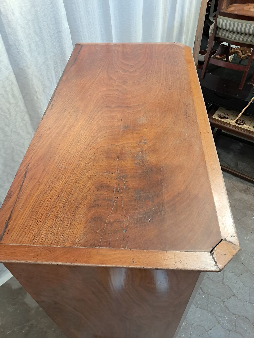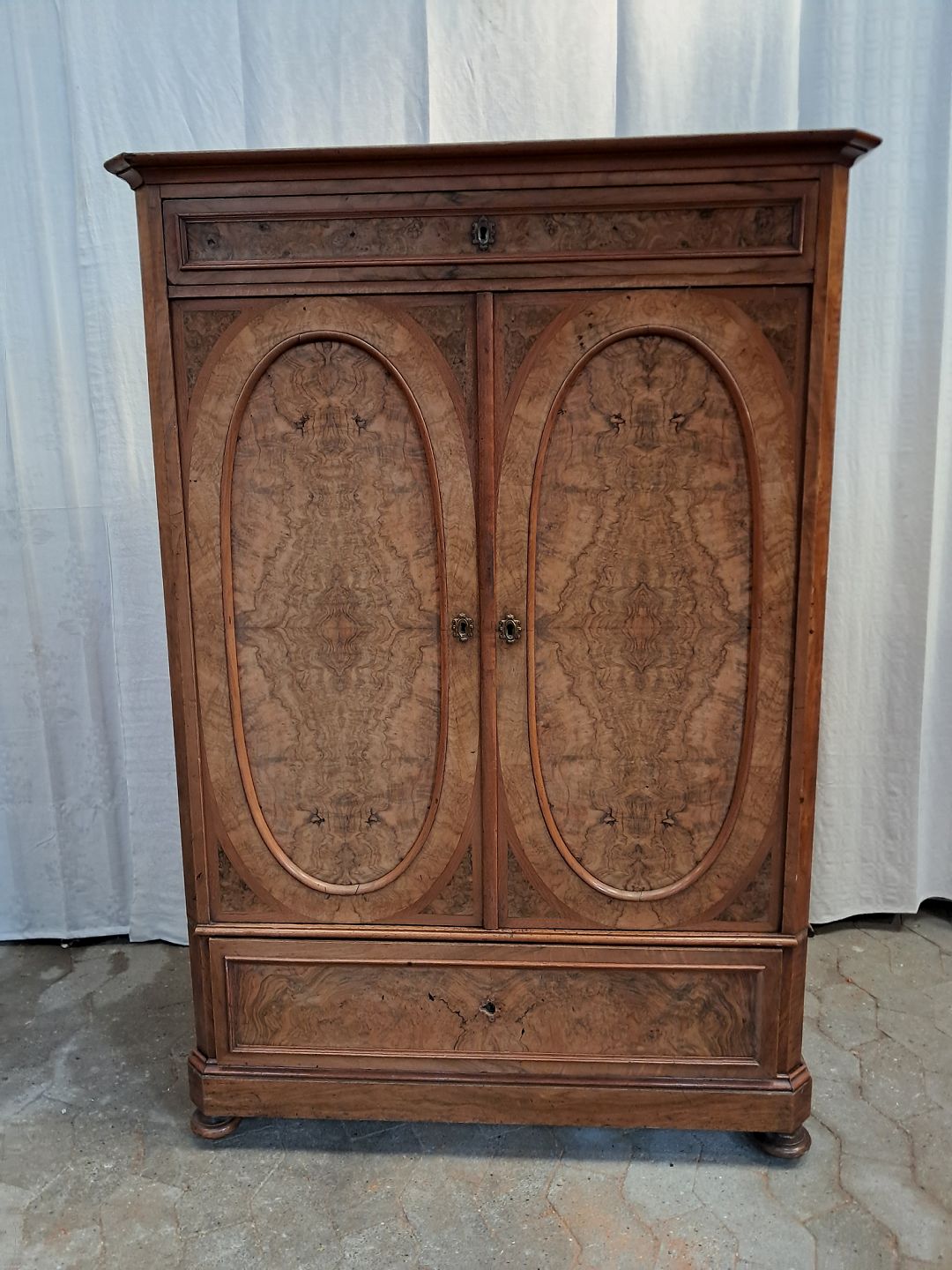 Skab i fineret mahogni, fra 1900erne.Det har brugsspor og mangler sidelister.