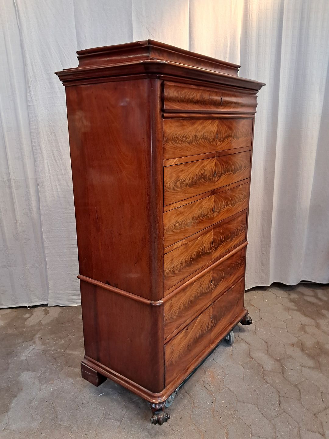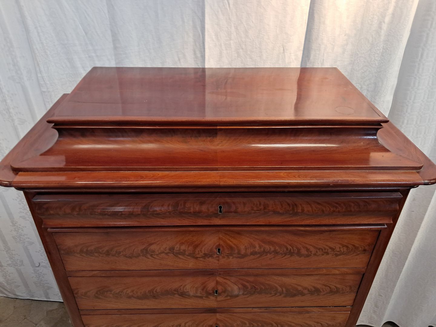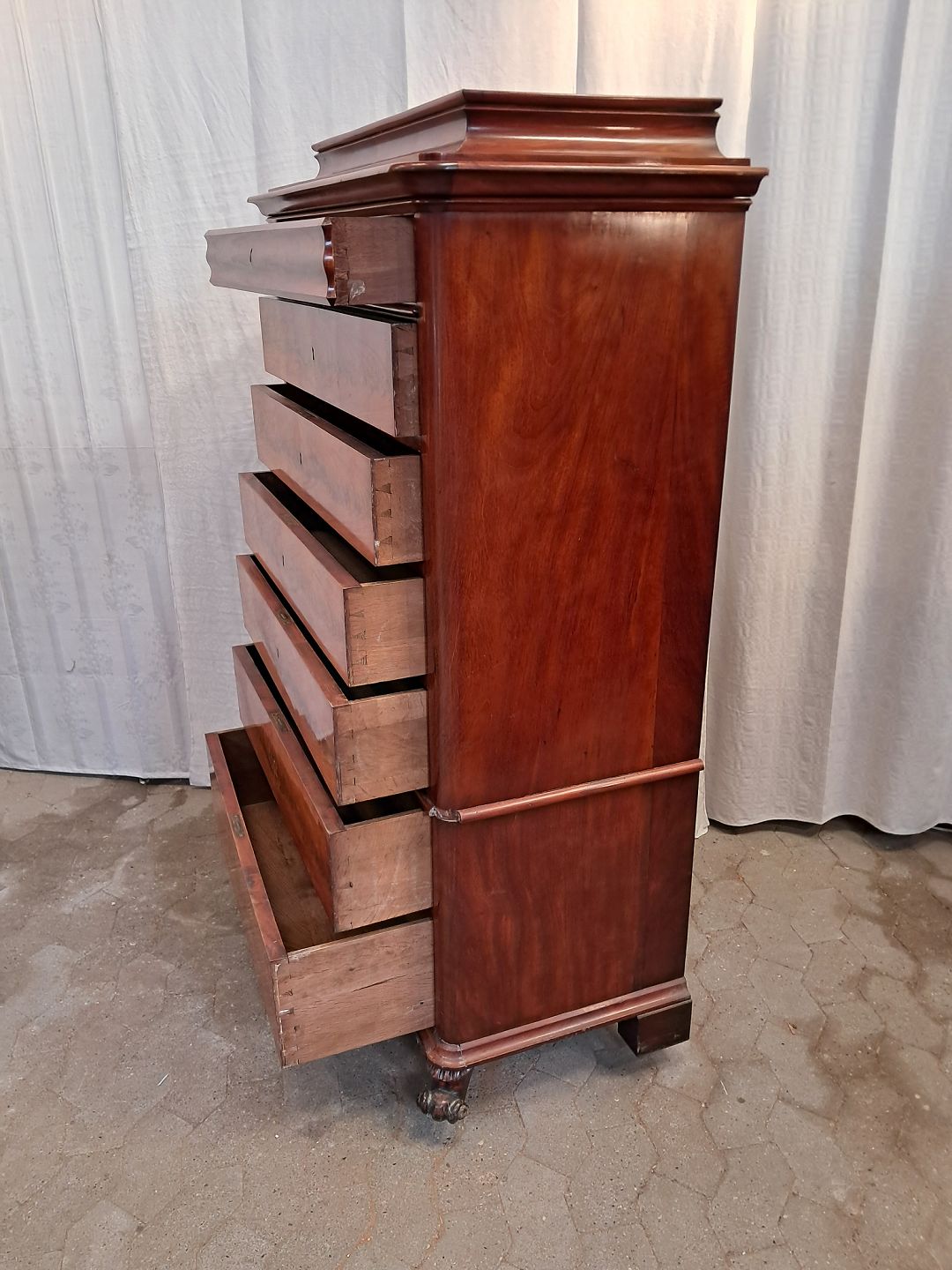 Chiffoniere i fineret mahogni, fra 1900erne.Den har brugsspor og en defekt på toppen.
