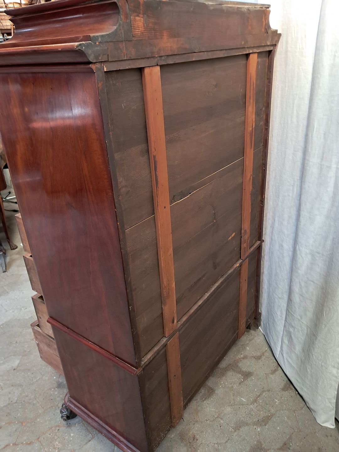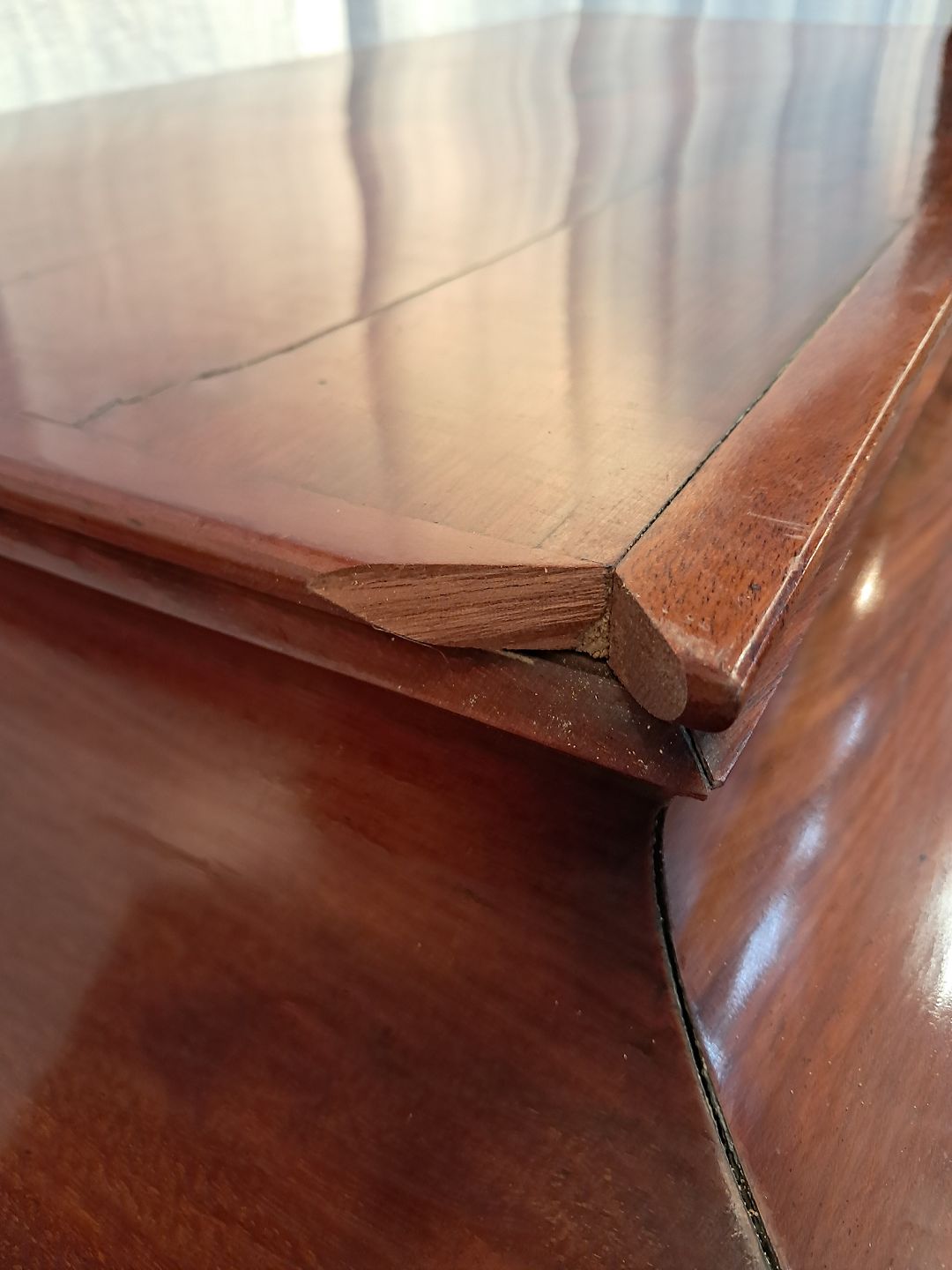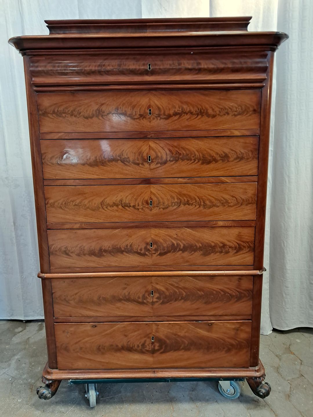 Chiffoniere i fineret mahogni, fra 1900erne.Den har brugsspor og en defekt på toppen.