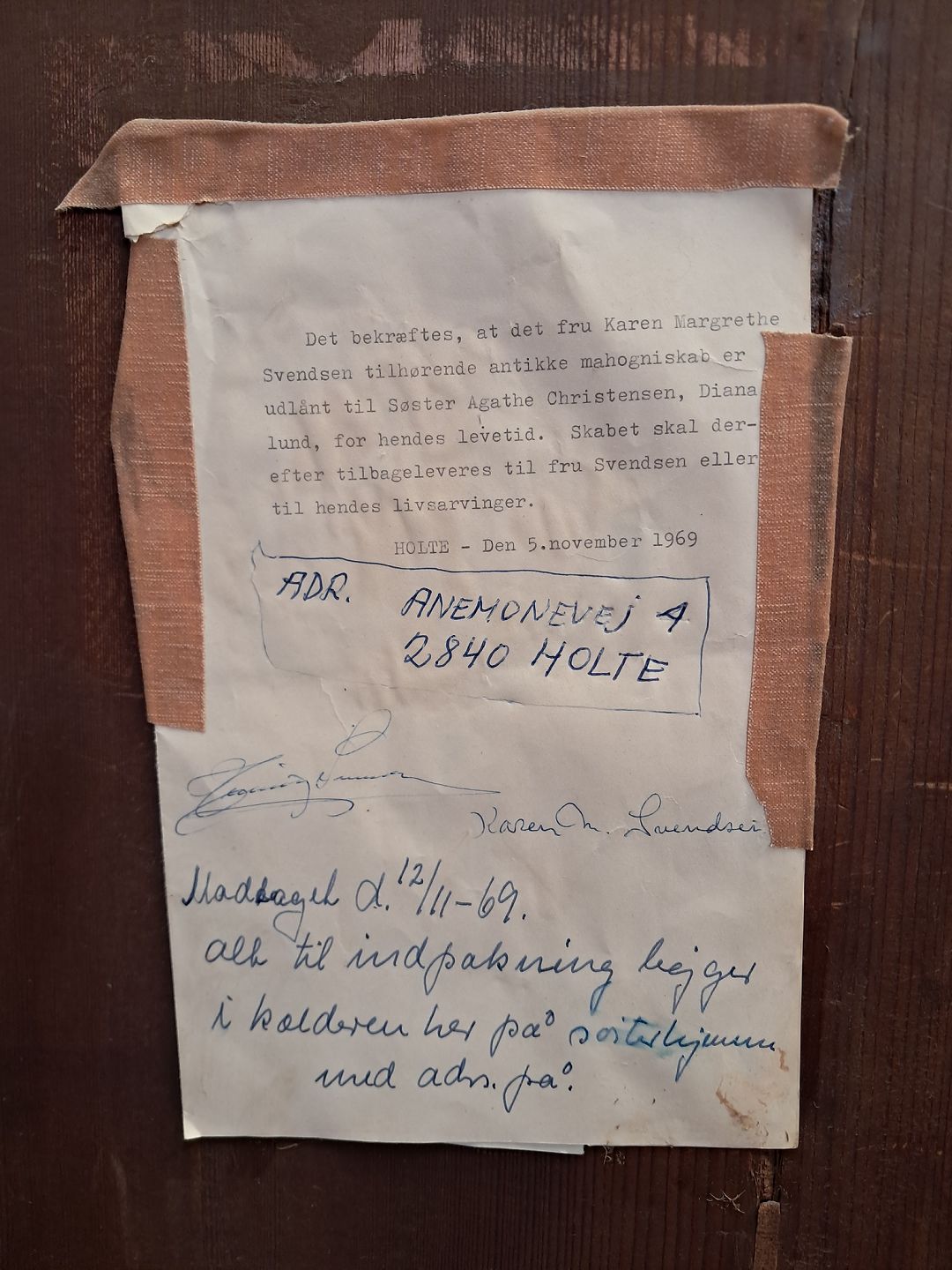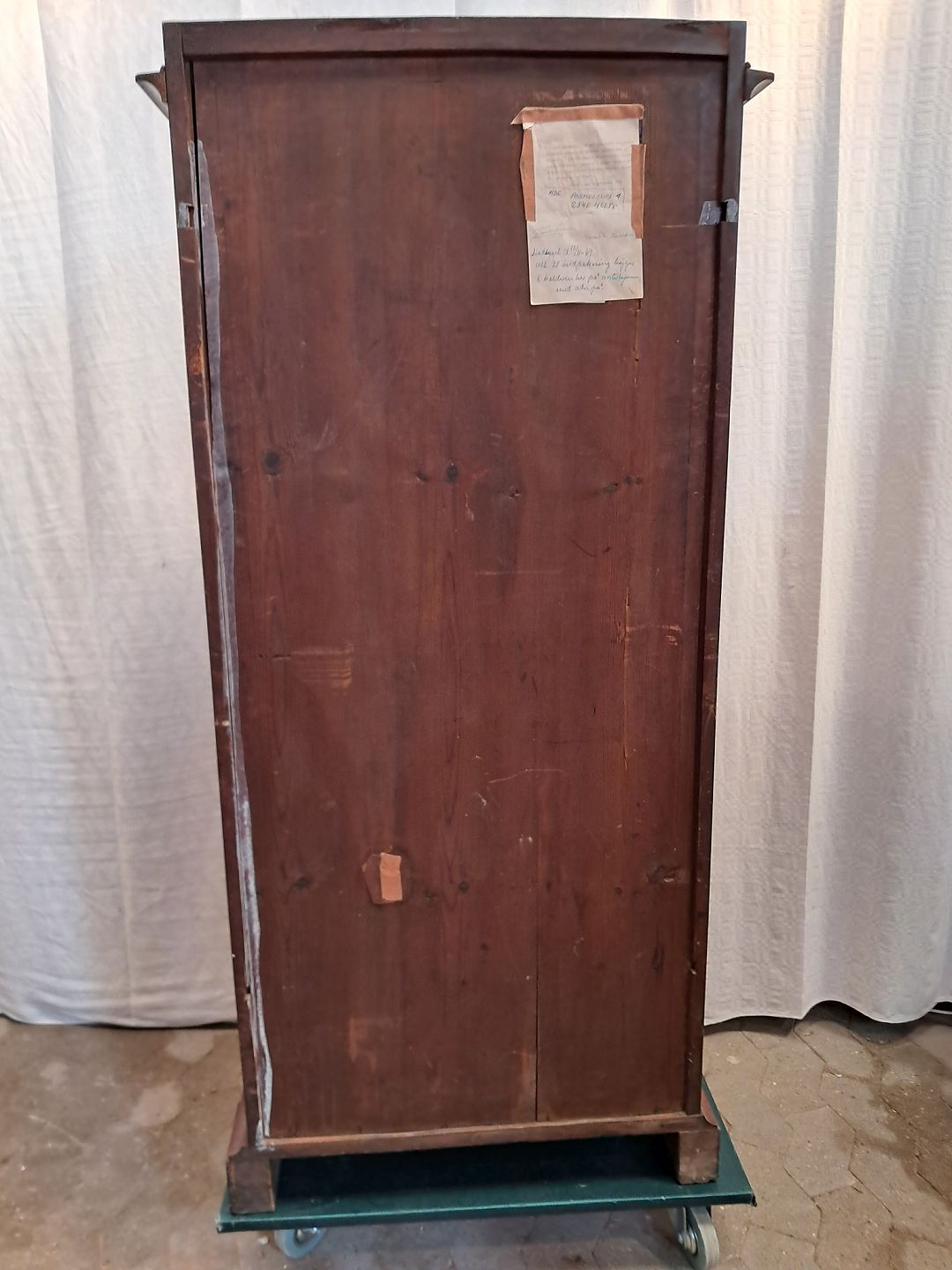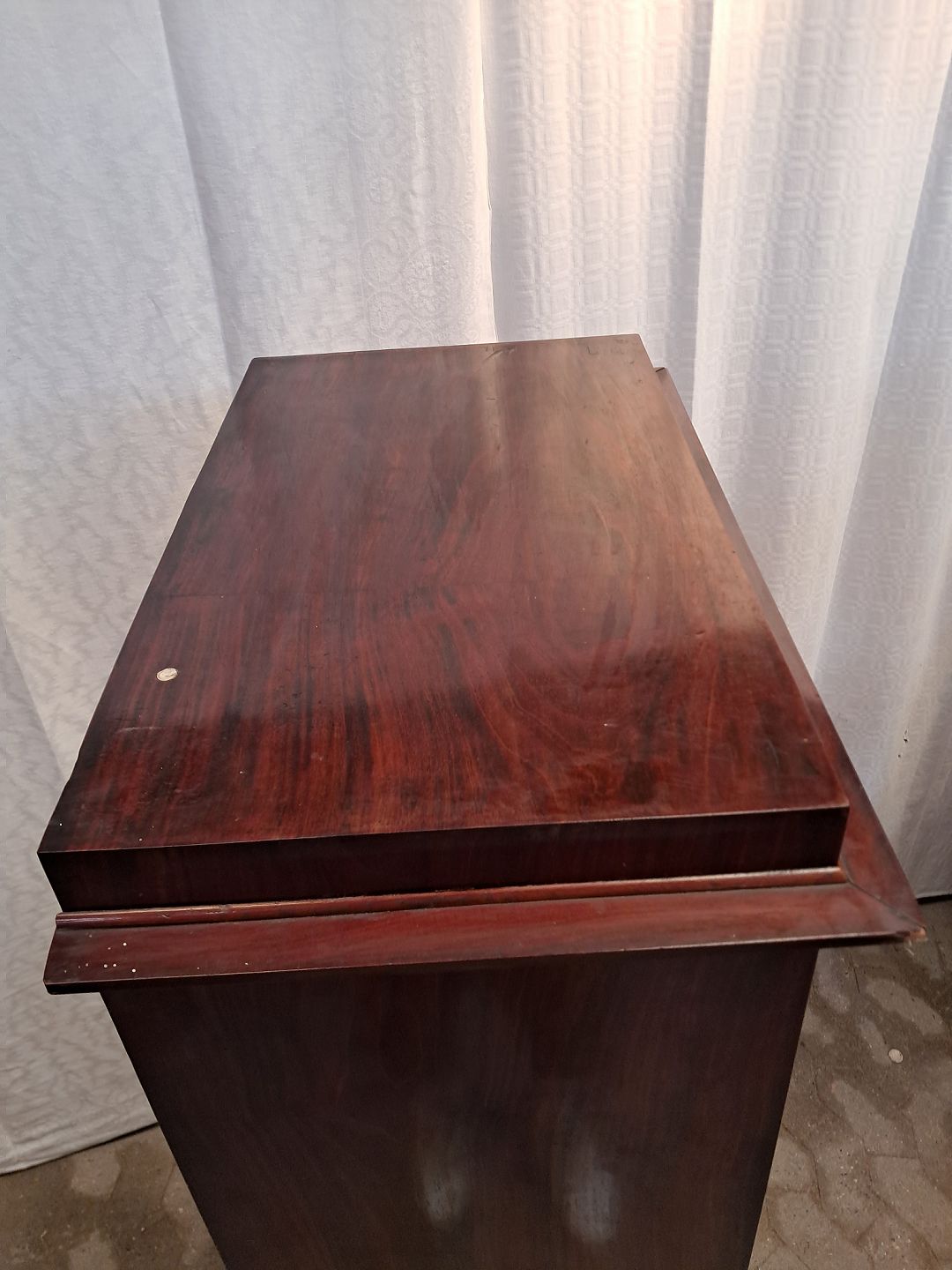 Skab i fineret mahogni, fra 1900erne.Det har brugsspor og en defekt på hjørnet.