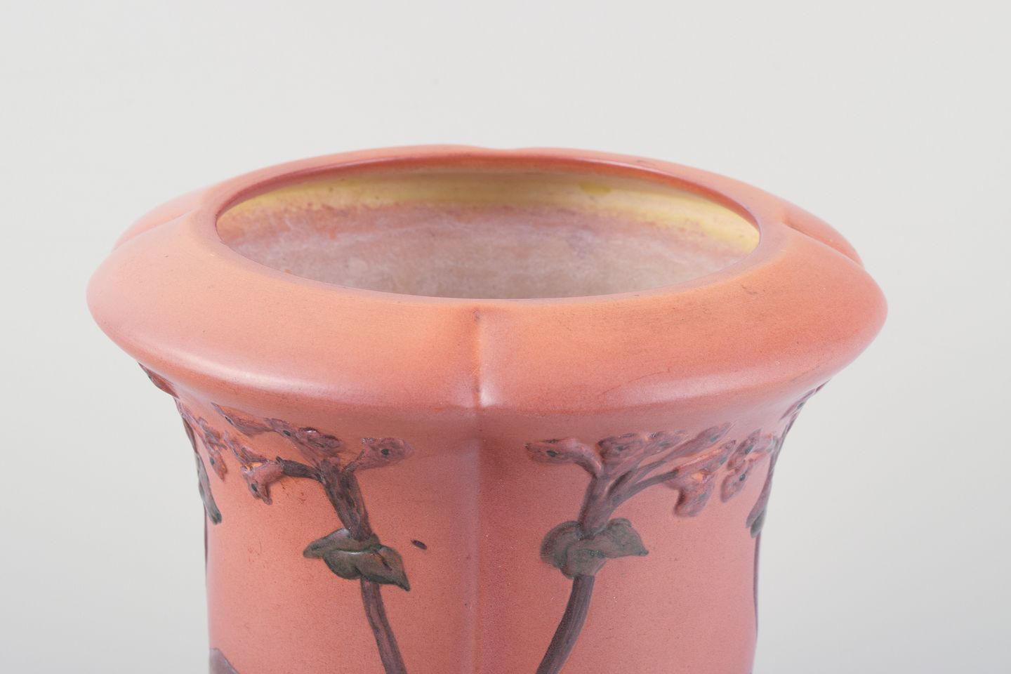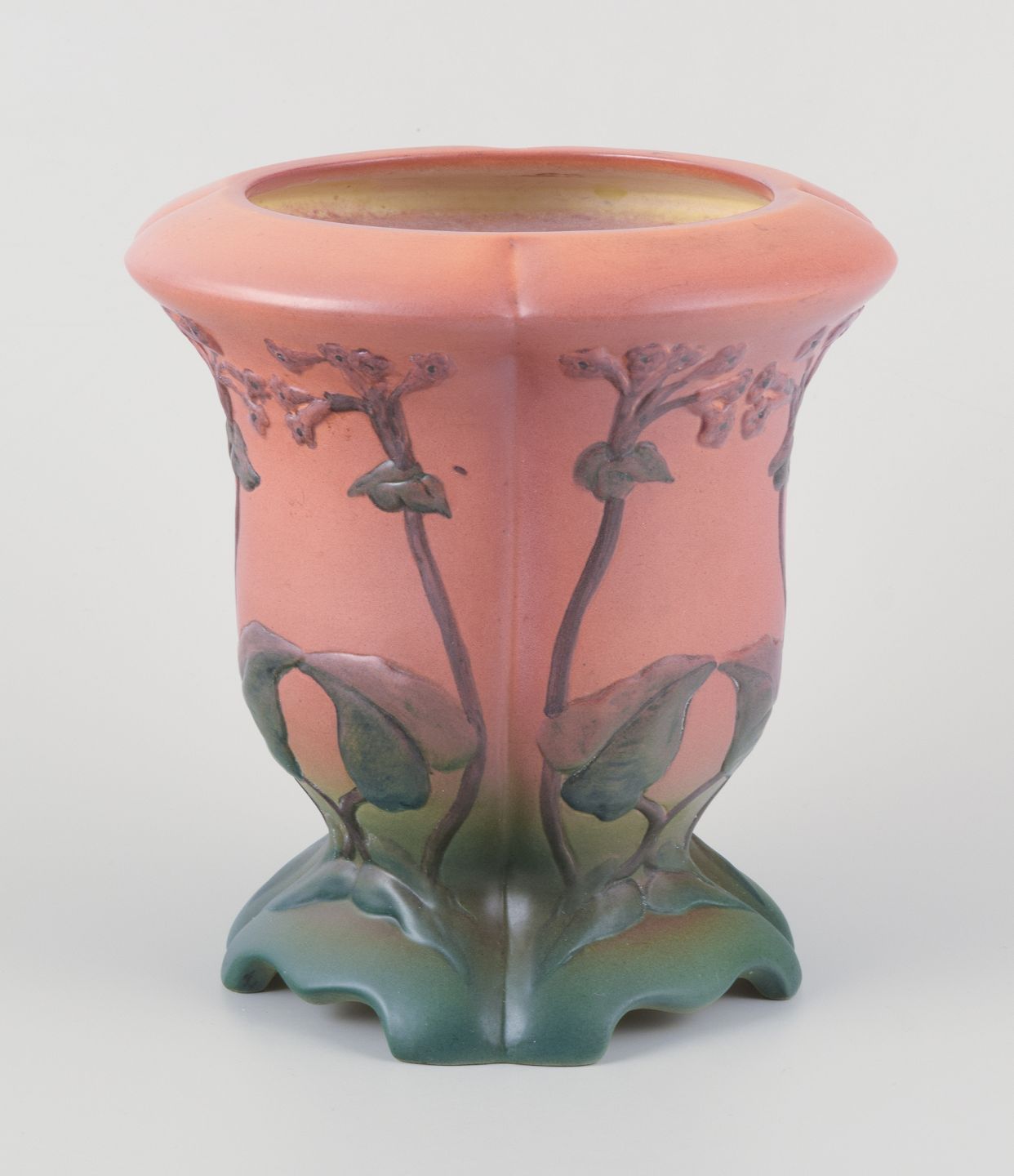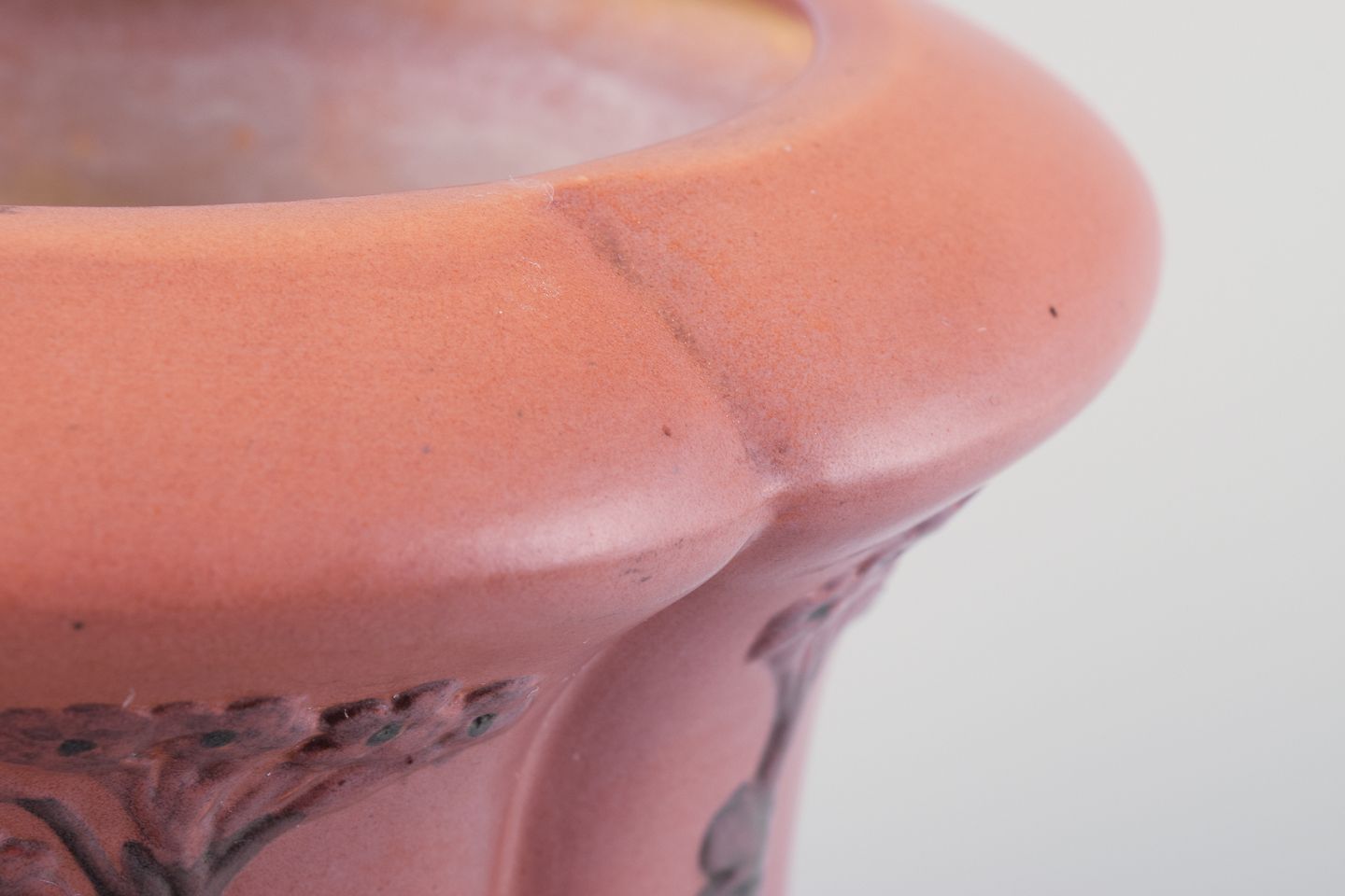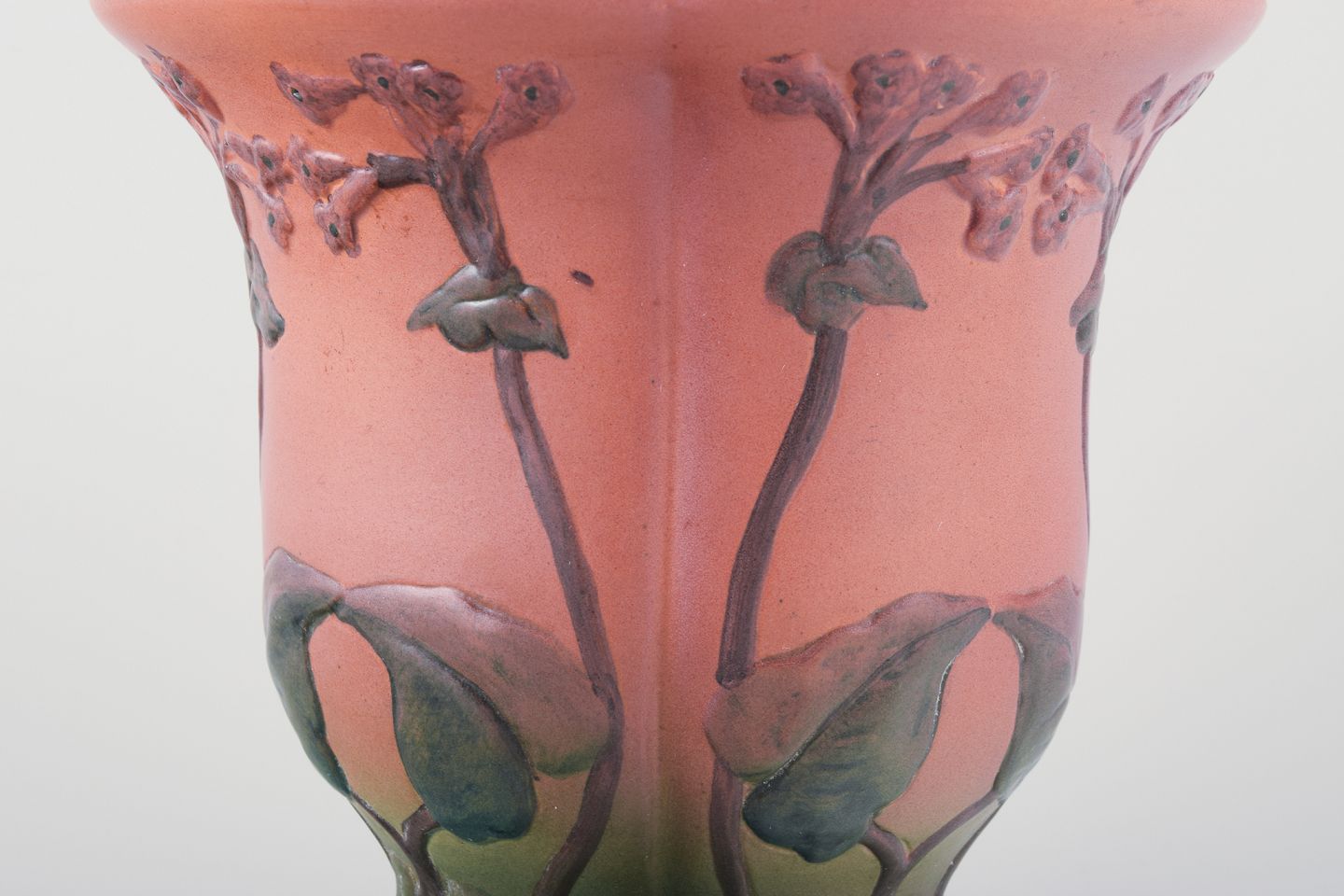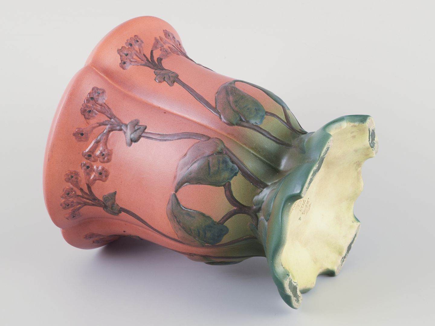 Ipsens Enke, keramikvase med glasur i orange og grønne toner.Blomstermotiver i relief.