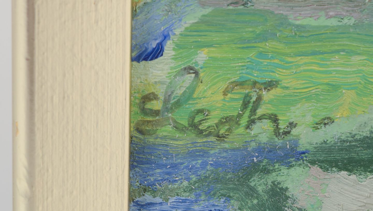 Leo Thellefsen (1909 - 1997), olie på plade.Modernistisk landskab.