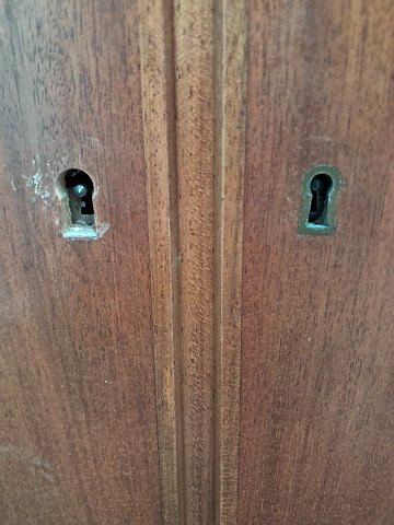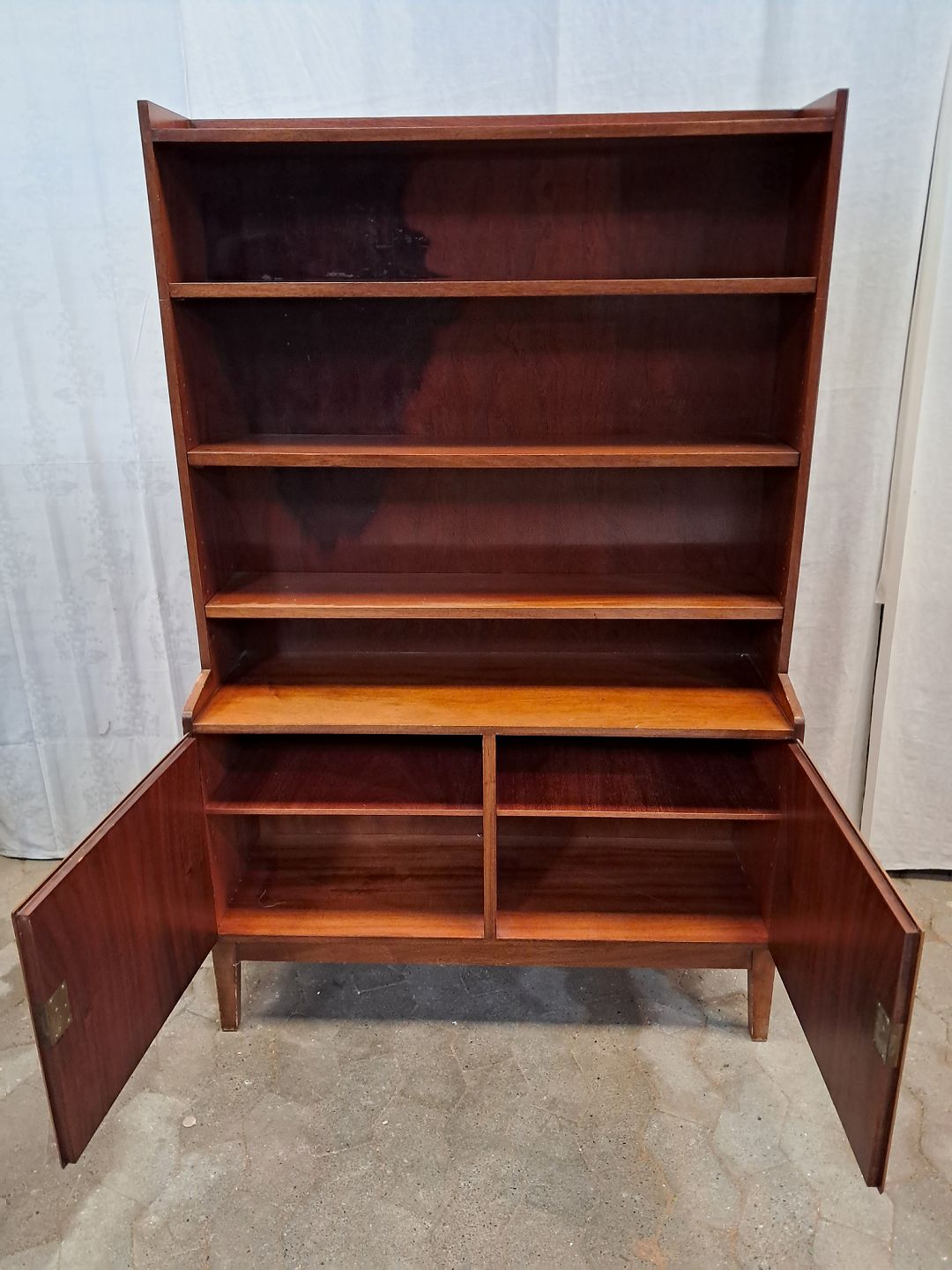 Reol i fineret nødetræ, fra 1950erne.Den har brugsspor og mangler et låsebeslag. (se foto)
