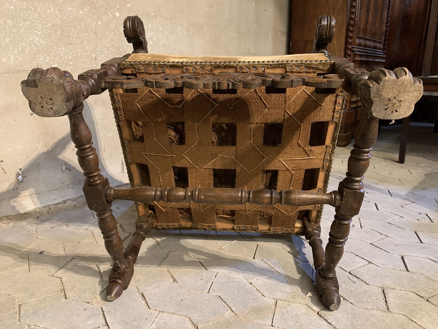 Armstol i massivt egetræ med broderet betræk, fra 1930erne.Den har brugsspor.