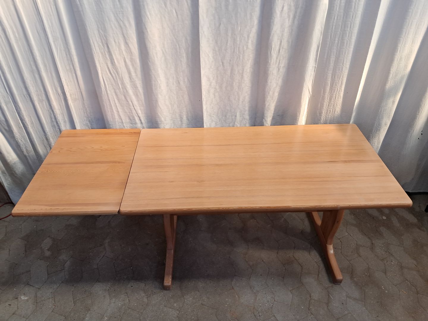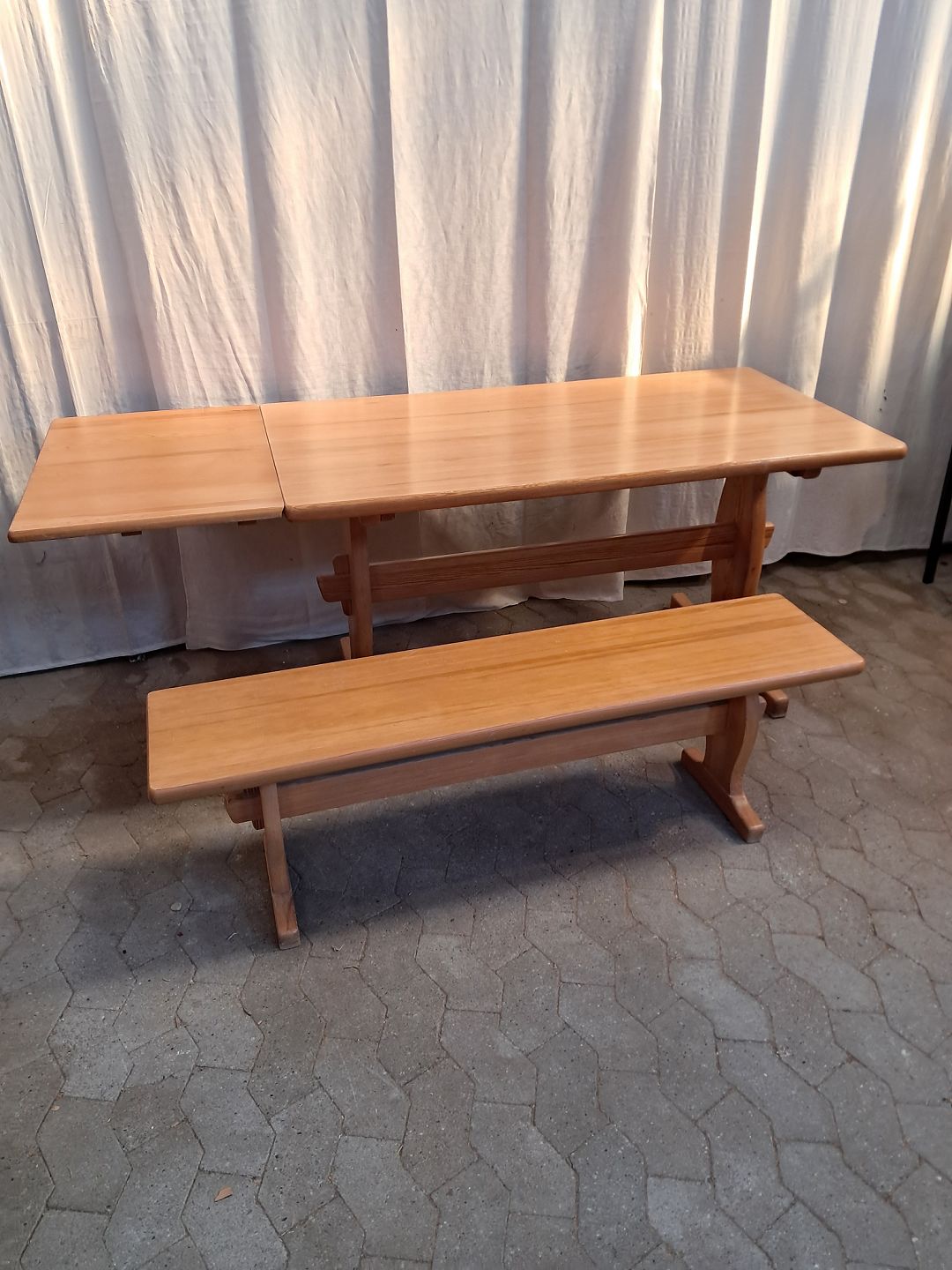 Bord og bænk i massivt fyrretræ, fra 1990erne.De har brugsspor og der medfølger en tillægsplade.