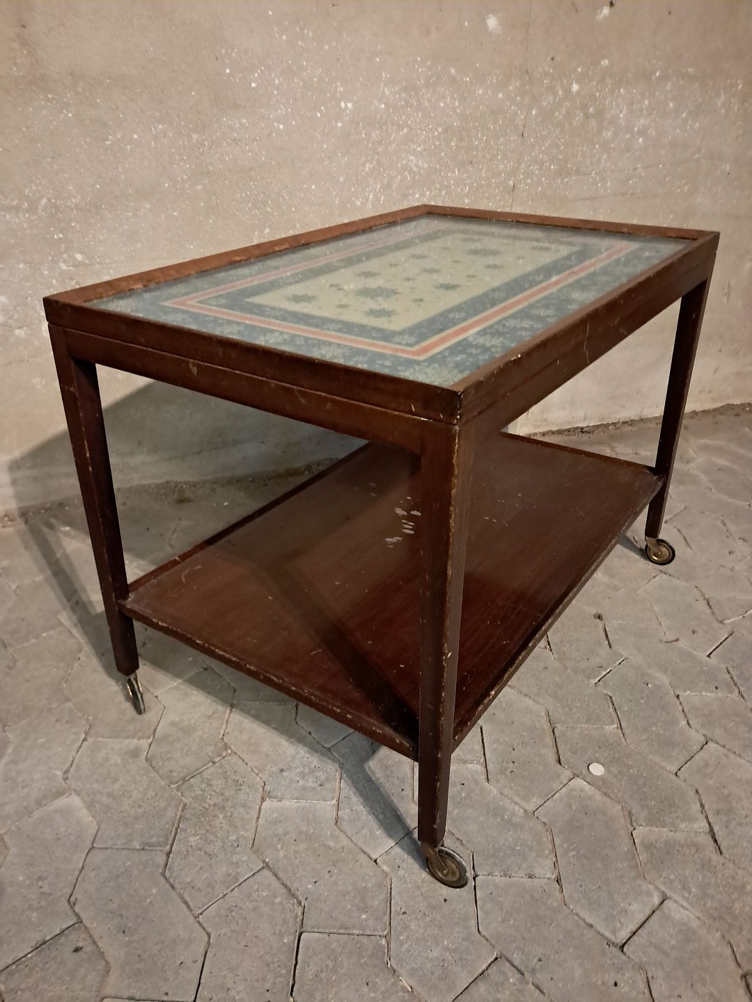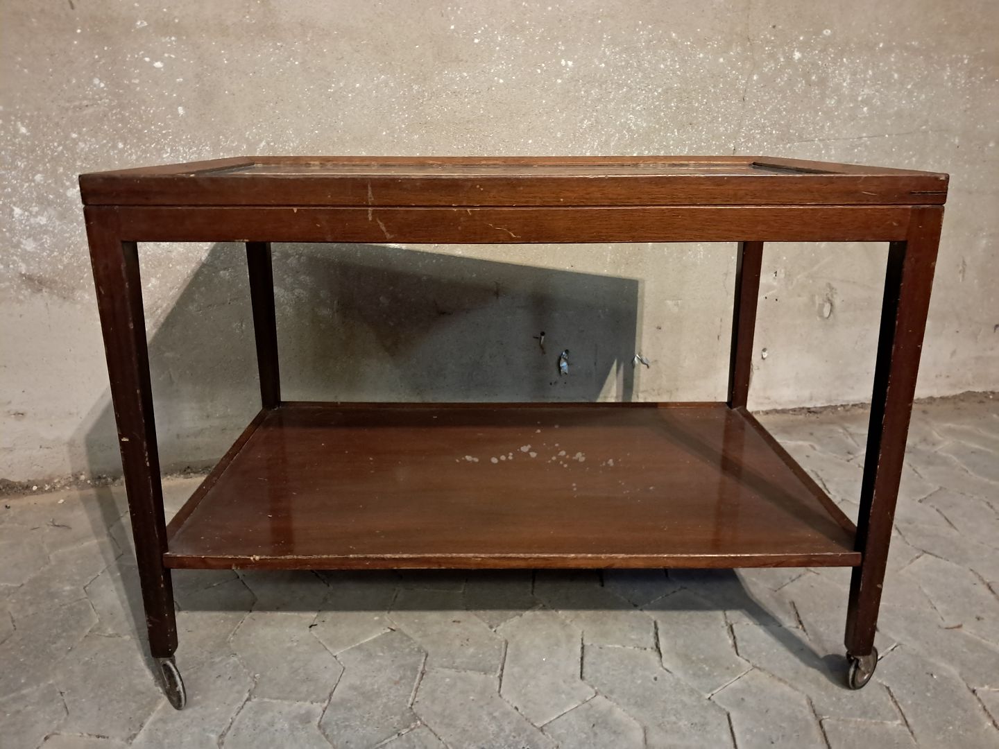 Bord i bøgetræ med glasplade, fra 1950erne.Det har brugsspor/ridser.