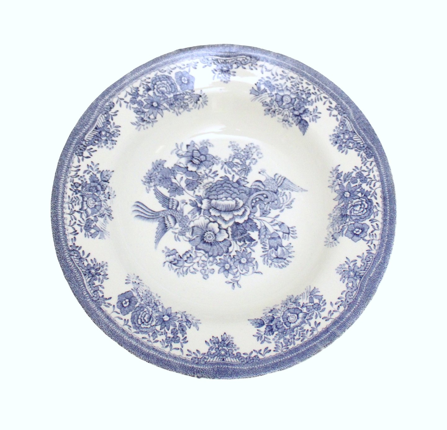 Egersund, Norway, Blå Fasan. Dyb middagstallerken. Fajancestel med blomster og 2 fasaner. Der er farveforskel og forskellige stempler alt efter, hvornår de er produceret. Diameter 22 cm. Højde 3,5 cm. Almindeligt brugsslid, men ingen krakeleringer. Pris: 75 kr. stk. Lager: 2 Udstiller