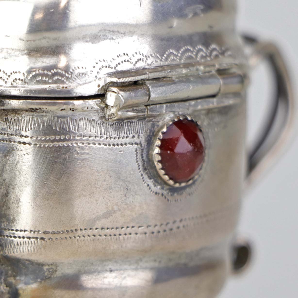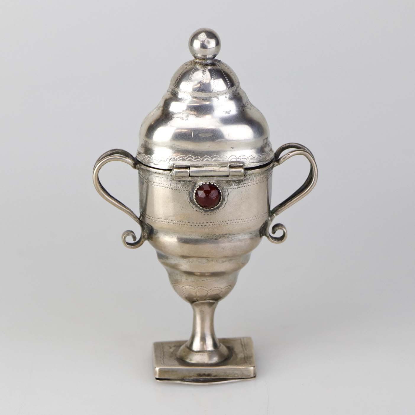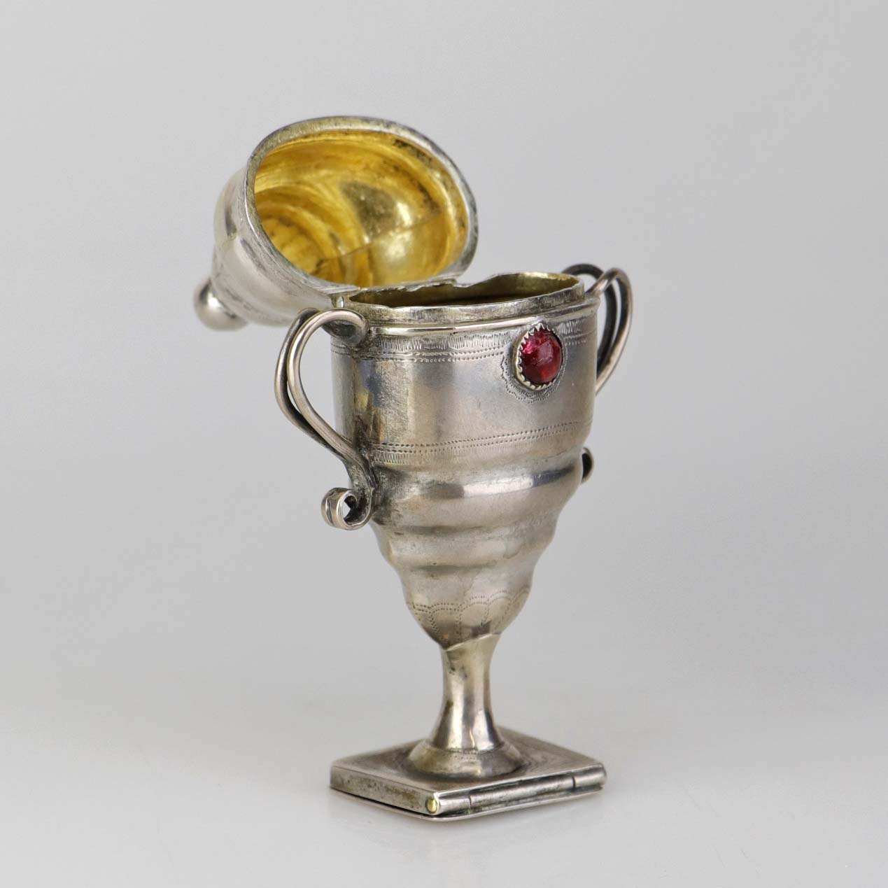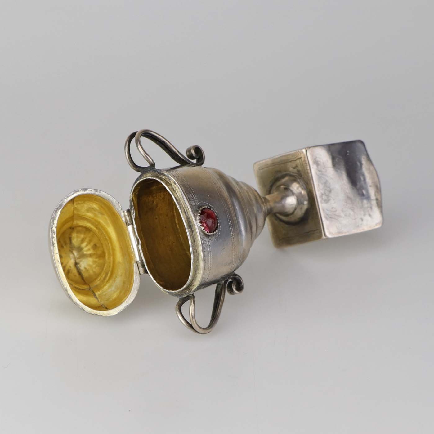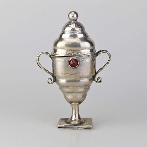 Hovedvandsæg i sølv pyntet med to røde sten og med ekstra rum under foden. Indgraveret monogram under bunden M KMD, Estrup 1831Producent ukendt Stempel spejlvendt ICR