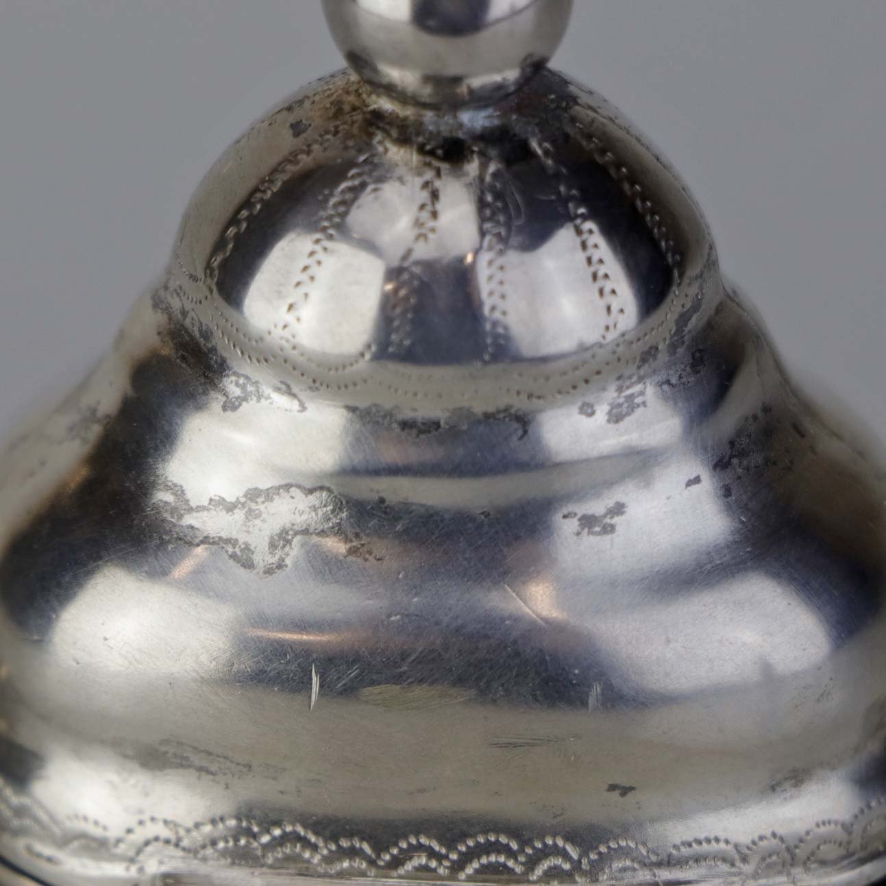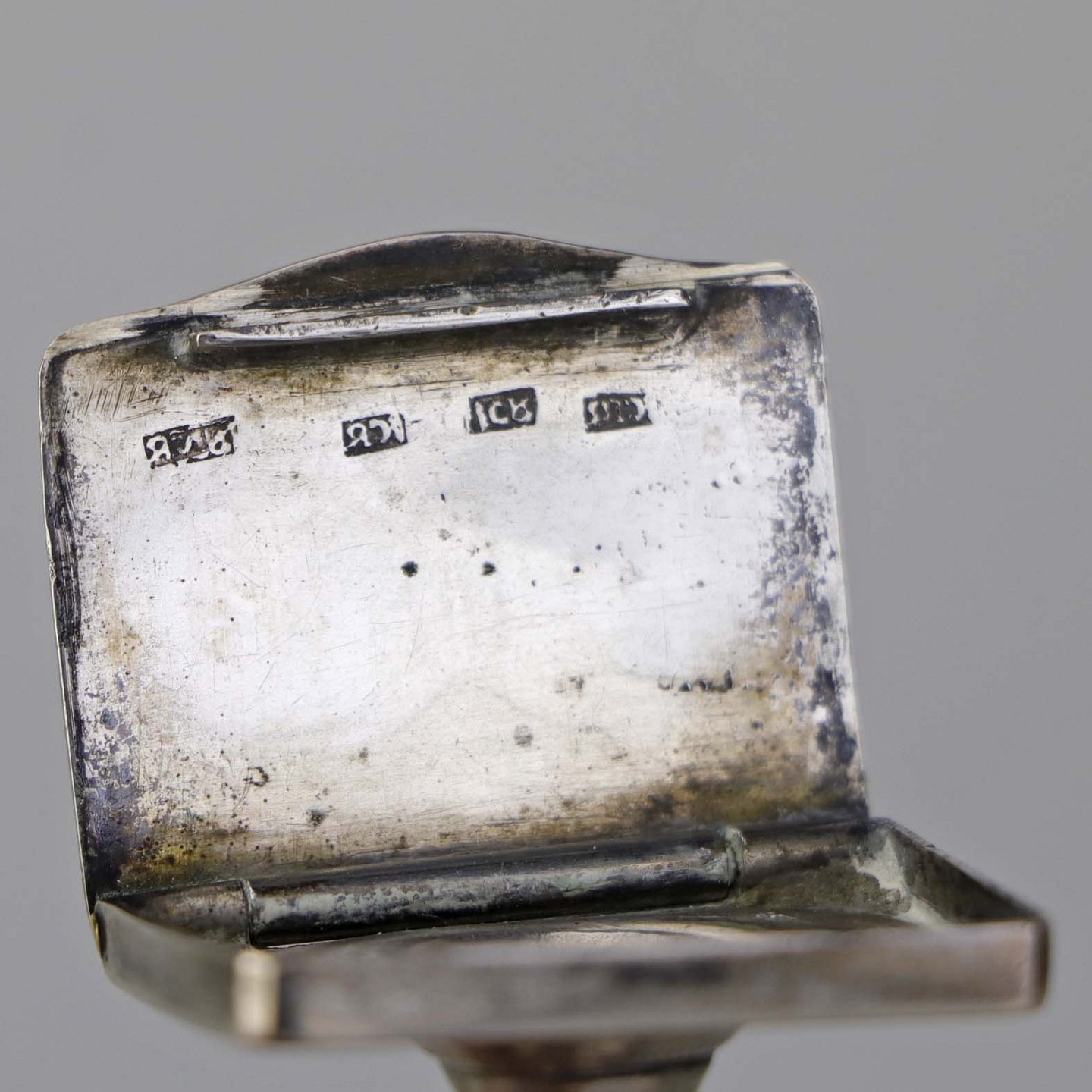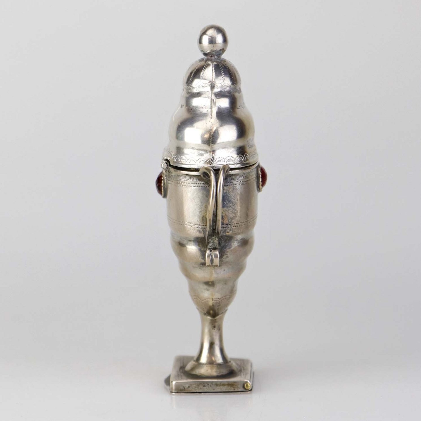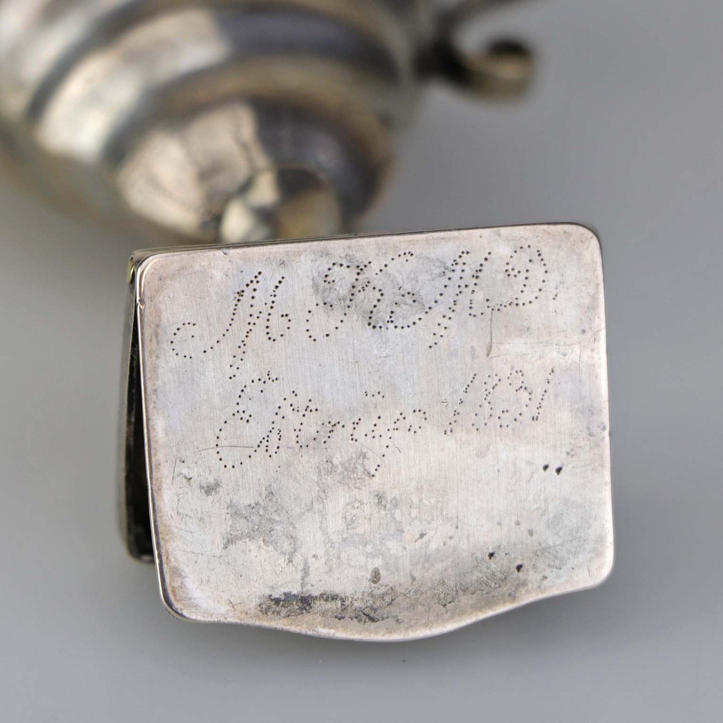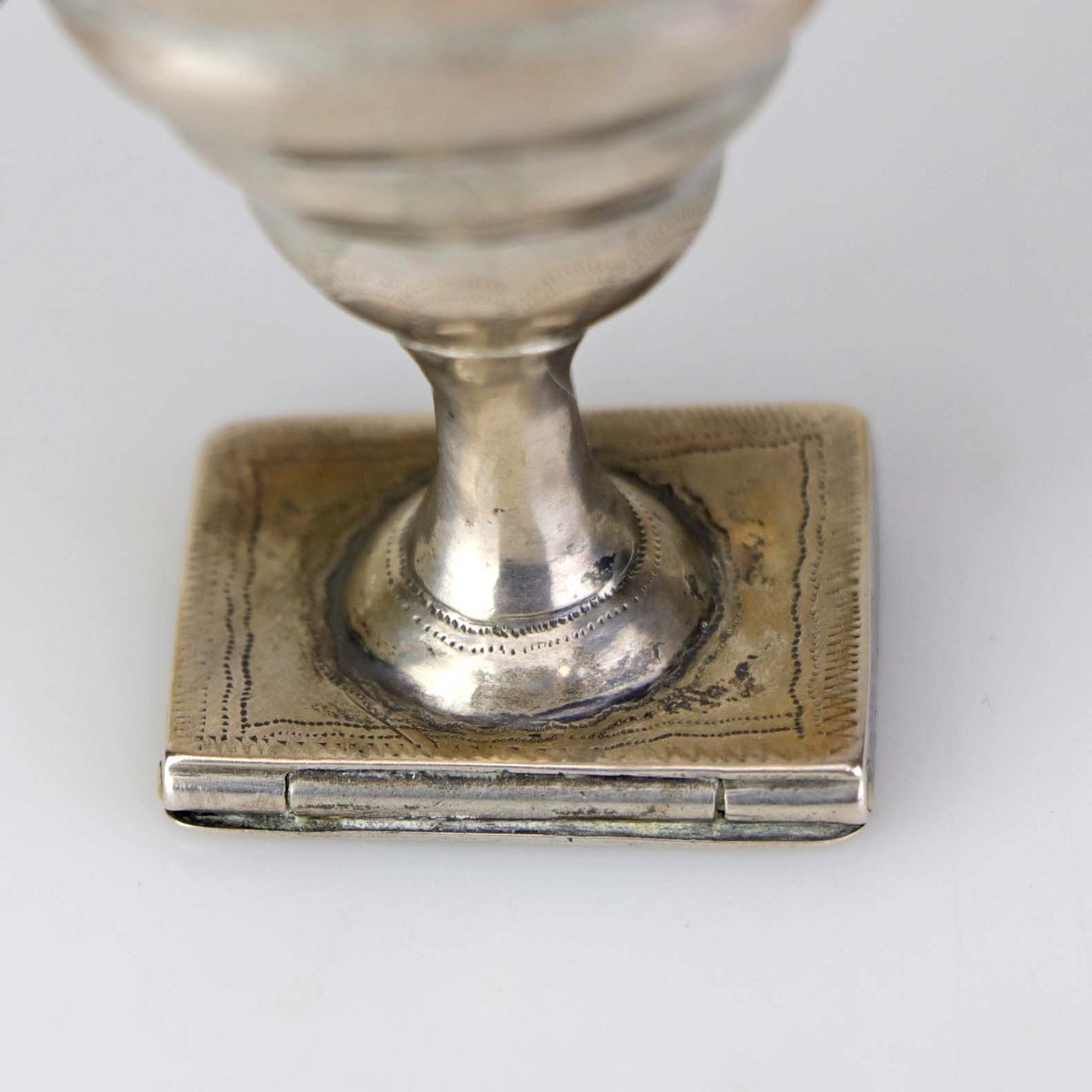 Hovedvandsæg i sølv pyntet med to røde sten og med ekstra rum under foden. Indgraveret monogram under bunden M KMD, Estrup 1831Producent ukendt Stempel spejlvendt ICR
