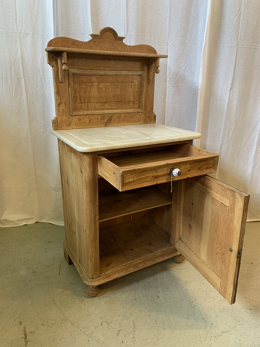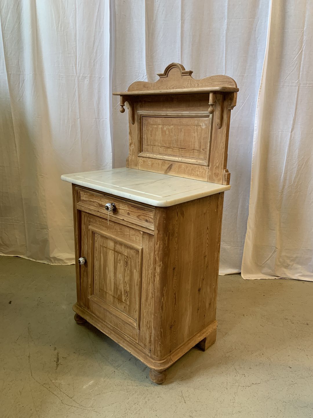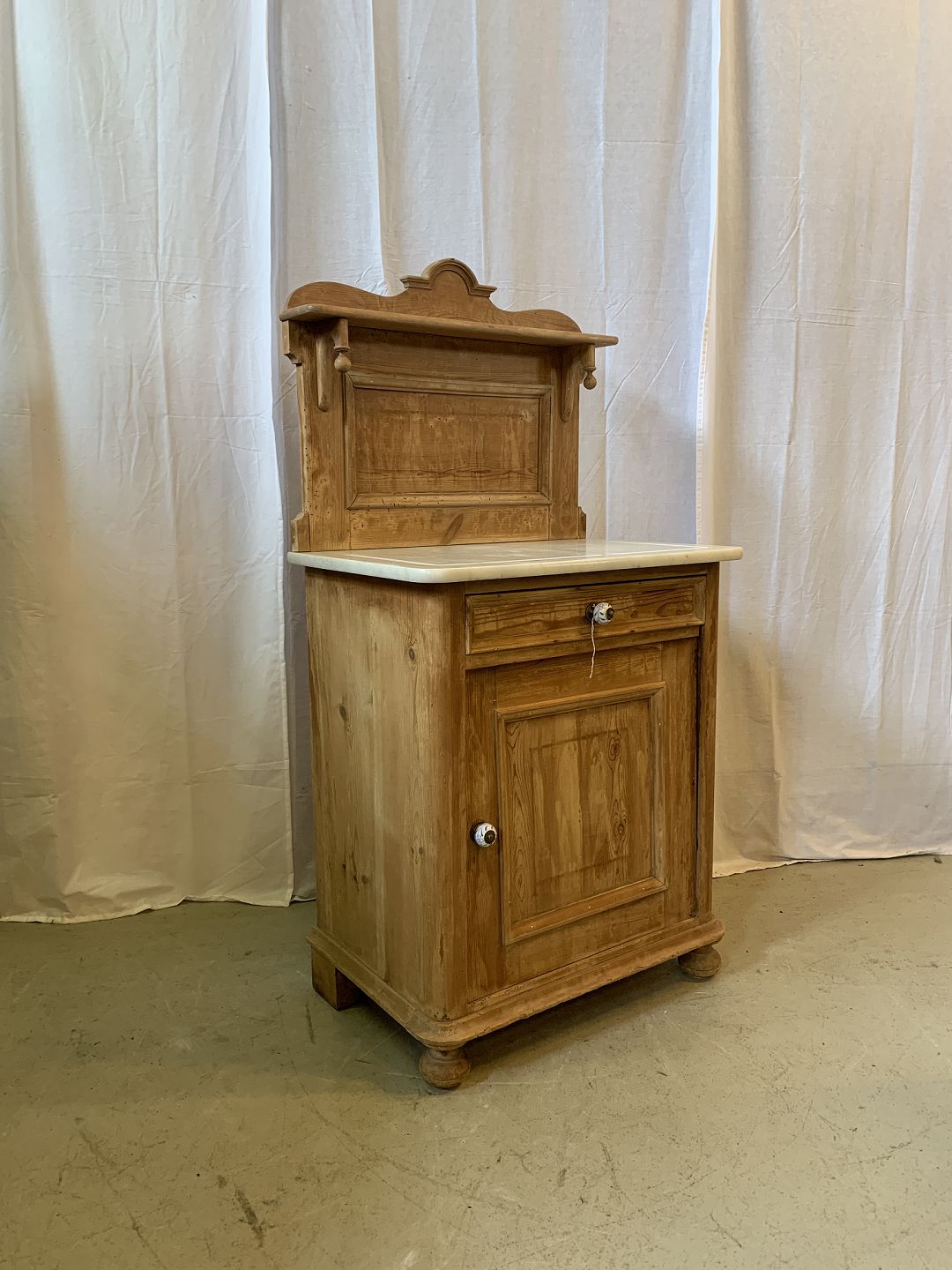 Servante i massivt fyrretræ med marmorplade, fra 1910erne.Den har brugsspor.
