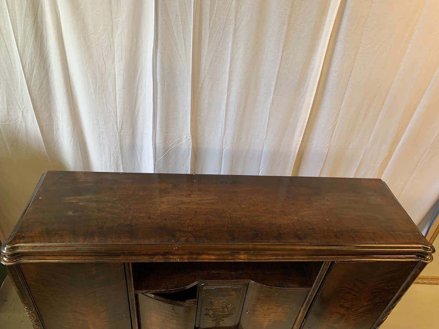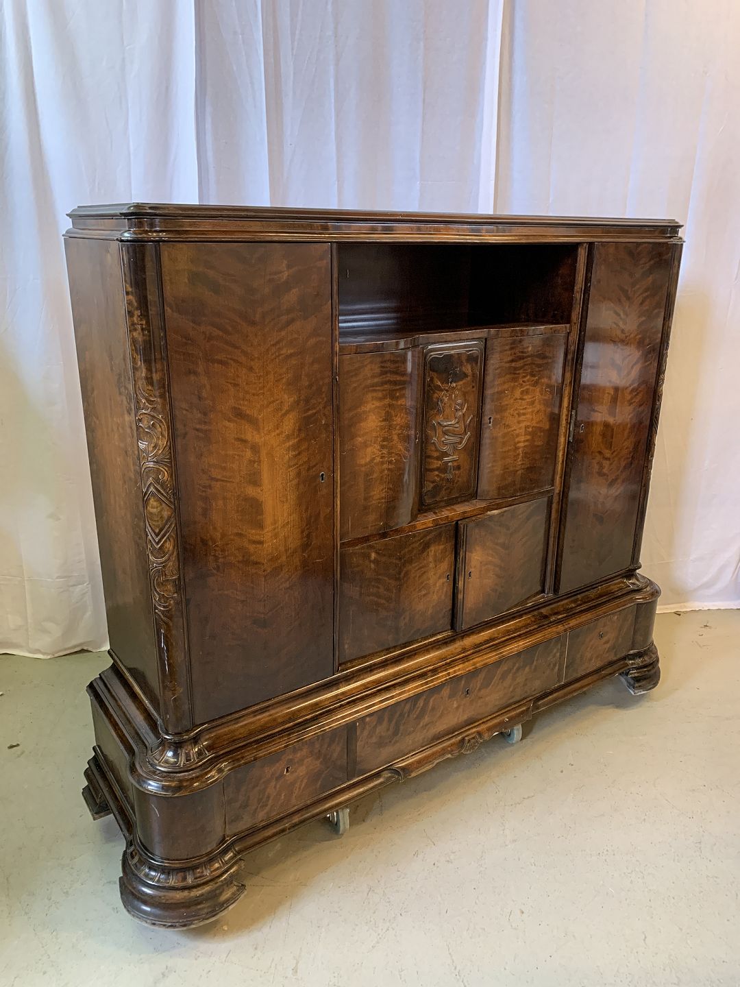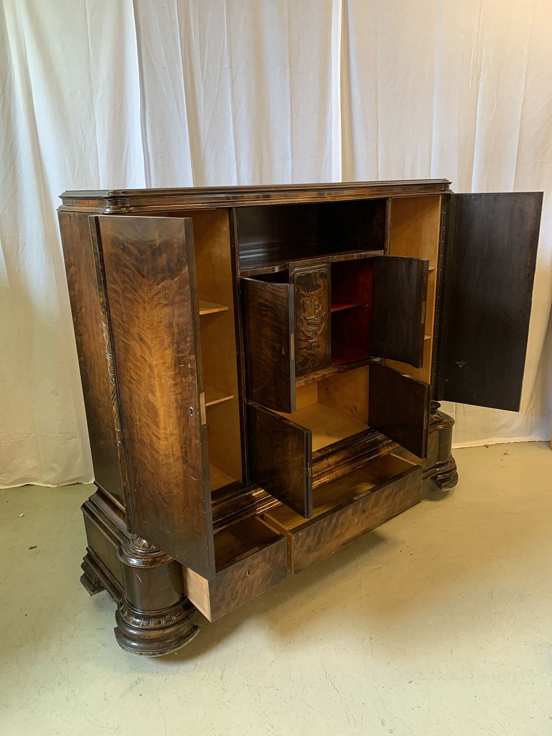 Dækketøjsskab i fineret birketræ, fra 1930erne.Det har brugsspor og defekter.