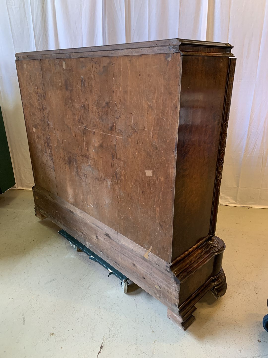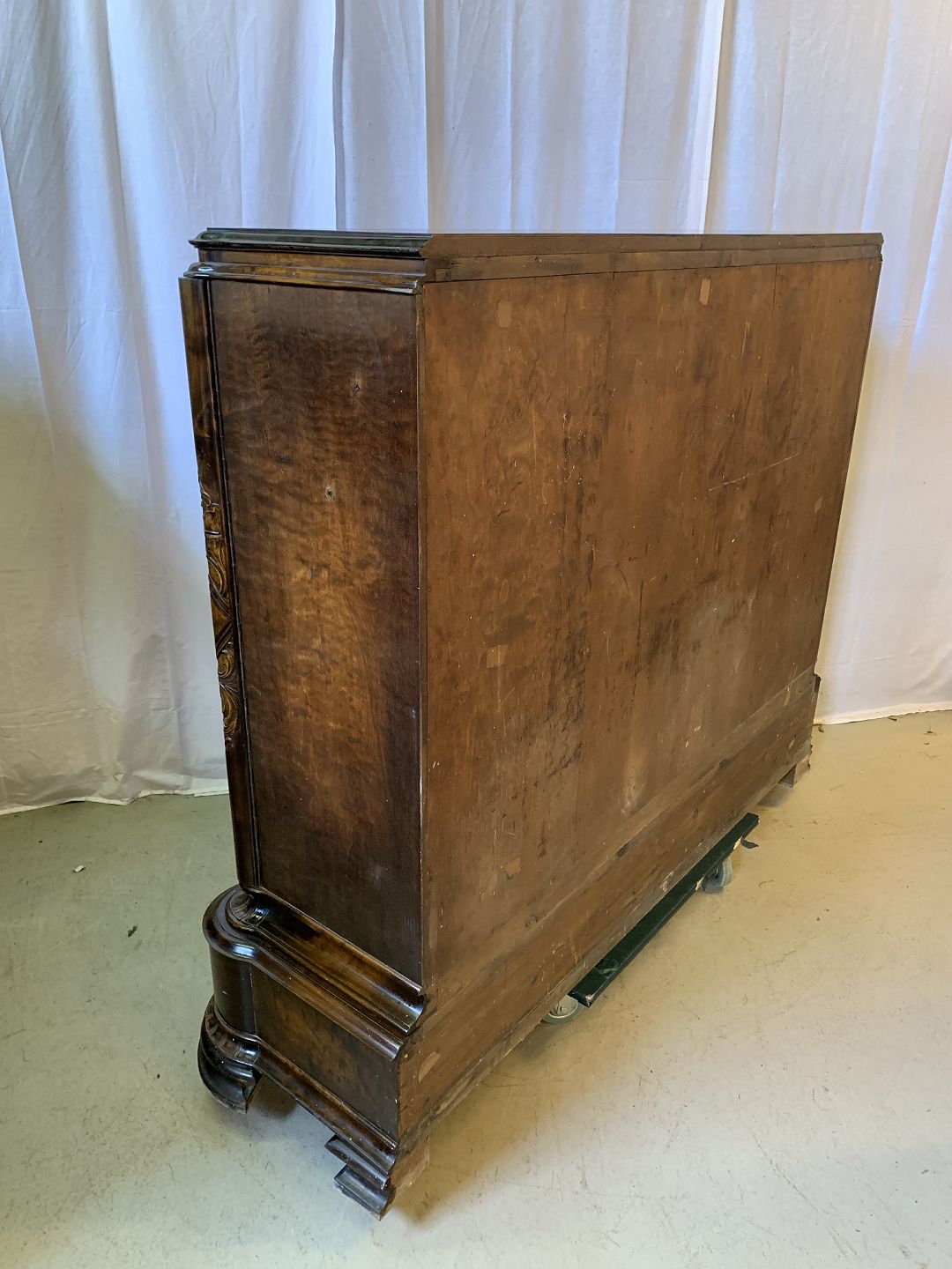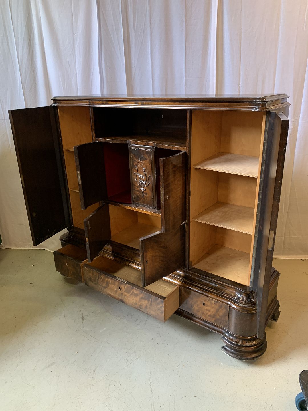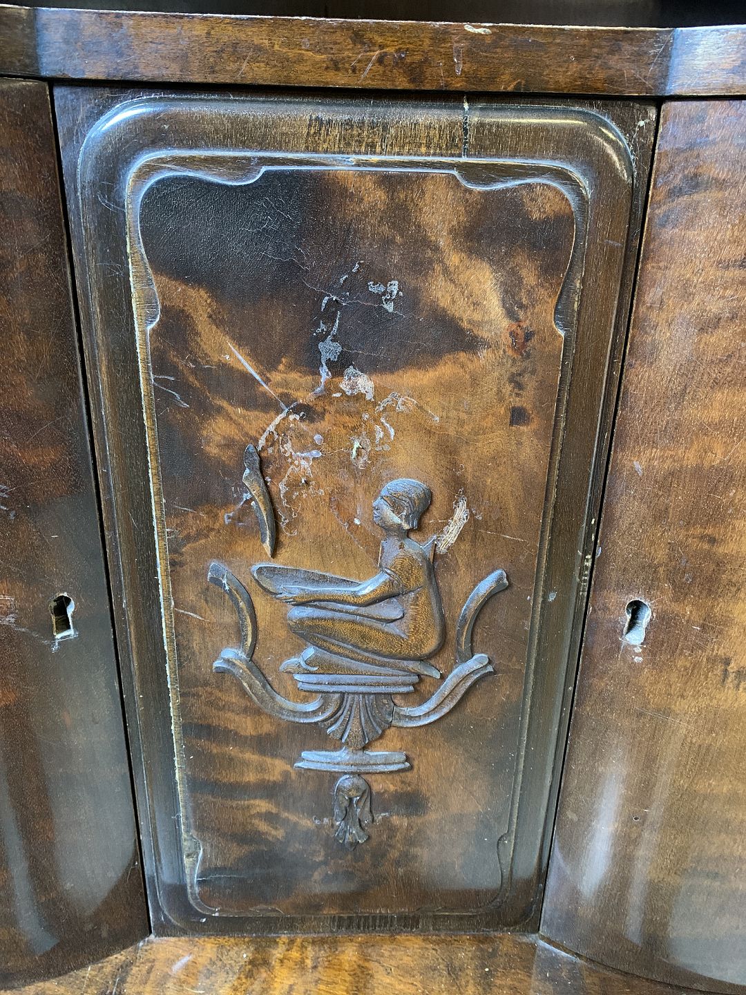 Dækketøjsskab i fineret birketræ, fra 1930erne.Det har brugsspor og defekter.