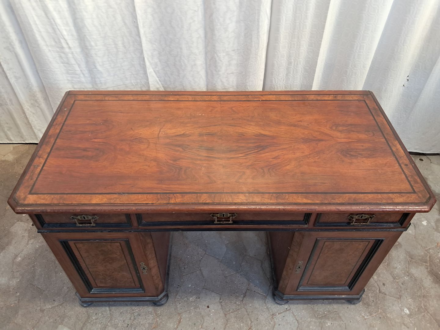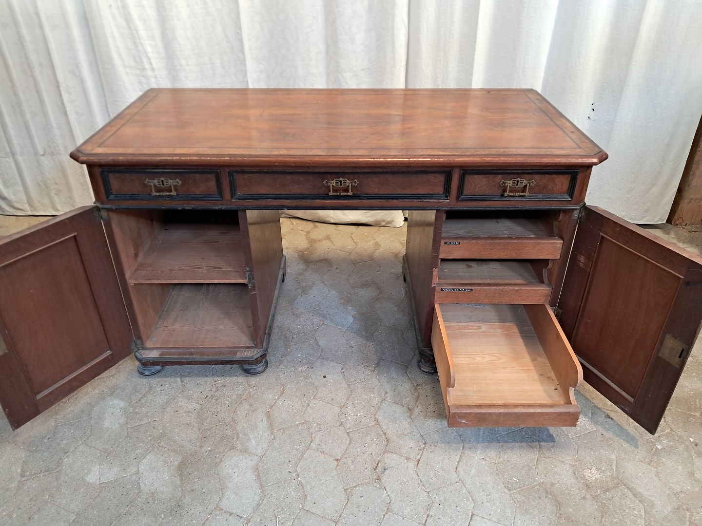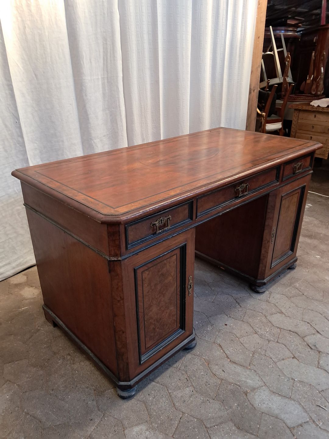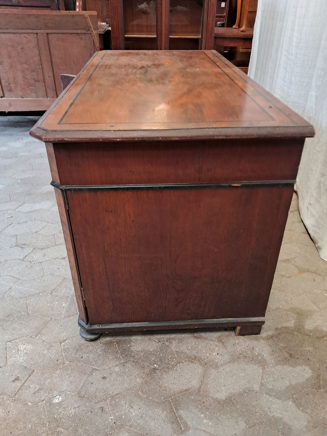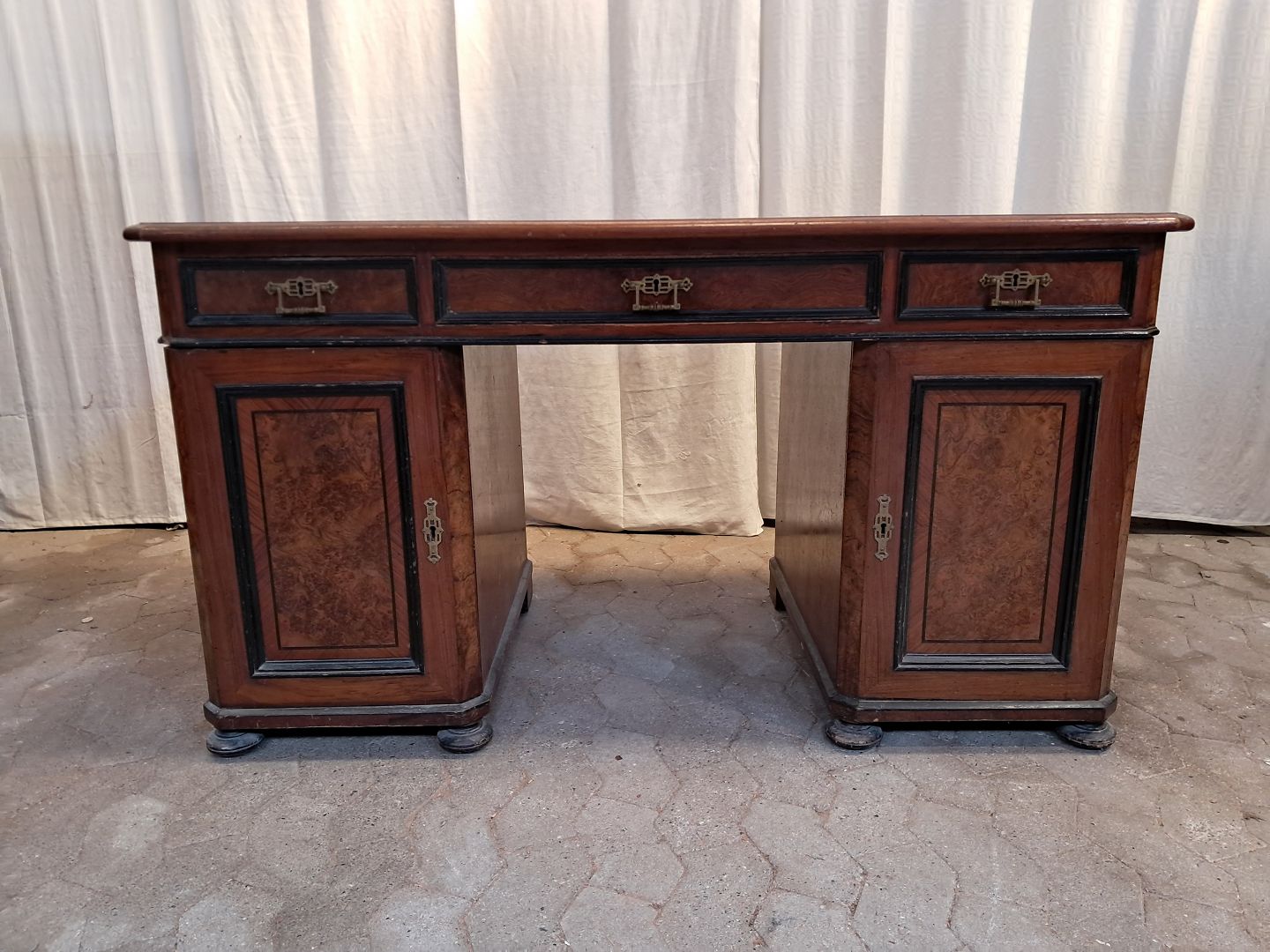 Skrivebord i fineret mahogni og rodtræ, fra 1900erne.Det har brugsspor og mangler en hjørneliste. (se foto)