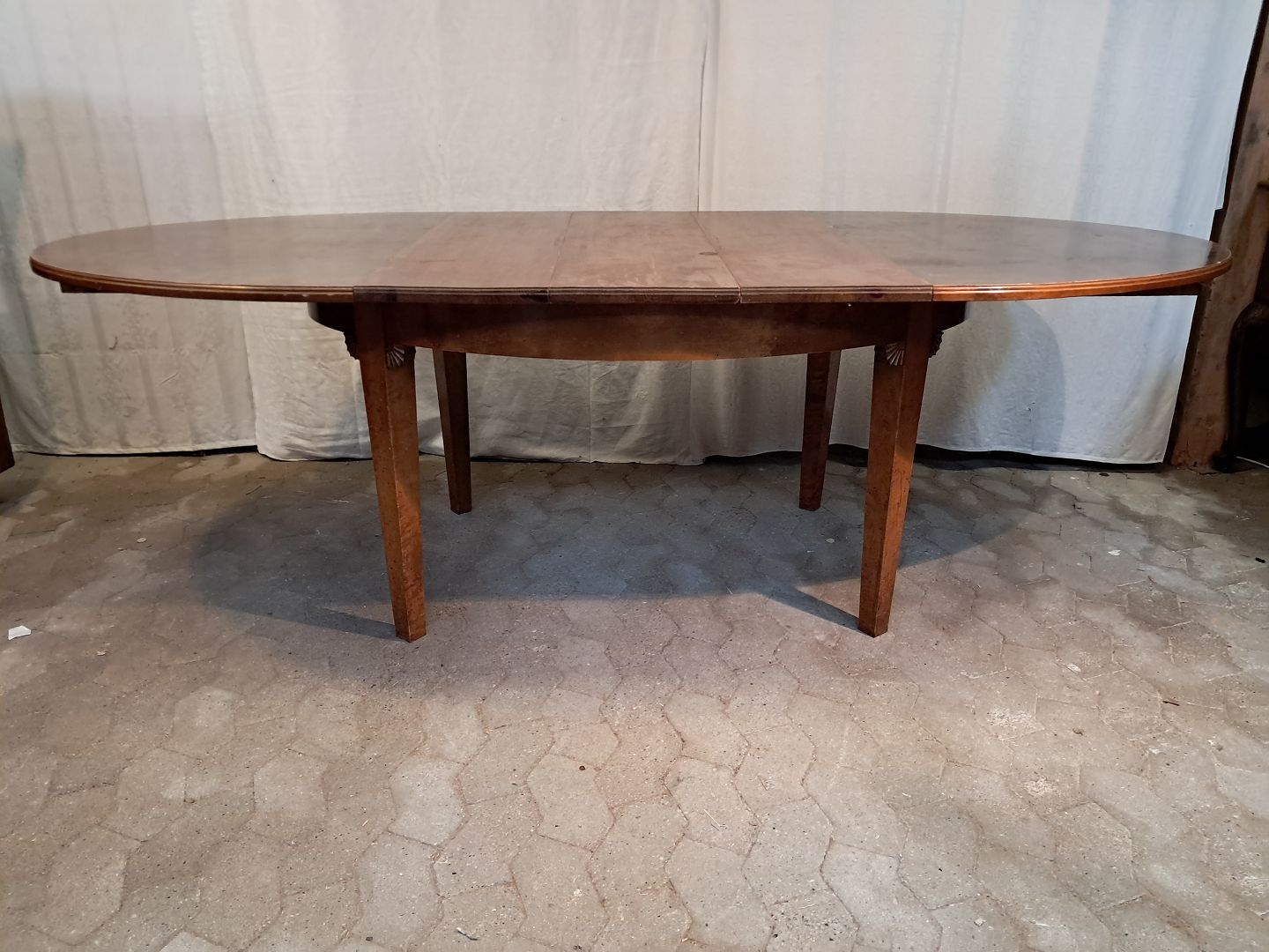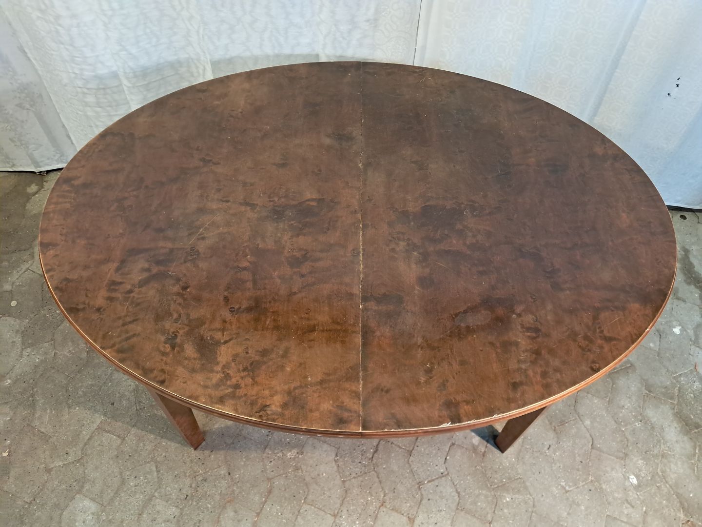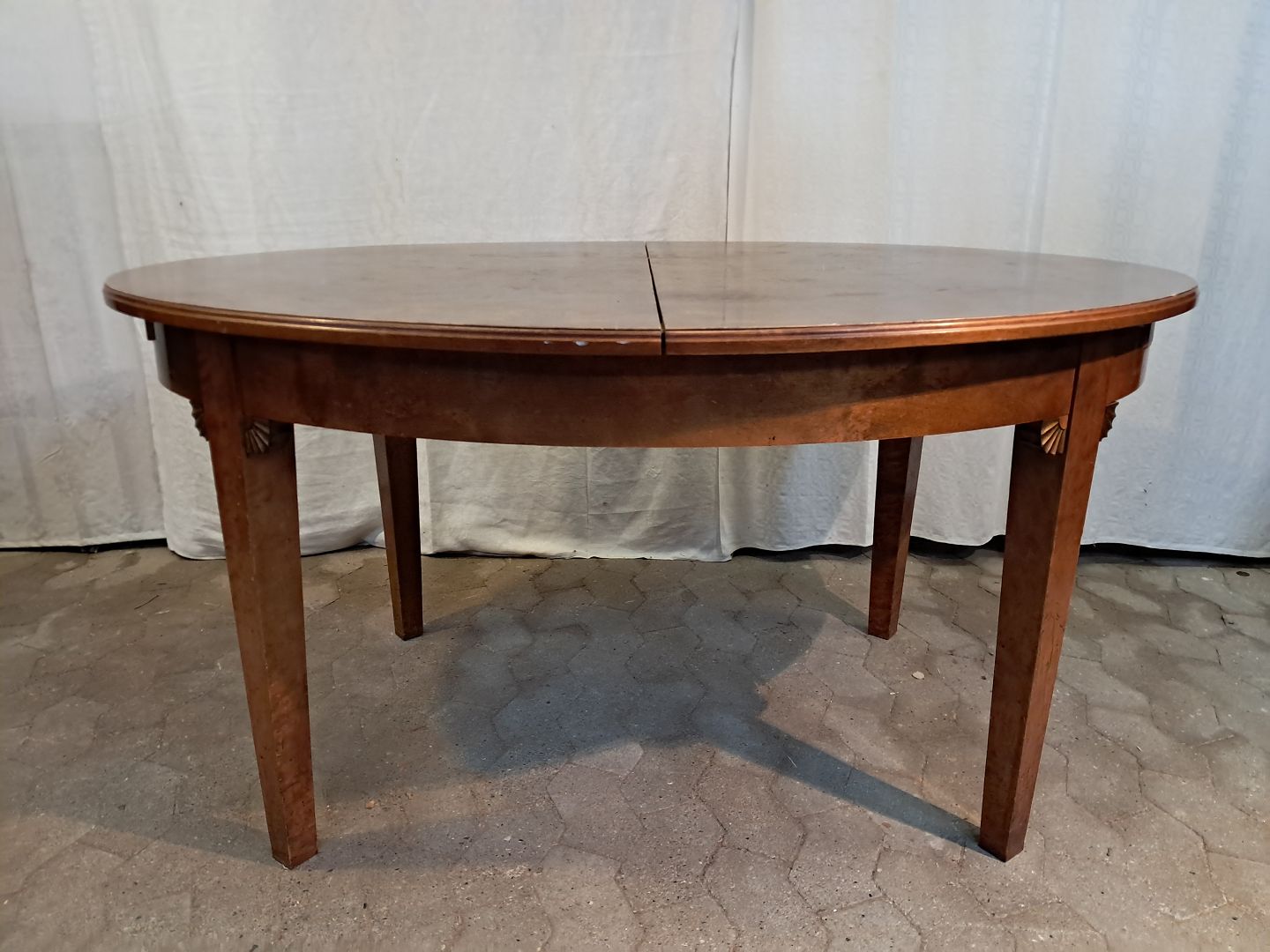 Spisebord i fineret birketræ med 3 tillægsplader, fra 1920erne.Det har brugsspor.